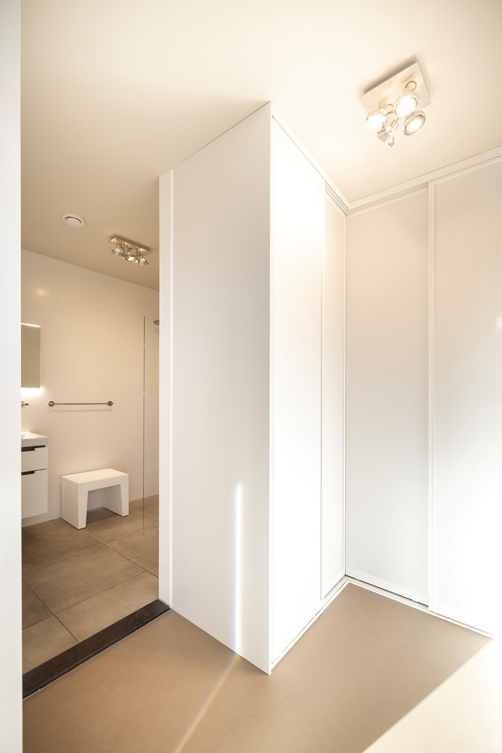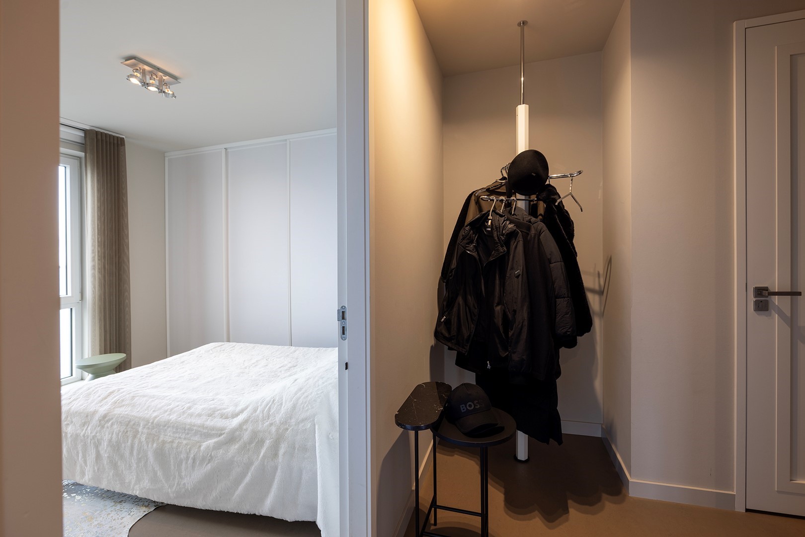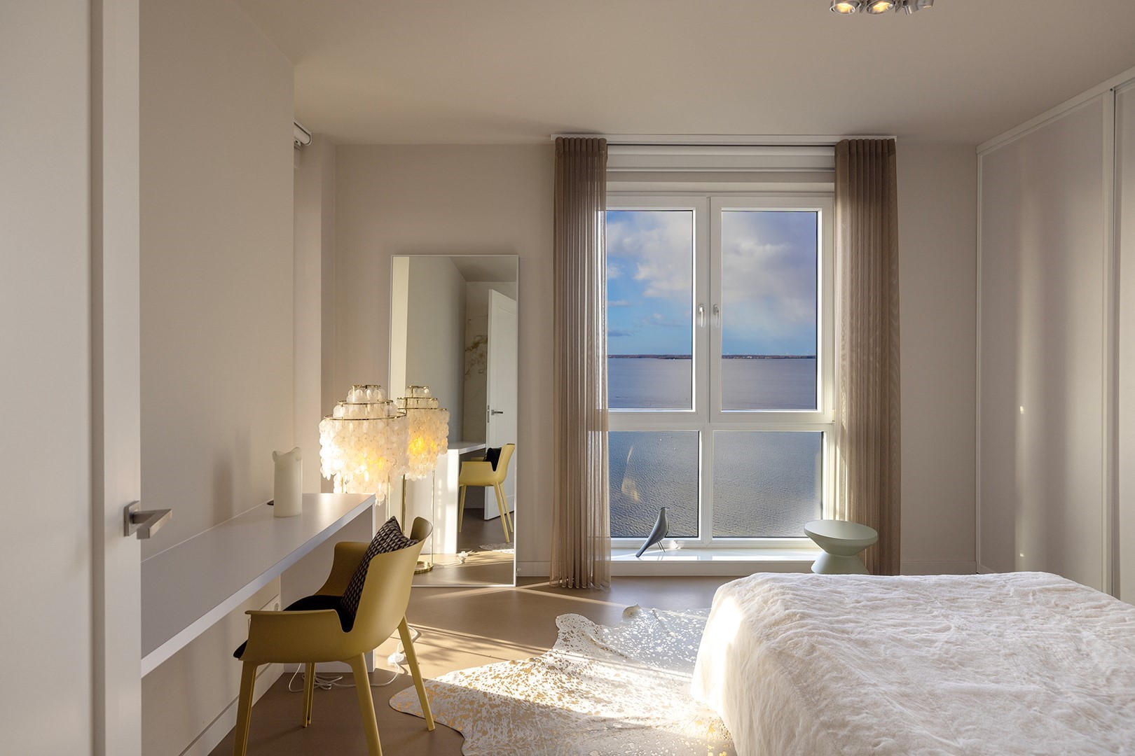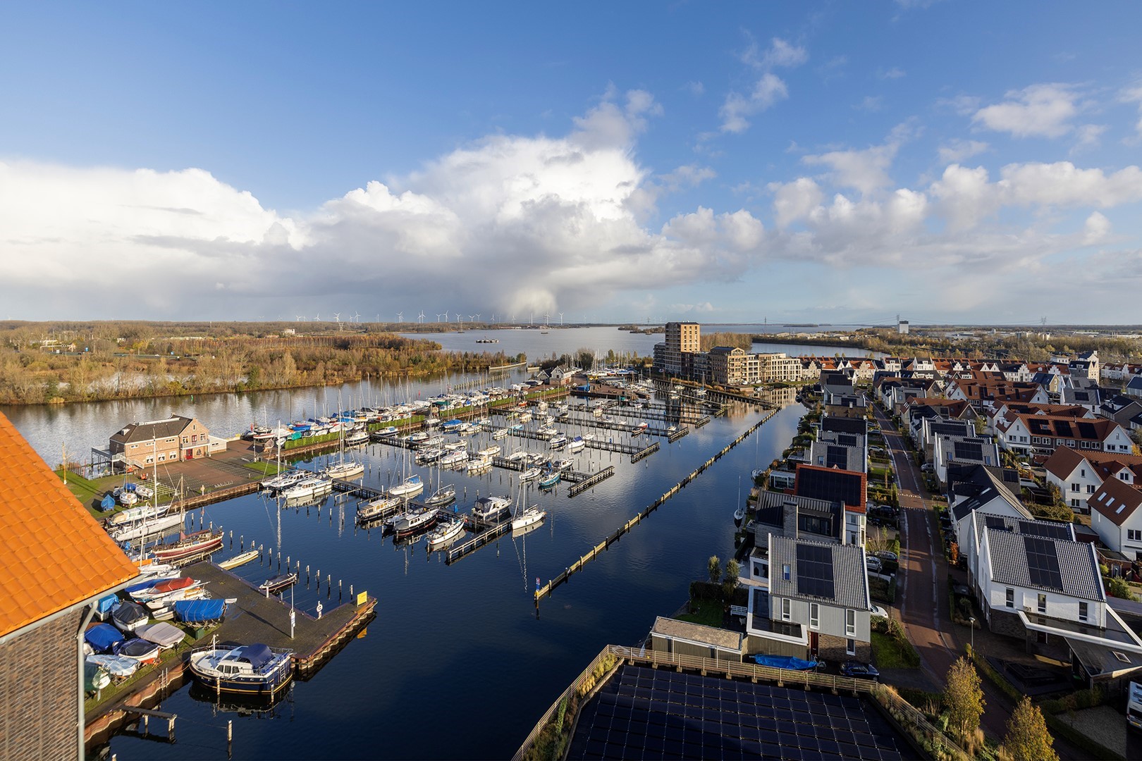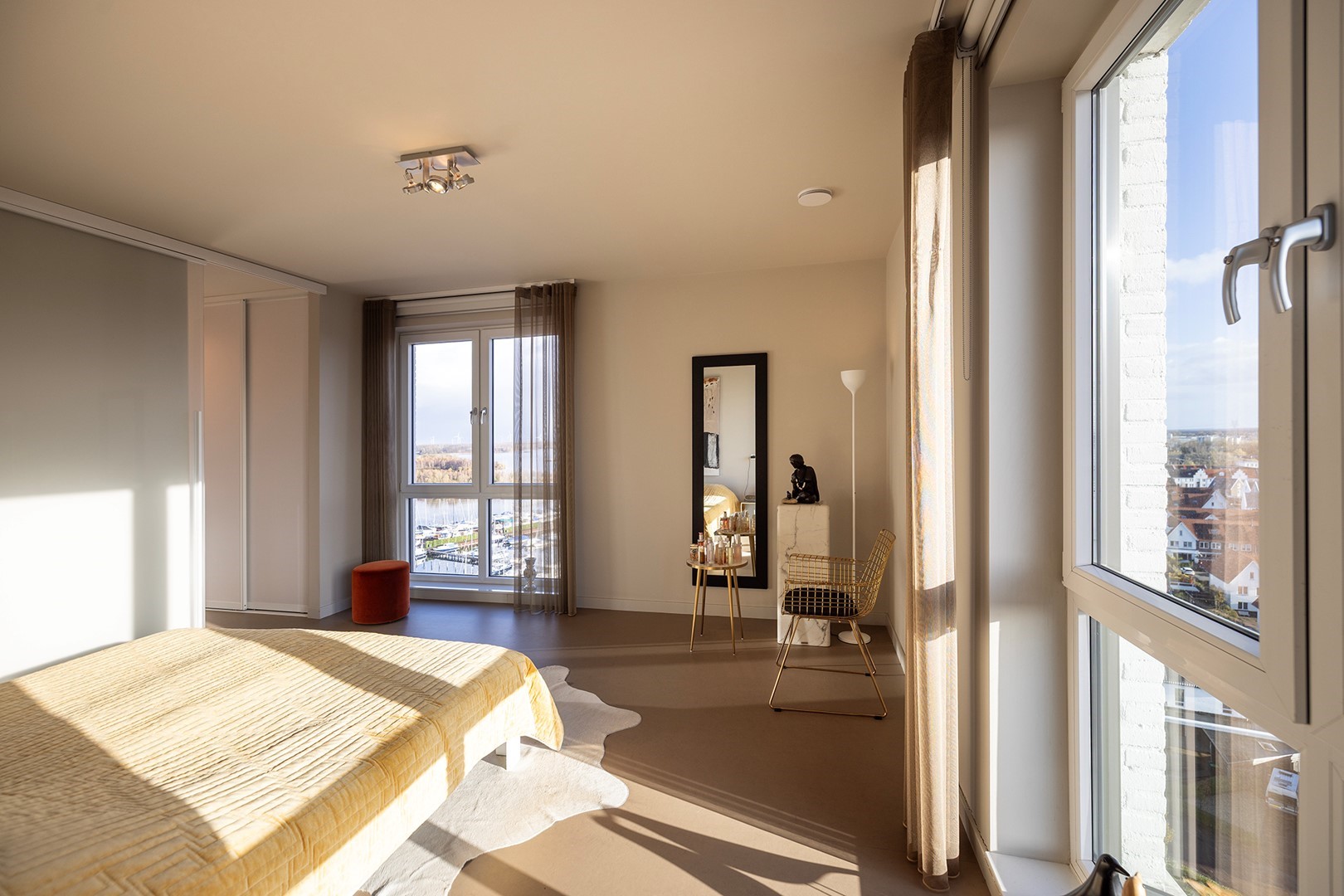 De naastgelegen masterbedroom is royaal bemeten en biedt uitzicht op de jachthaven. Aangrenzend bevindt zich een ruime inloopkast, afgescheiden van de slaapkamer middels een stijlvolle glazen deur. De en suite badkamer is voorzien van een inloopdouche, toilet en wastafelmeubel.