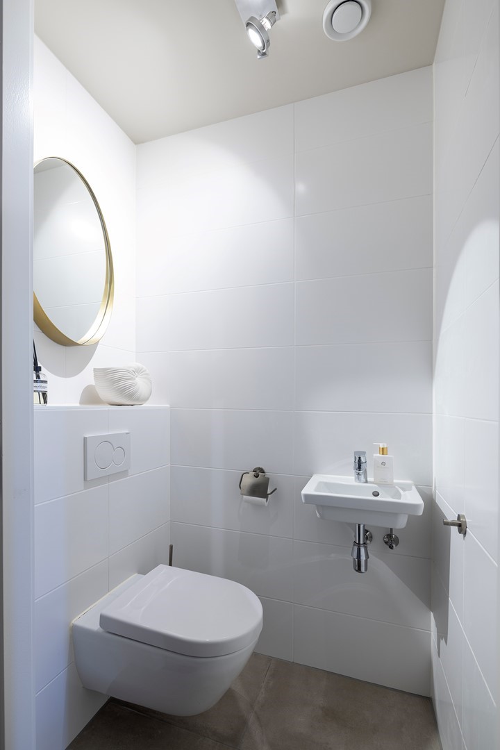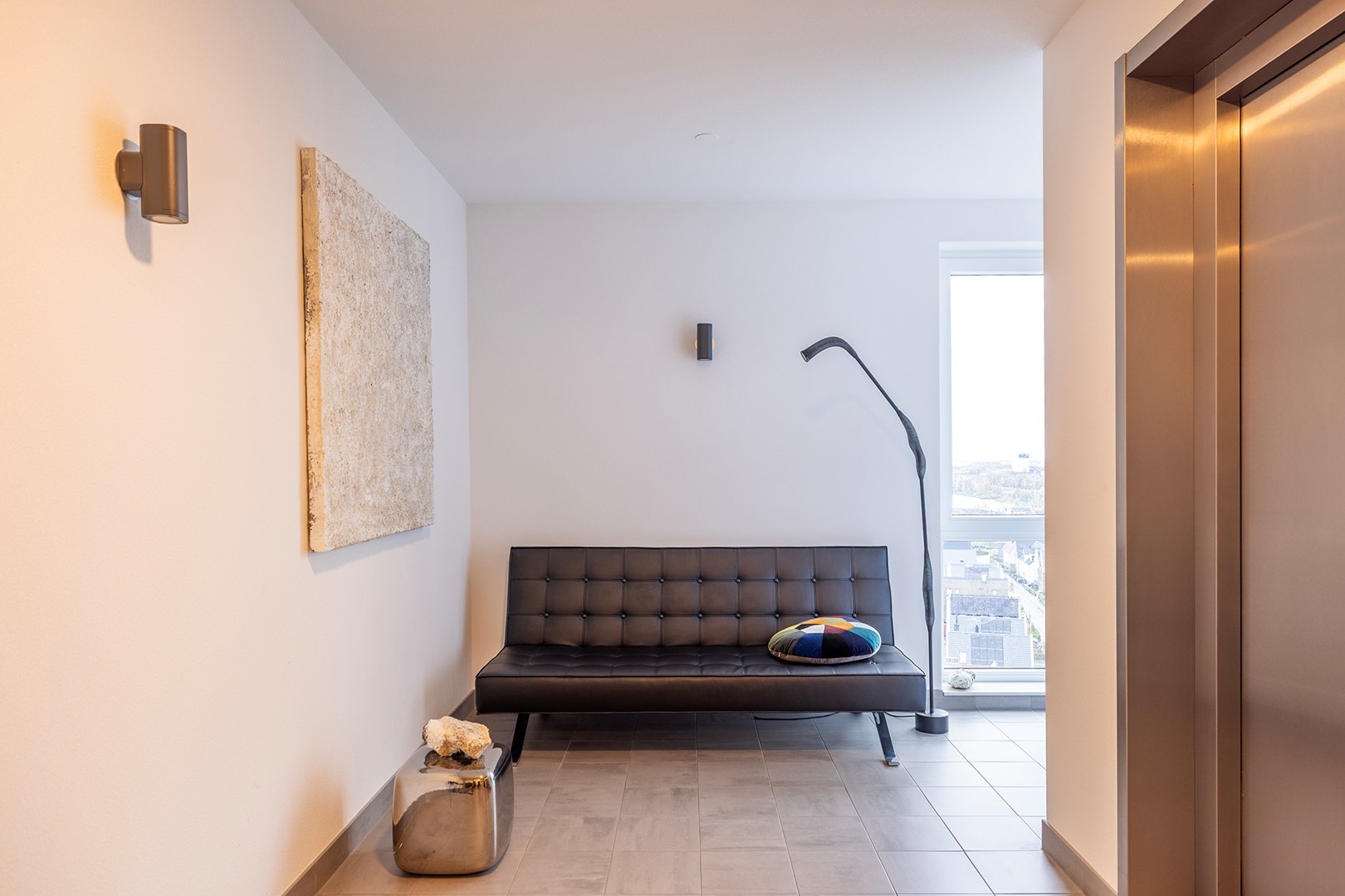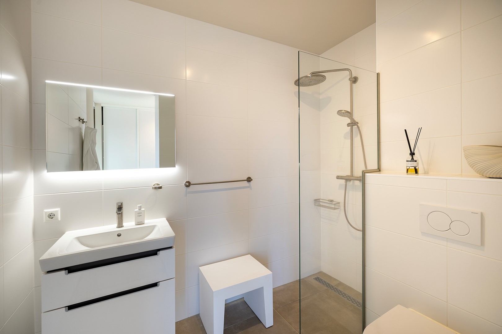 De indeling begint met het aankomen op uw eigen etage per lift. U stapt binnen in een ruime hal, met directe toegang tot een royale badkamer voorzien van een inloopdouche, een dubbel wastafelmeubel en een toilet. Daarnaast bevindt zich een separaat toilet in de hal, ideaal voor uw gasten.