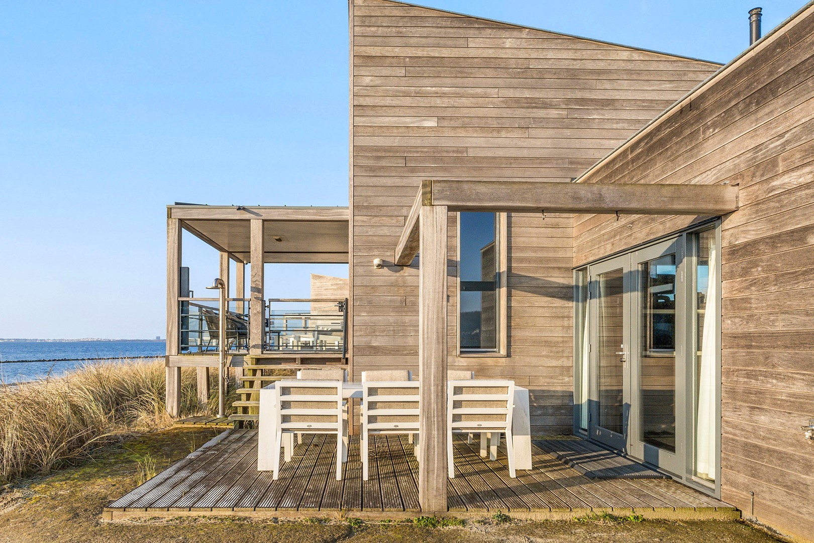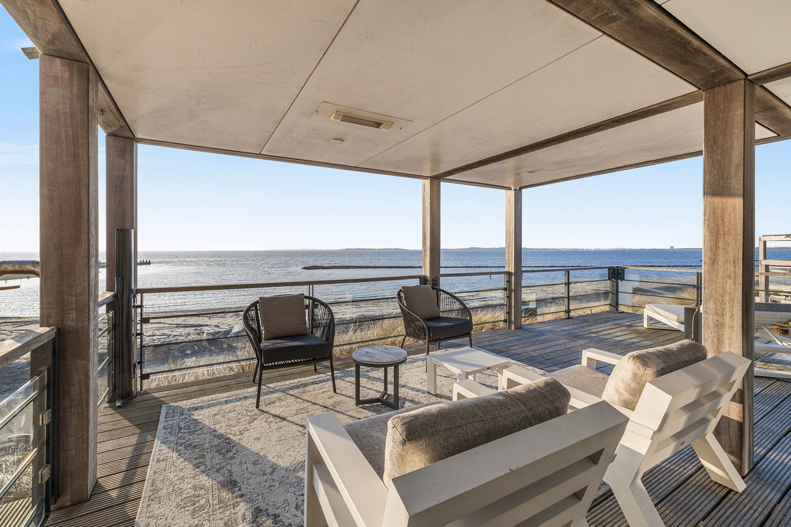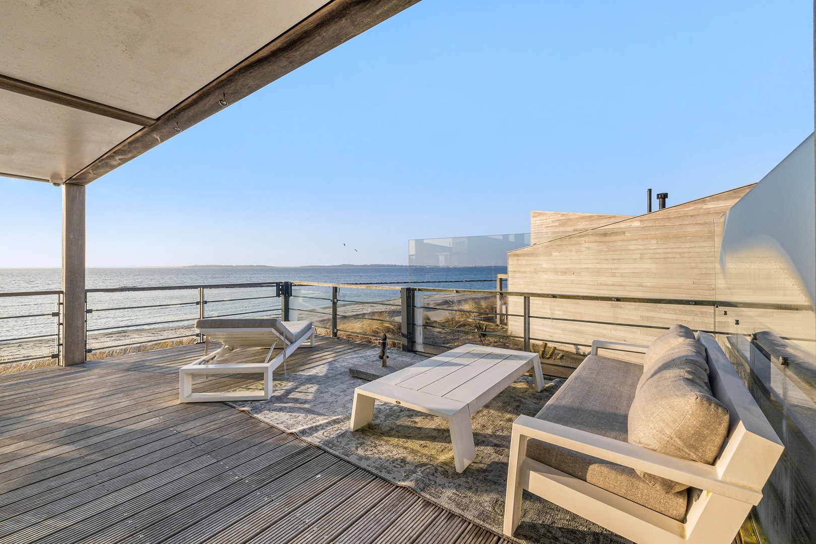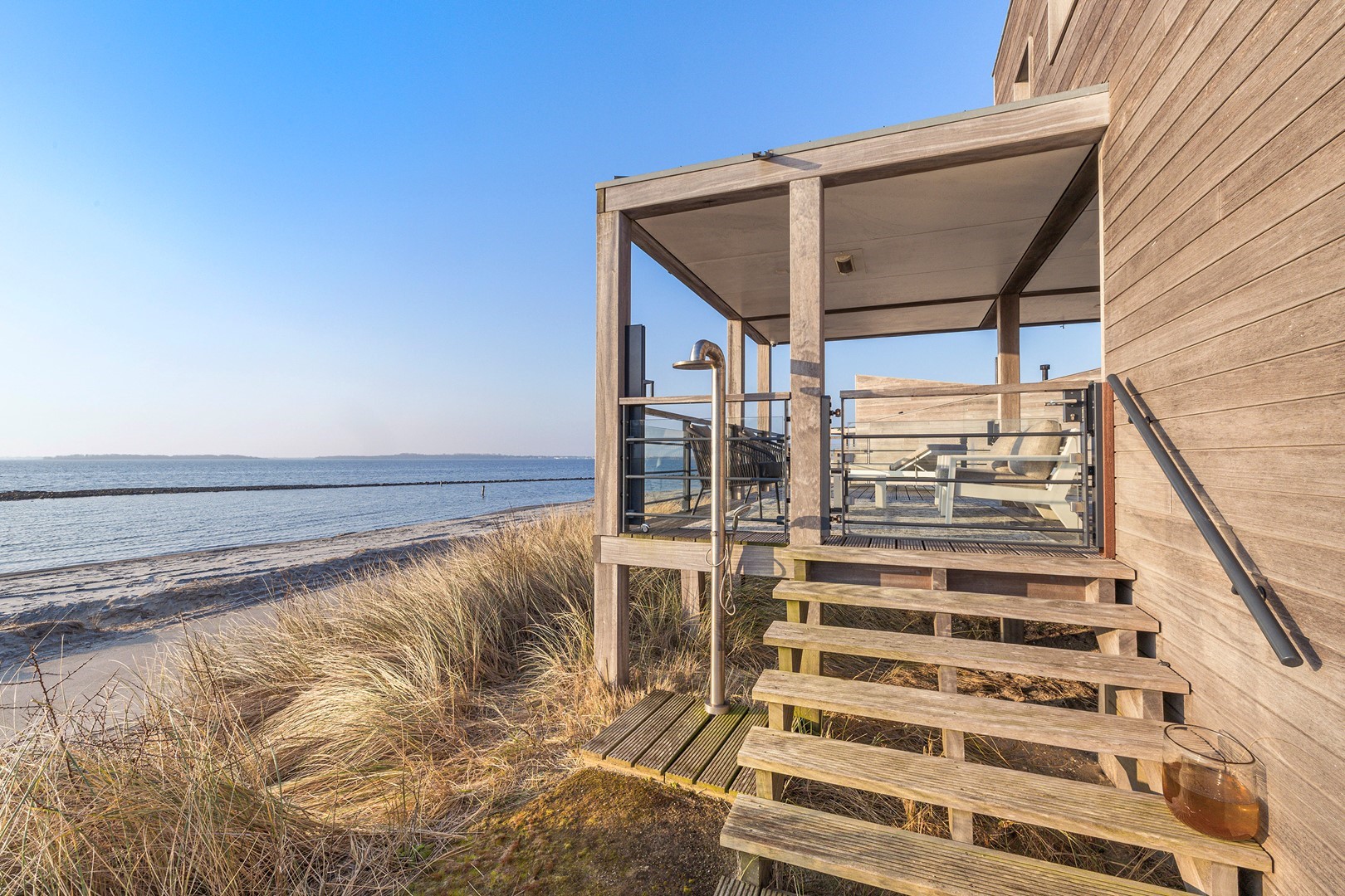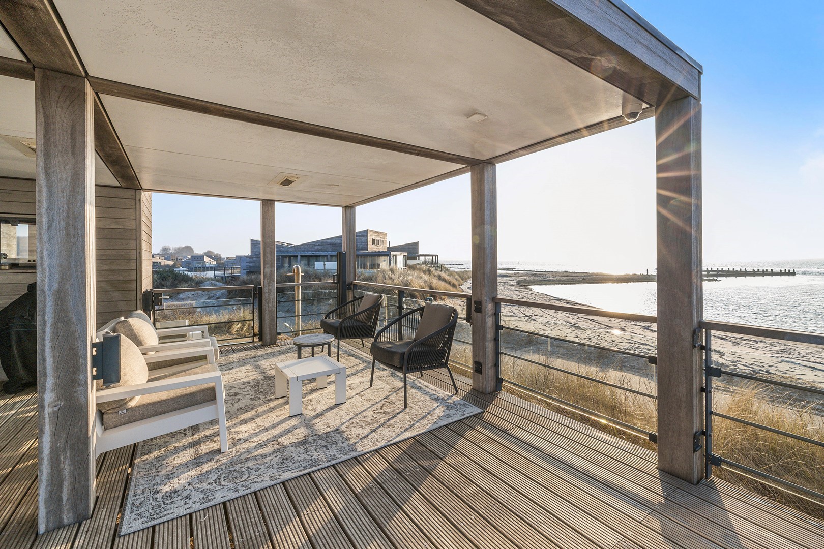 Aan meerdere zijdes van de strandvilla vind je mooie, ruime hardhouten terrassen. Gedeeltelijk afgeschermd middels glas. Het royale terras is een enorm pluspunt aan de woning, waar je de gehele dag kunt genieten van de zon en van het prachtige uitzicht. Er zijn twee geïntegreerde terrasheaters welke het tot ’s avonds laat buiten zitten nog aangenamer maken en er is een buitendouche aanwezig. Aan de achterzijde bevindt zich een ruime berging waar de meterkast en installaties bevinden. Hier is voldoende ruimte over voor bijvoorbeeld surfspullen en fietsen. Daarnaast is er een royale bergruimte onder de villa aanwezig van ca. 38 m² (hoogte ca. 150 cm). De villa is nooit verhuurd geweest en is verder voorzien van beveiligingscamera’s en een alarminstallatie.