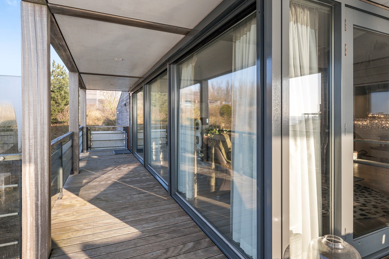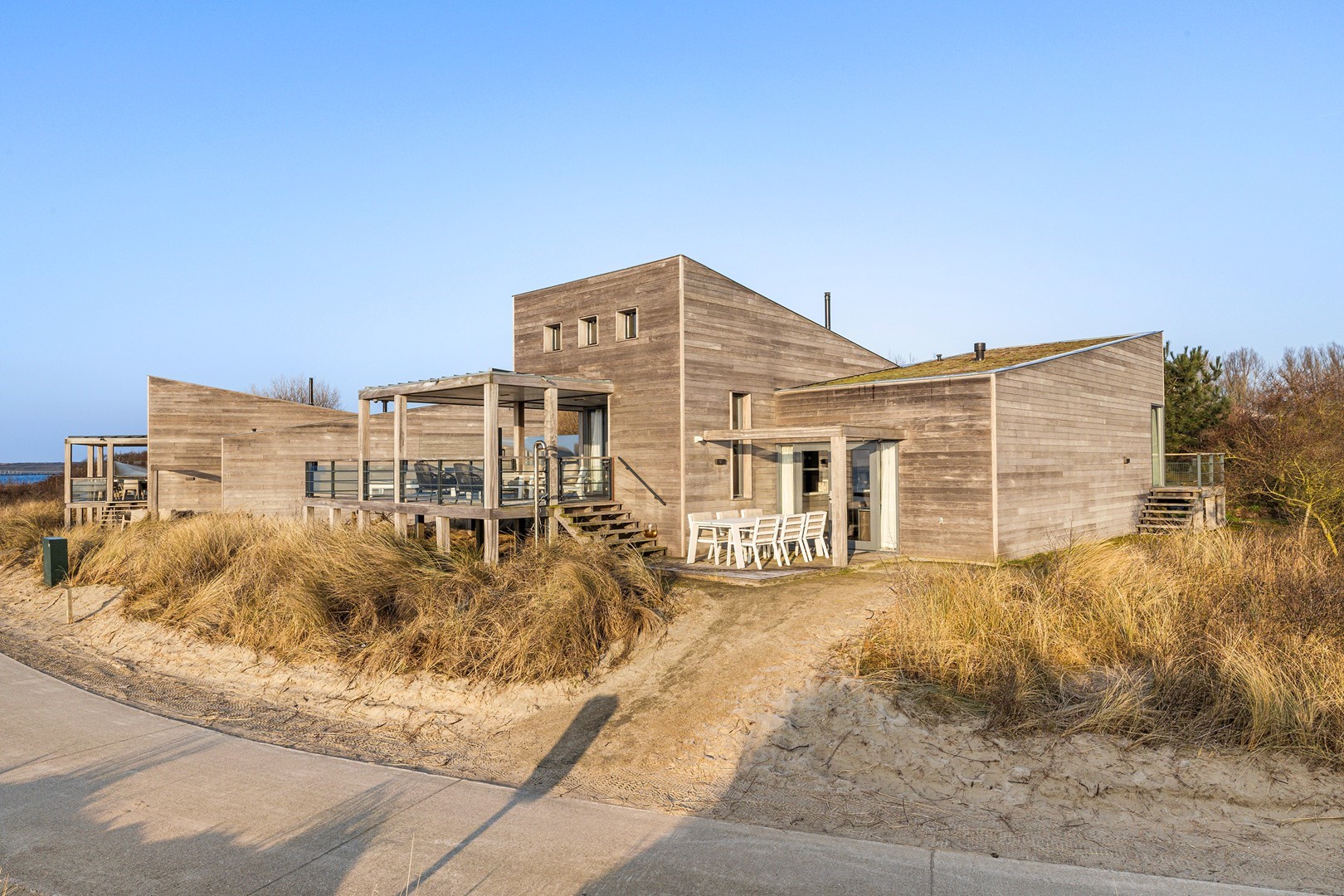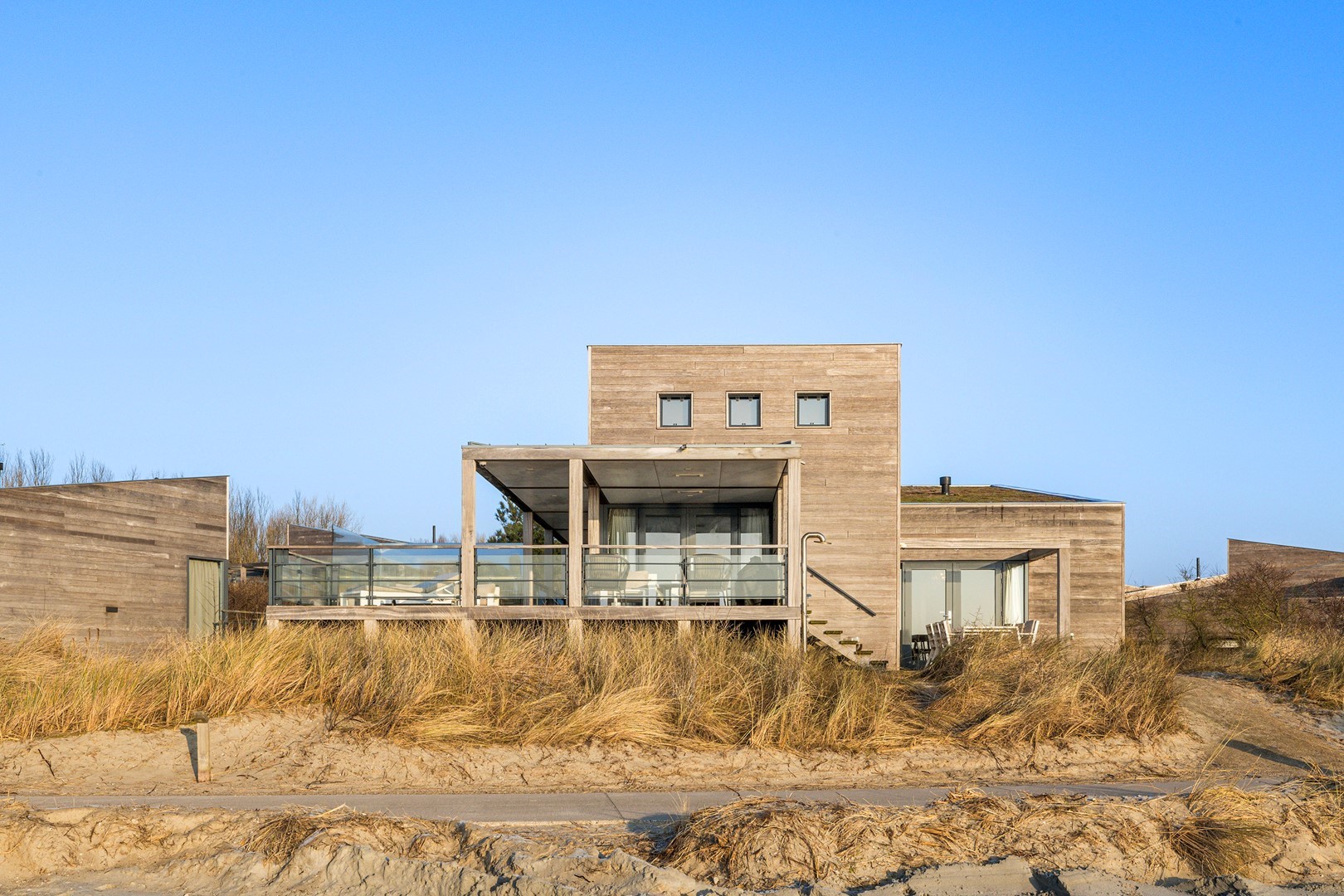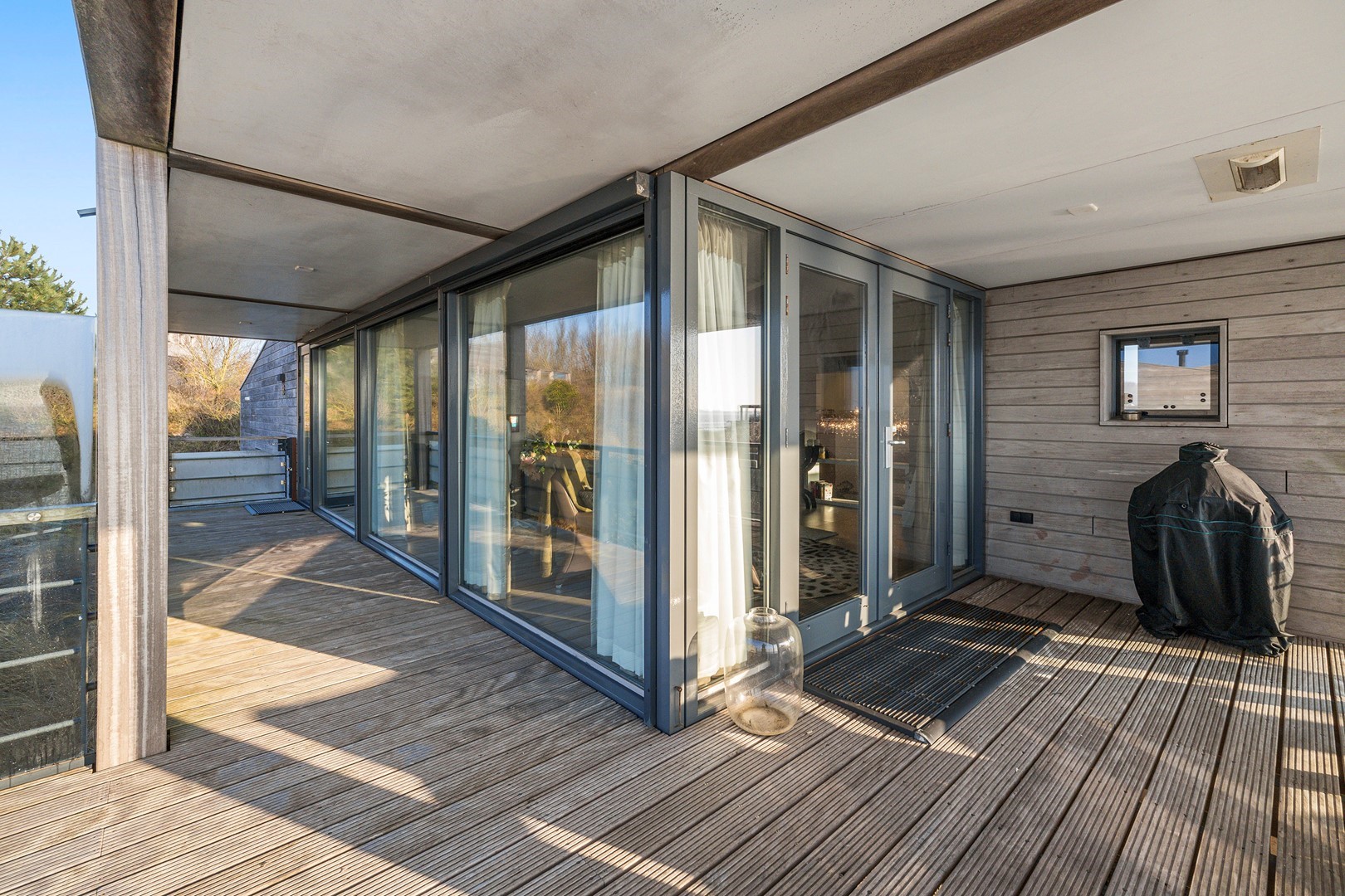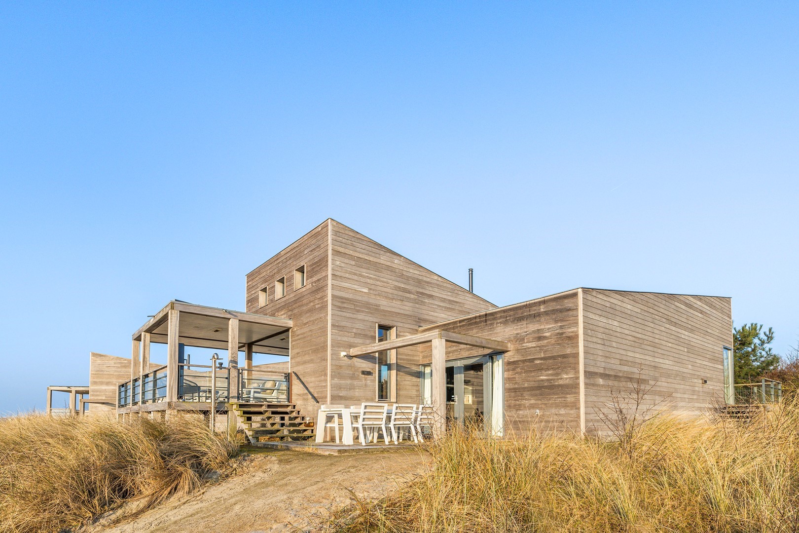 Aan meerdere zijdes van de strandvilla vind je mooie, ruime hardhouten terrassen. Gedeeltelijk afgeschermd middels glas. Het royale terras is een enorm pluspunt aan de woning, waar je de gehele dag kunt genieten van de zon en van het prachtige uitzicht. Er zijn twee geïntegreerde terrasheaters welke het tot ’s avonds laat buiten zitten nog aangenamer maken en er is een buitendouche aanwezig. Aan de achterzijde bevindt zich een ruime berging waar de meterkast en installaties bevinden. Hier is voldoende ruimte over voor bijvoorbeeld surfspullen en fietsen. Daarnaast is er een royale bergruimte onder de villa aanwezig van ca. 38 m² (hoogte ca. 150 cm). De villa is nooit verhuurd geweest en is verder voorzien van beveiligingscamera’s en een alarminstallatie.