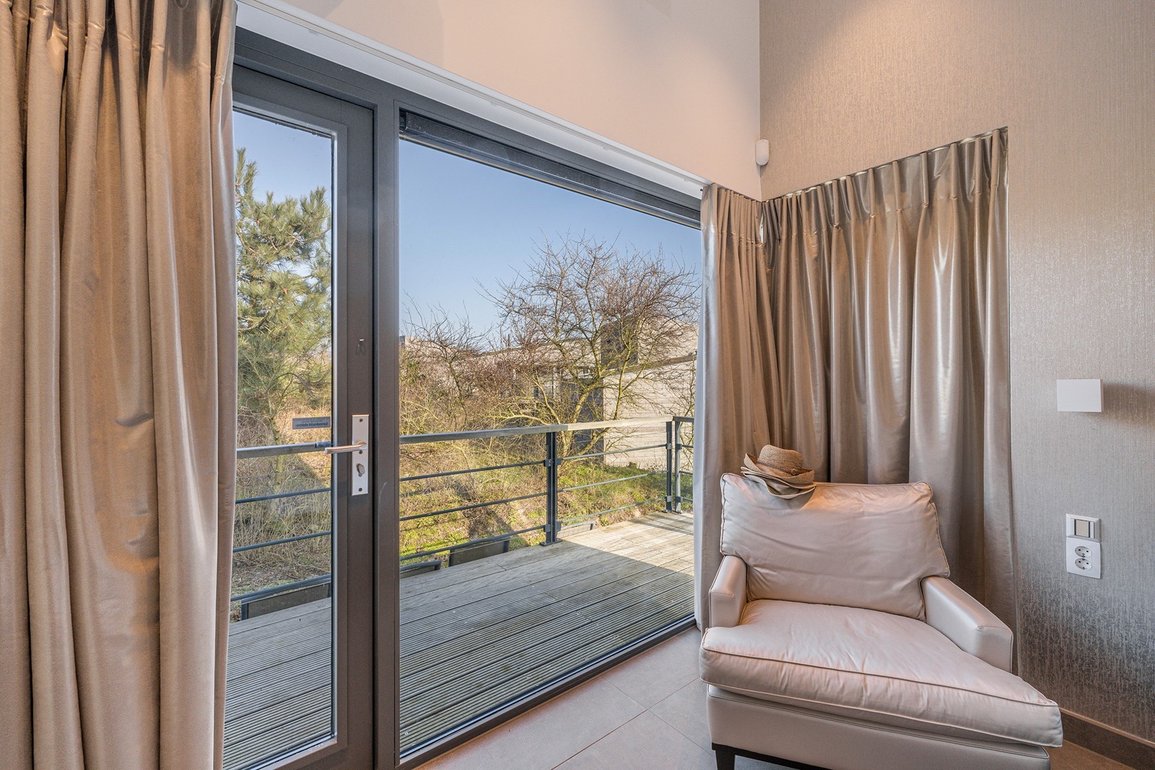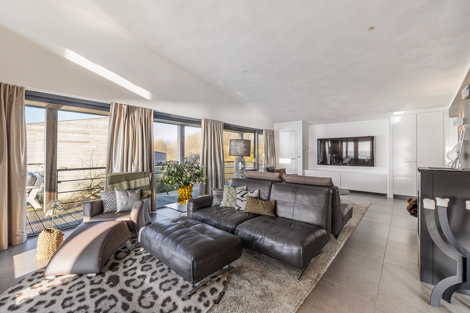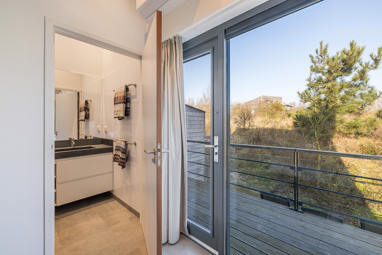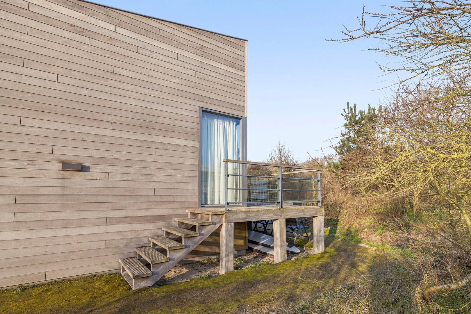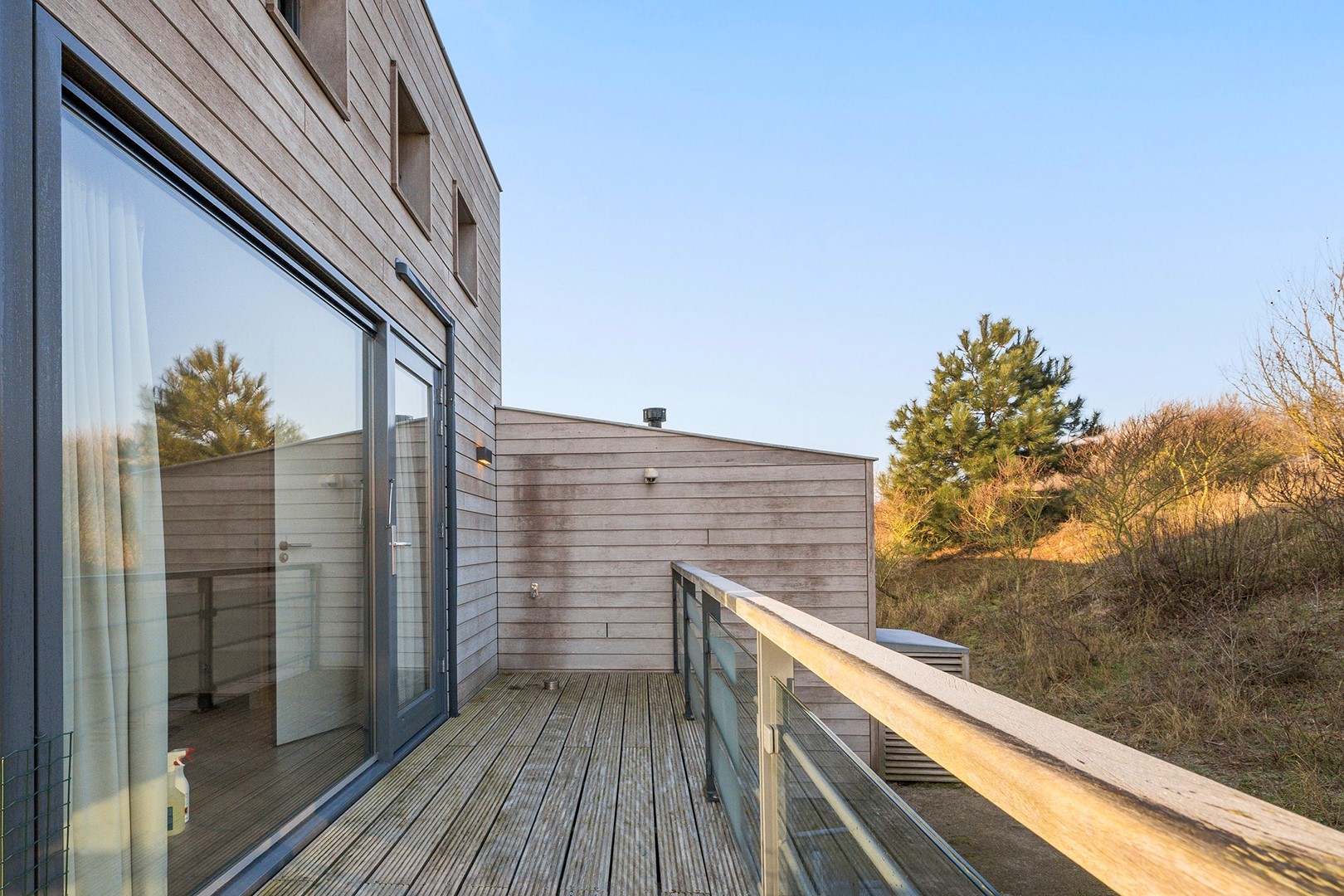 Aan meerdere zijdes van de strandvilla vind je mooie, ruime hardhouten terrassen. Gedeeltelijk afgeschermd middels glas. Het royale terras is een enorm pluspunt aan de woning, waar je de gehele dag kunt genieten van de zon en van het prachtige uitzicht. Er zijn twee geïntegreerde terrasheaters welke het tot ’s avonds laat buiten zitten nog aangenamer maken en er is een buitendouche aanwezig. Aan de achterzijde bevindt zich een ruime berging waar de meterkast en installaties bevinden. Hier is voldoende ruimte over voor bijvoorbeeld surfspullen en fietsen. Daarnaast is er een royale bergruimte onder de villa aanwezig van ca. 38 m² (hoogte ca. 150 cm). De villa is nooit verhuurd geweest en is verder voorzien van beveiligingscamera’s en een alarminstallatie.