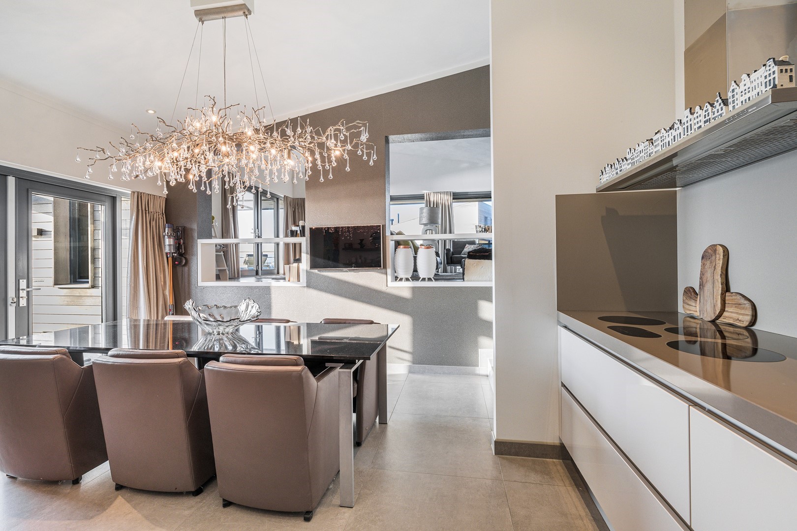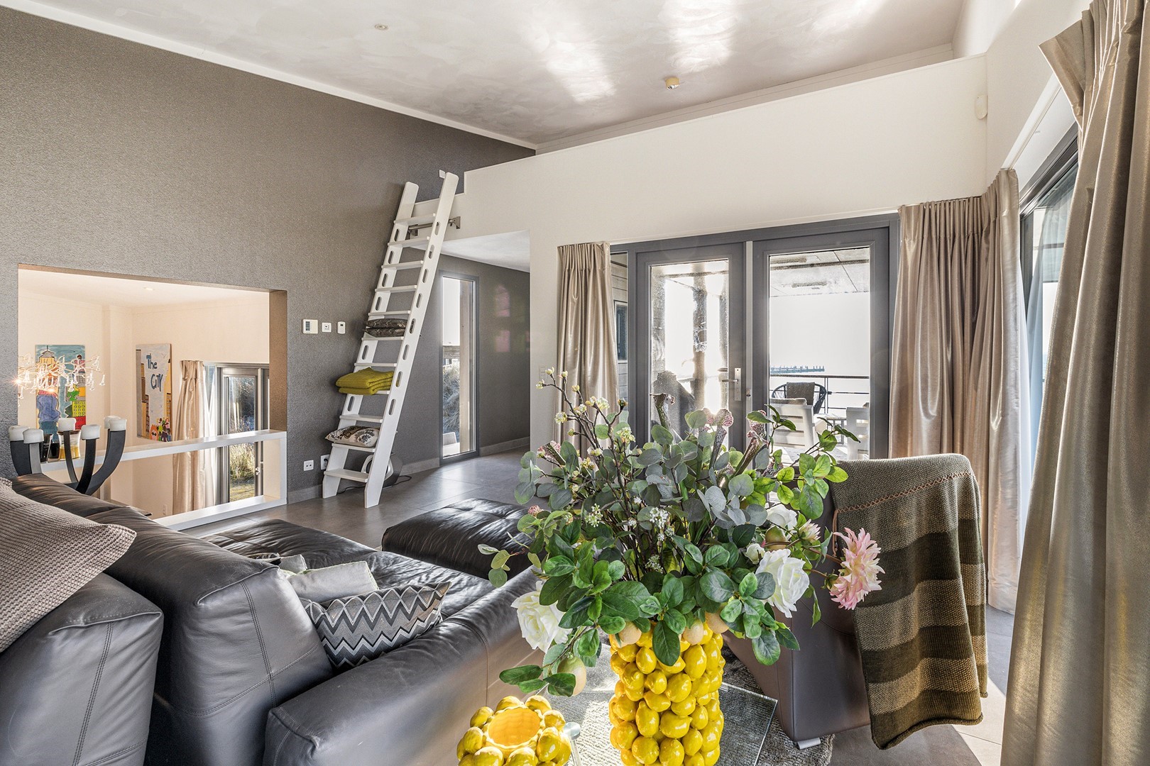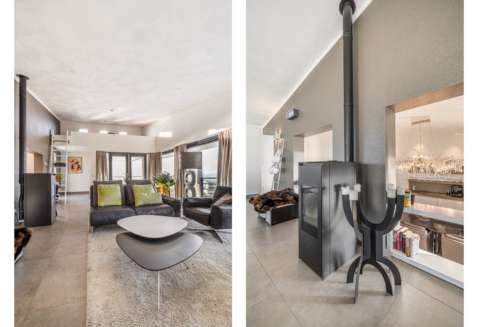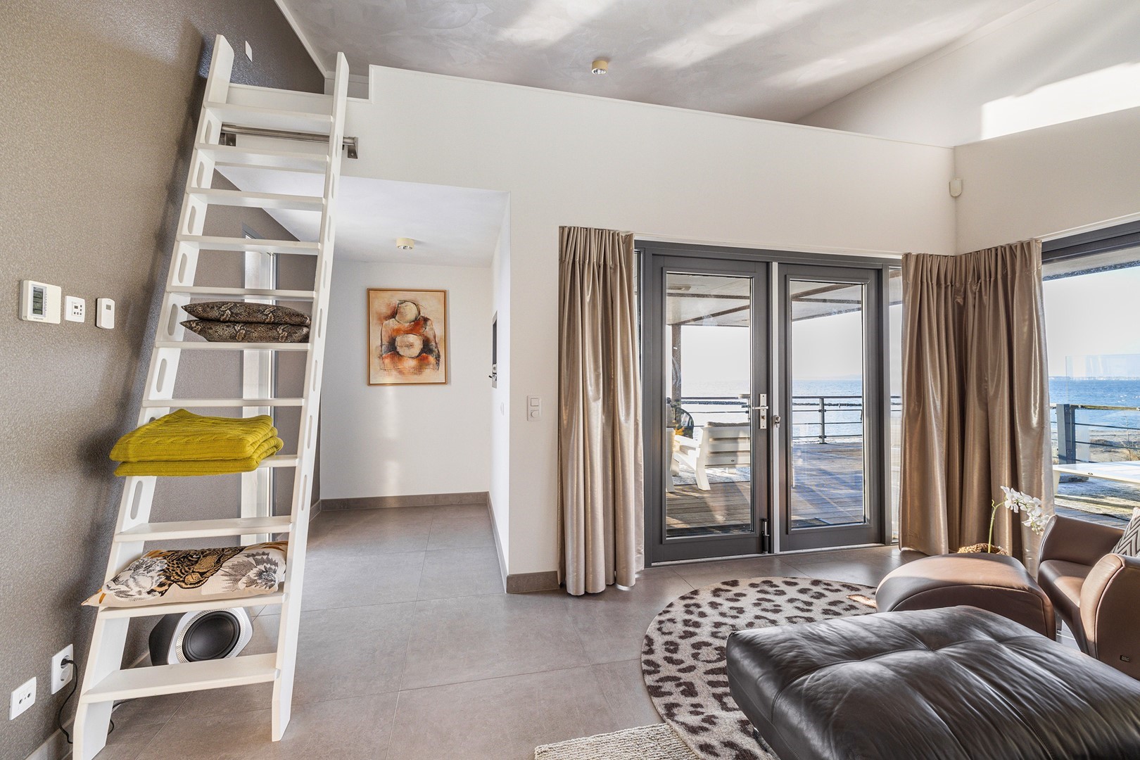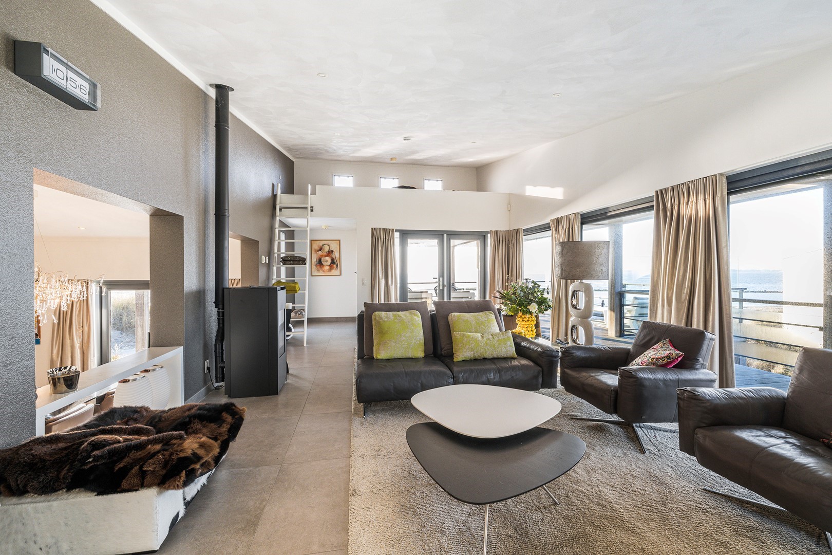 De luxueuze keuken heeft een open en speelse verbinding met de hoger gelegen living. De keuken is uiteraard van alle gemakken voorzien waaronder een design ABK inbouwkookplaat, KitchenAid oven wijnklimaatkast, vaatwasser (beide Miele) en een Quooker. Via een niveautrap bereik je de hoge gelegen living welke door de vele raampartijen altijd een prachtig zicht heeft op de unieke omgeving en het Grevelingenmeer. De zeer royale living is voorzien van sfeervolle pelletkachel en een prachtige hoogte wat bijdraagt aan het ruimtelijke gevoel. De fijne ruime living heeft tevens een loftruimte waar mogelijk extra gasten kunnen logeren of waar kinderen kunnen spelen. Vanuit de living heb je toegang tot het separaat toilet en de twee slaapvertrekken, beide met eigen badkamer en-suite. De slaapkamers zijn voorzien van airco. De badkamers zijn ingericht met een dubbele wastafel, inloopdouche en een toilet. Vanuit één badkamer heb je toegang tot de aparte bergruimte met de opstelplaats van de wasmachine en droger.