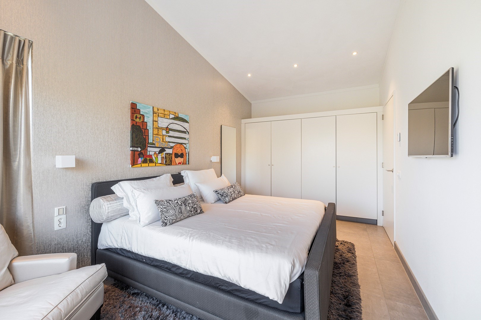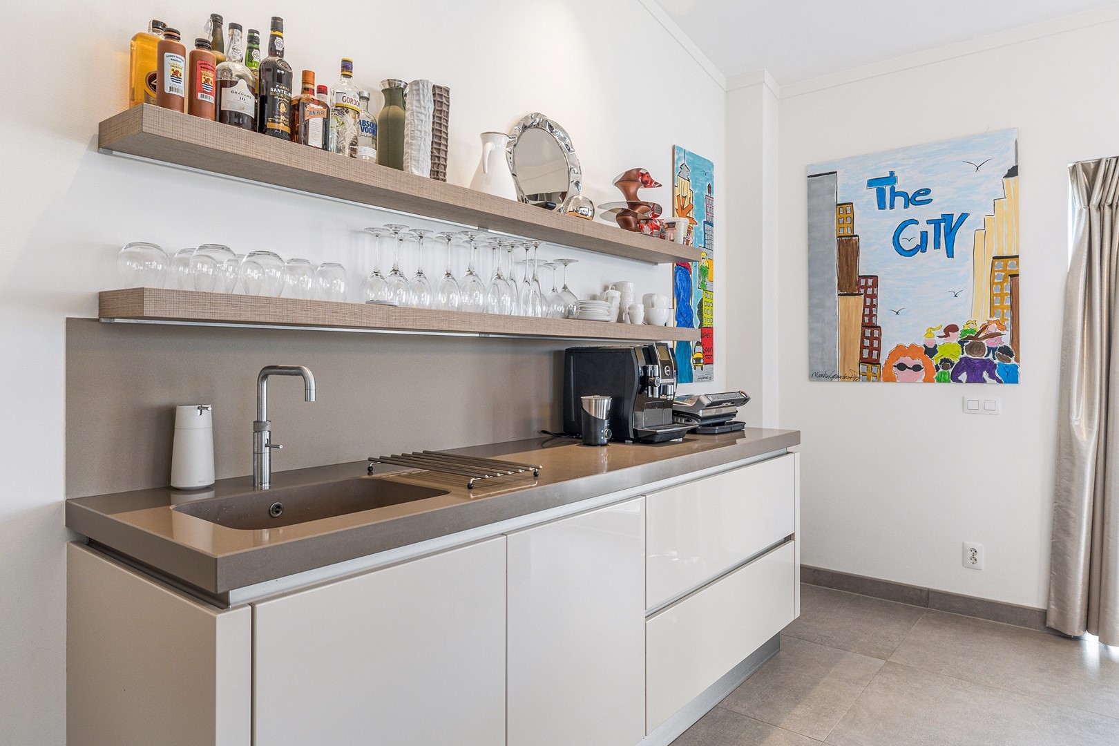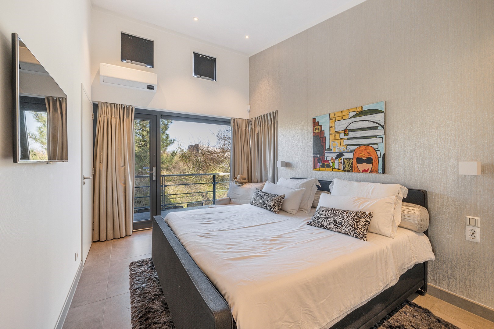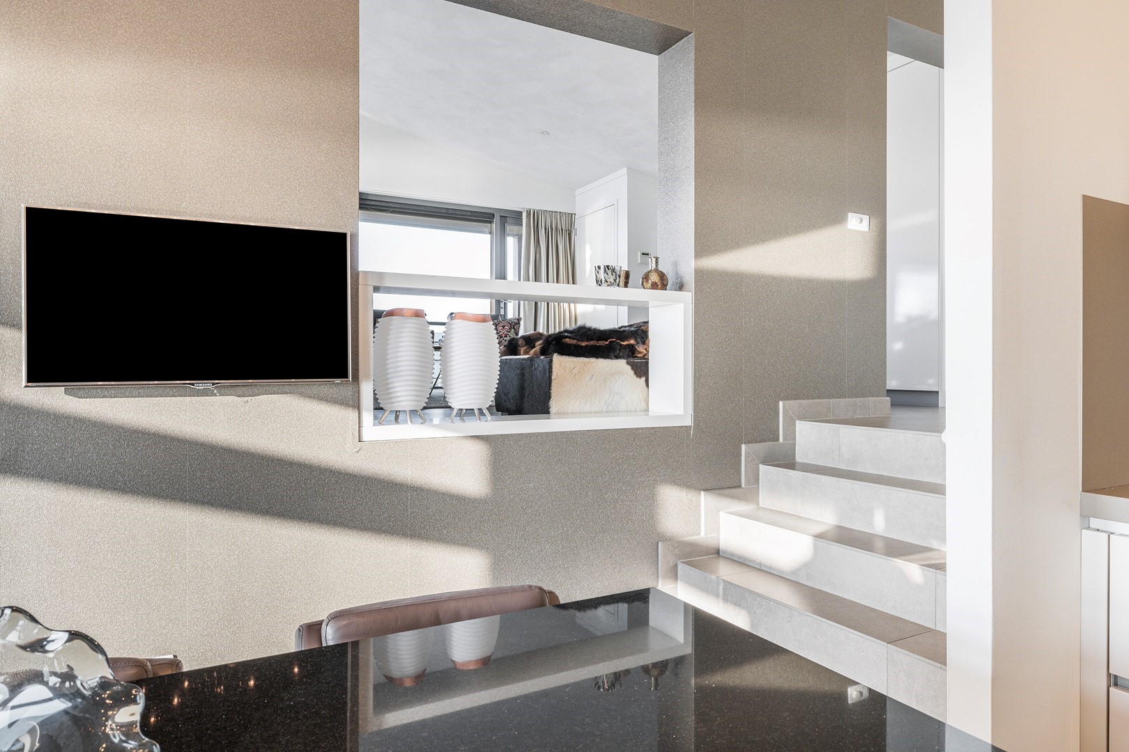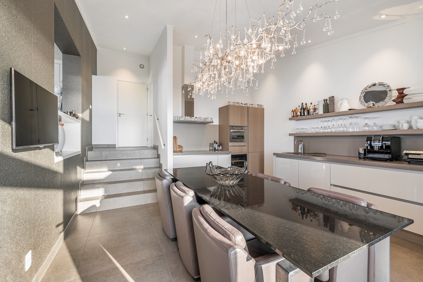 De luxueuze keuken heeft een open en speelse verbinding met de hoger gelegen living. De keuken is uiteraard van alle gemakken voorzien waaronder een design ABK inbouwkookplaat, KitchenAid oven wijnklimaatkast, vaatwasser (beide Miele) en een Quooker. Via een niveautrap bereik je de hoge gelegen living welke door de vele raampartijen altijd een prachtig zicht heeft op de unieke omgeving en het Grevelingenmeer. De zeer royale living is voorzien van sfeervolle pelletkachel en een prachtige hoogte wat bijdraagt aan het ruimtelijke gevoel. De fijne ruime living heeft tevens een loftruimte waar mogelijk extra gasten kunnen logeren of waar kinderen kunnen spelen. Vanuit de living heb je toegang tot het separaat toilet en de twee slaapvertrekken, beide met eigen badkamer en-suite. De slaapkamers zijn voorzien van airco. De badkamers zijn ingericht met een dubbele wastafel, inloopdouche en een toilet. Vanuit één badkamer heb je toegang tot de aparte bergruimte met de opstelplaats van de wasmachine en droger.