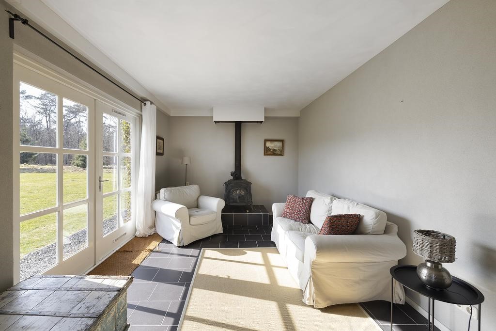 Het gastenverblijf is voorzien van een tijdloze plavuizen vloer. De entree is centraal en ruim, biedt toegang tot de ruime keuken, voorzien van een eenvoudig keukenblok. De ramen met roeden geven ook hier een stijlvolle sfeer. De heerlijke lichte zitkamer met houtkachel en dubbele openslaande tuindeuren geven een heerlijk buitengevoel, waar je ook kijkt, overal natuur! Ook is er op de parterre een slaapkamer met vele raampartijen. De eenvoudige badkamer is voorzien van inloopdouche, dubbele wastafel, toilet, mechanische ventilatie en hier is ook de aansluiting voor de wasmachine.
