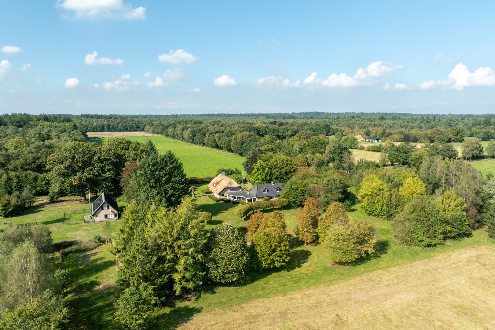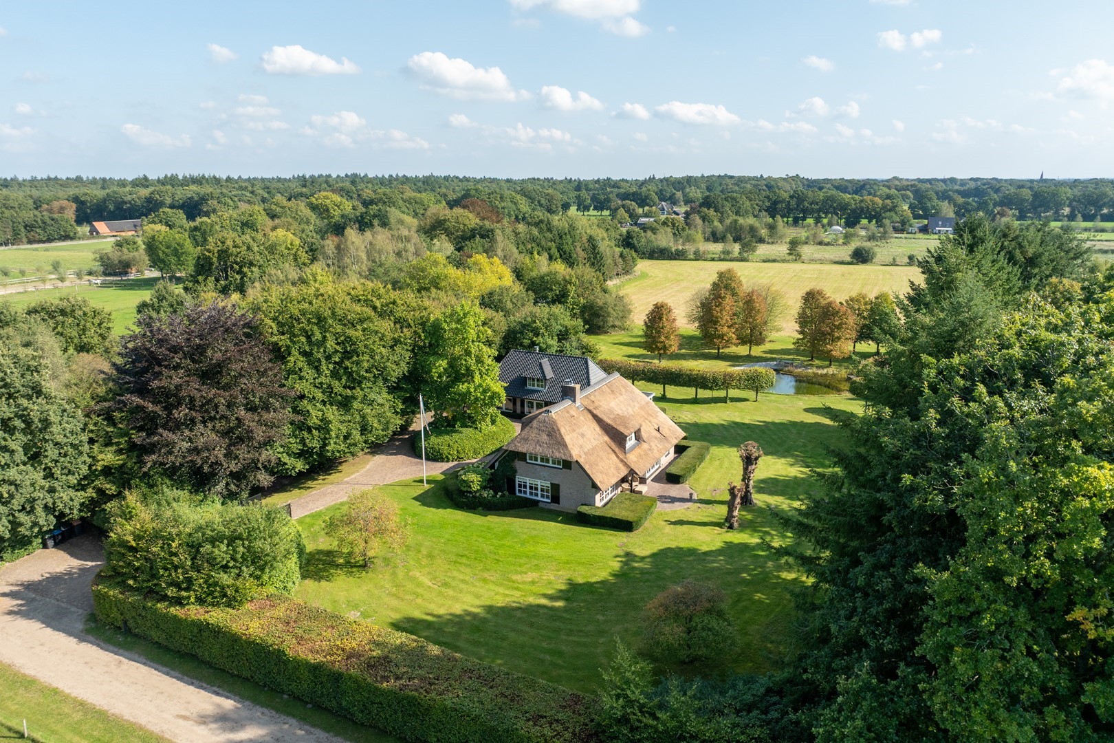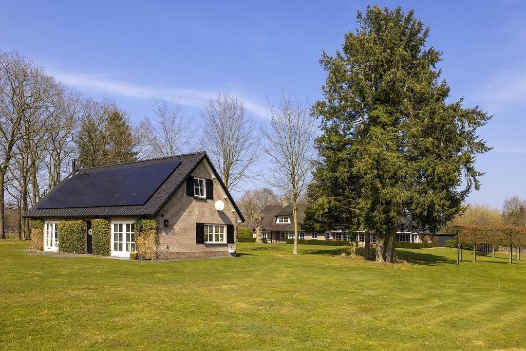Deze betoverende locatie met een stijlvol, rietgedekt LUXUEUS LANDHUIS en royaal bijgebouw, een natuur zwemvijver en een verstillend wandelpad over uw eigen perceel vormen tezamen het levend bewijs van ongerepte natuur en stilte. Bij het binnenrijden van de poort, laat u de hectiek van de dag achter u en komt u thuis.