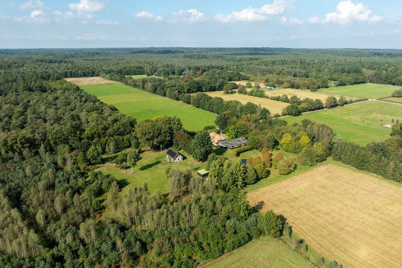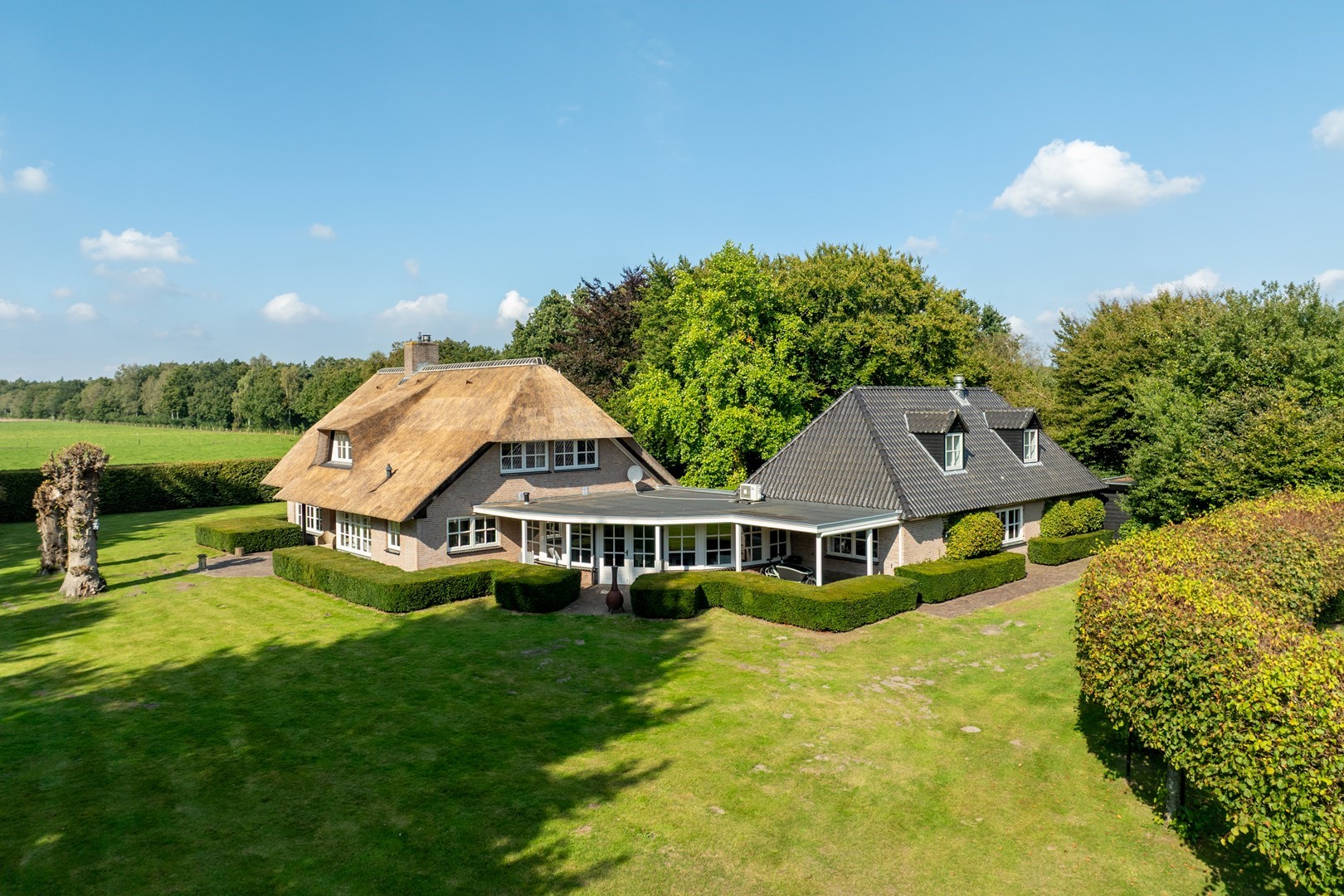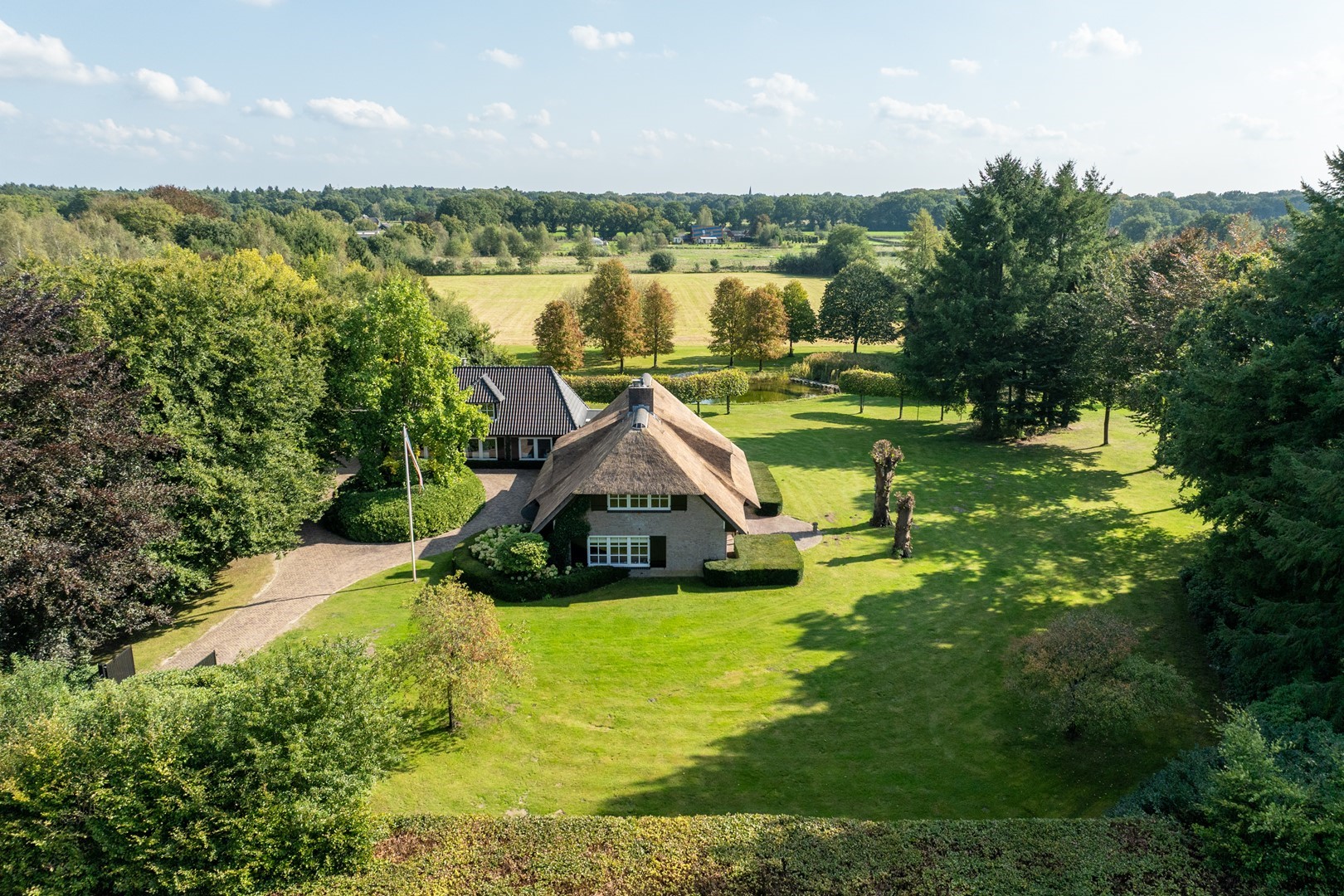 Deze betoverende locatie met een stijlvol, rietgedekt LUXUEUS LANDHUIS en royaal bijgebouw, een natuur zwemvijver en een verstillend wandelpad over uw eigen perceel vormen tezamen het levend bewijs van ongerepte natuur en stilte. Bij het binnenrijden van de poort, laat u de hectiek van de dag achter u en komt u thuis.