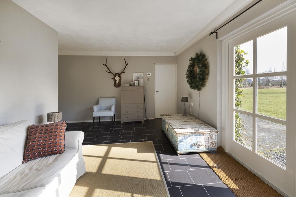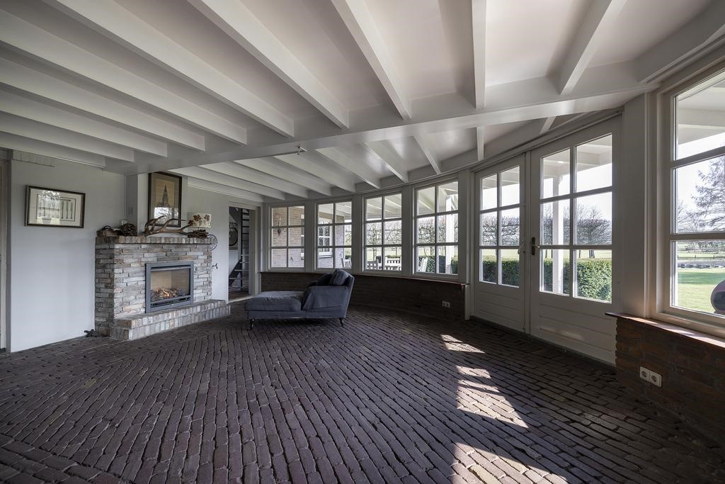 Vanuit de keuken komt u in de waanzinnige fijne serre ook voorzien van een royale schouw met gashaard. Het balkenplafond geeft een warme sfeer en de dubbele tuindeuren verbinden ‘binnen met buiten’. Vanuit deze fijne ruimte is er direct toegang tot het bijgebouw.