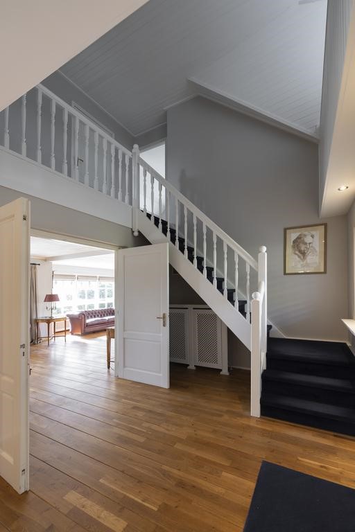 De royale houten trap met vide geeft toegang tot de eerste verdieping. Hier treft u de master bedroom incl. ingebouwde kastenwand met badkamer en suite. De lichte badkamer heeft een bad, douche, badkamermeubel en toilet.