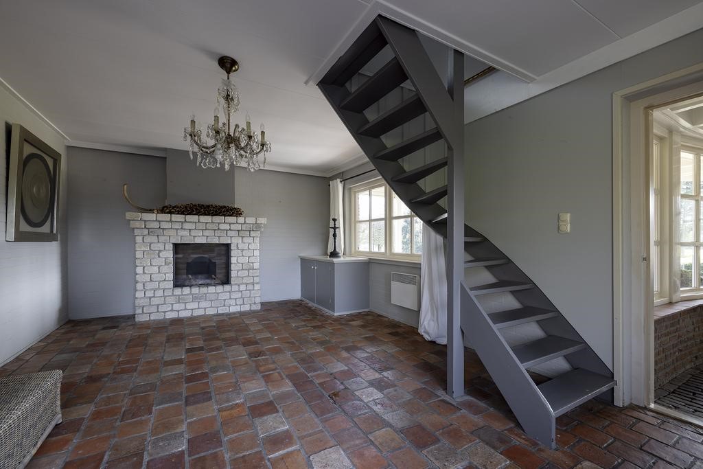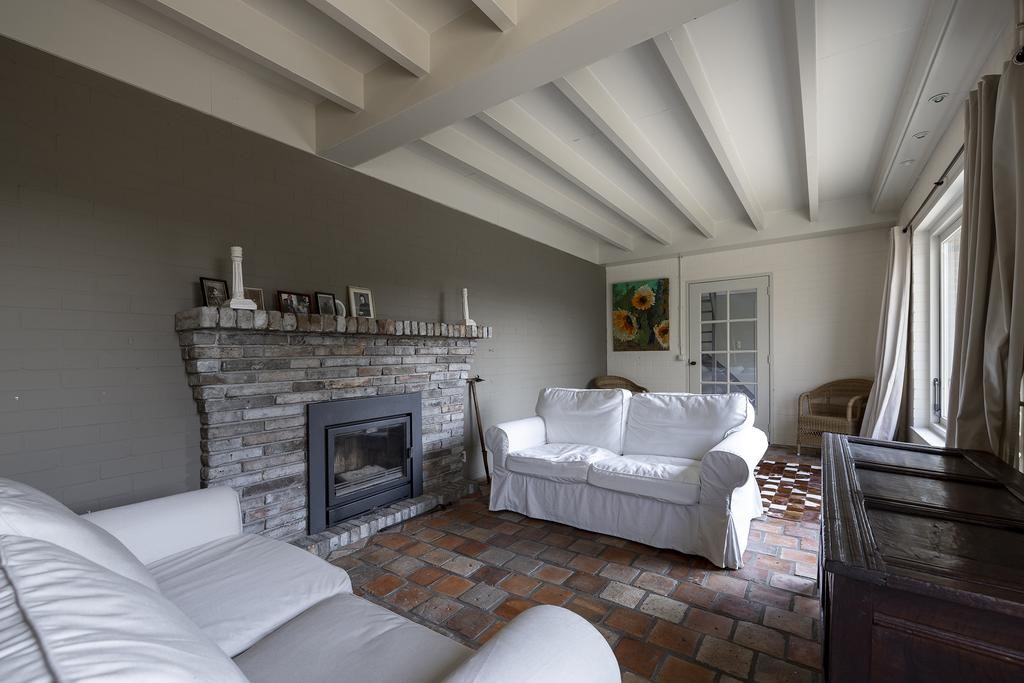 De voormalige garage is verbouwd tot een heerlijke zitplek en ook hier treft u een schouw met open haard en authentieke Franse vloer. In het open gedeelte waar ook de trap naar de eerste verdieping zich bevindt, is wederom een prachtige schouw met open haard. Ook is er toegang tot een separaat toilet en nog een aparte opbergruimte.