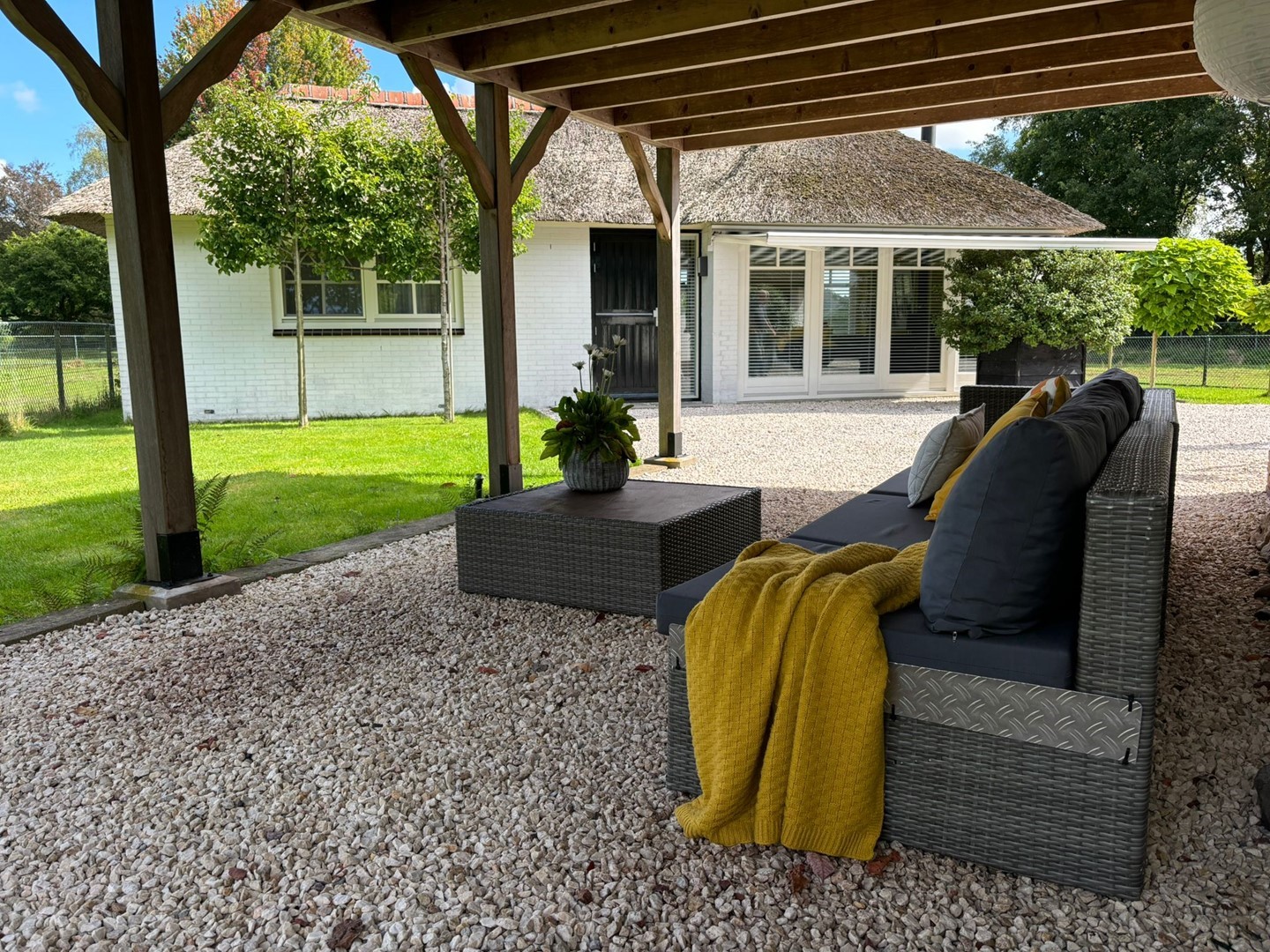 De rietgedekte garage heeft openslaande deuren. Er is ruimte genoeg om uw auto te parkeren met daarbij voldoende bergruimte en een werkbank. Voorheen was deze ruimte in gebruik als paardenstal met 2 boxen. Tevens is er een vliering aanwezig. De carport (cederhout) heeft een laadpaal voor de elektrische auto. U kunt hier ook een extra overdekte zithoek creëren met een fantastisch uitzicht op het groen.