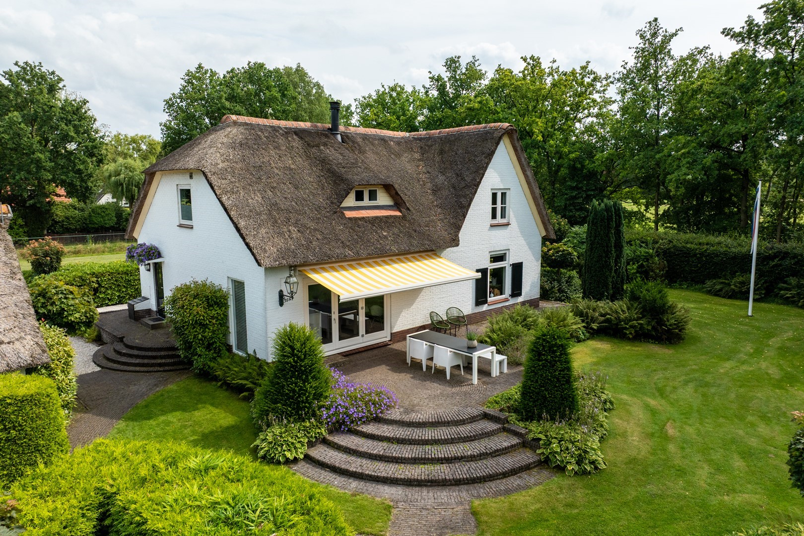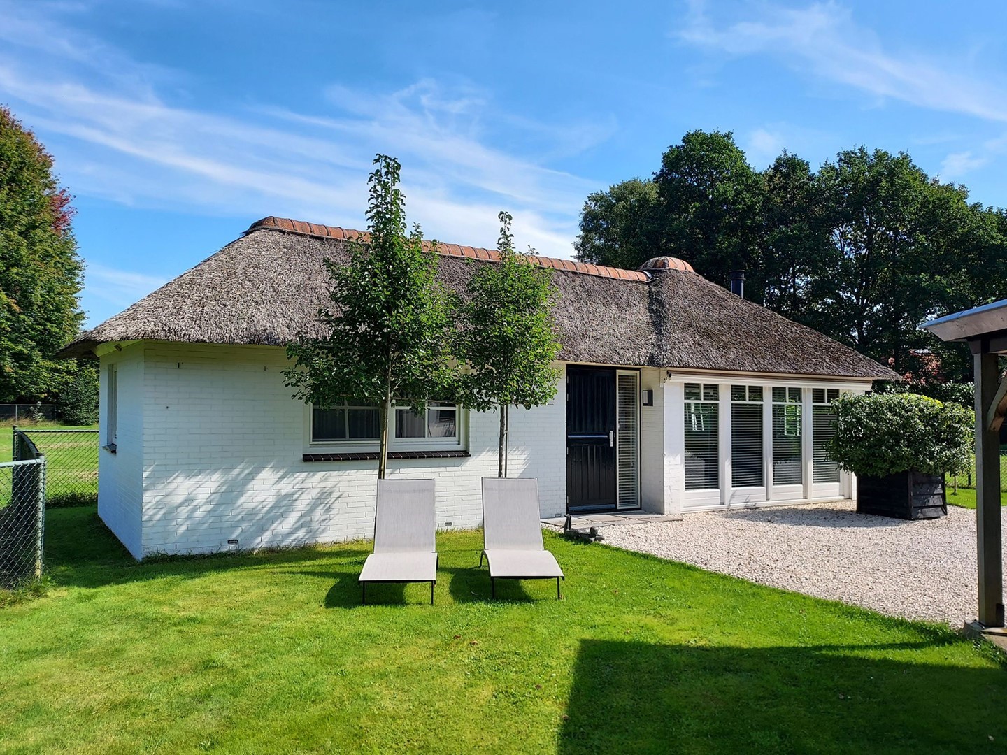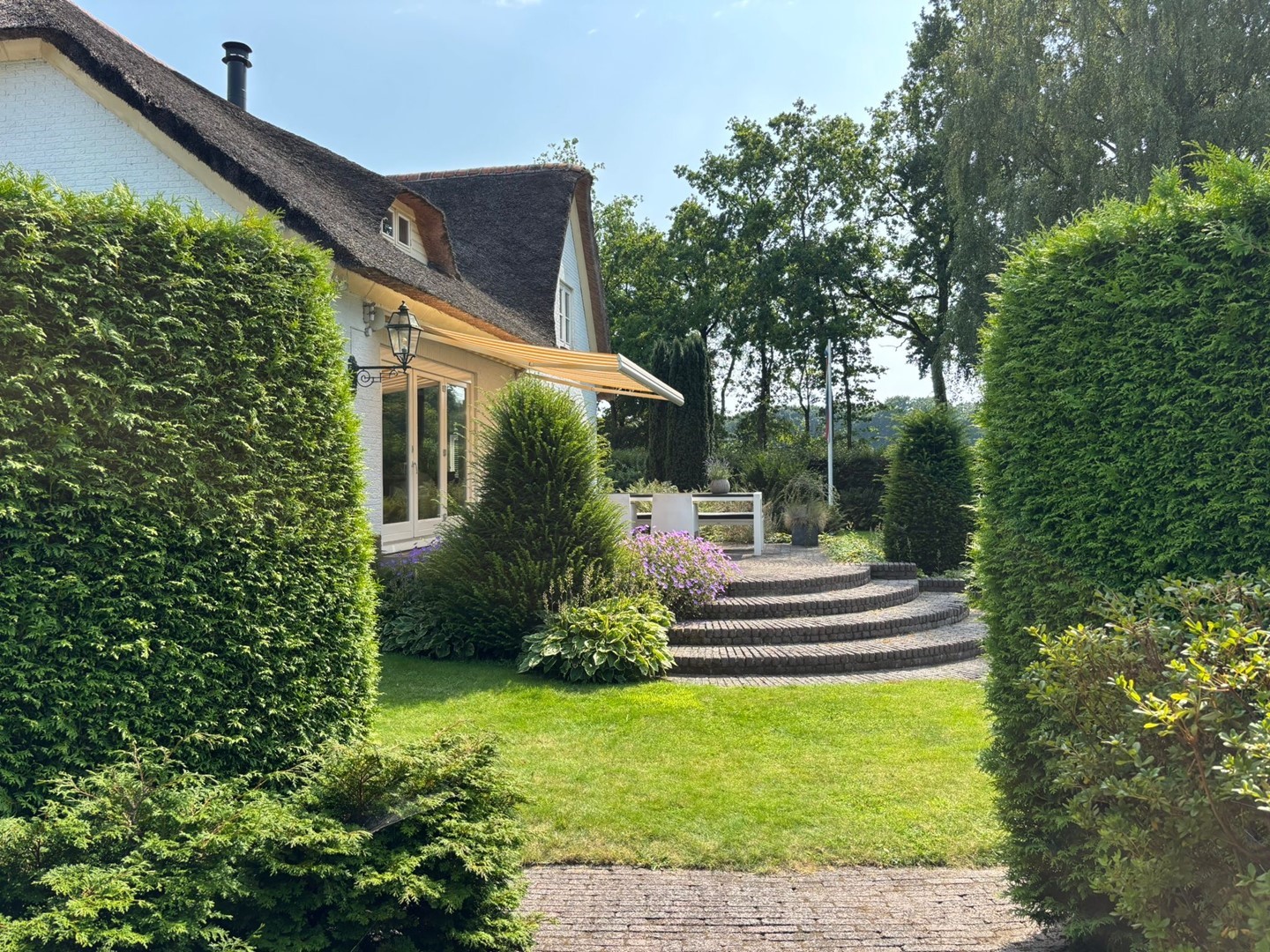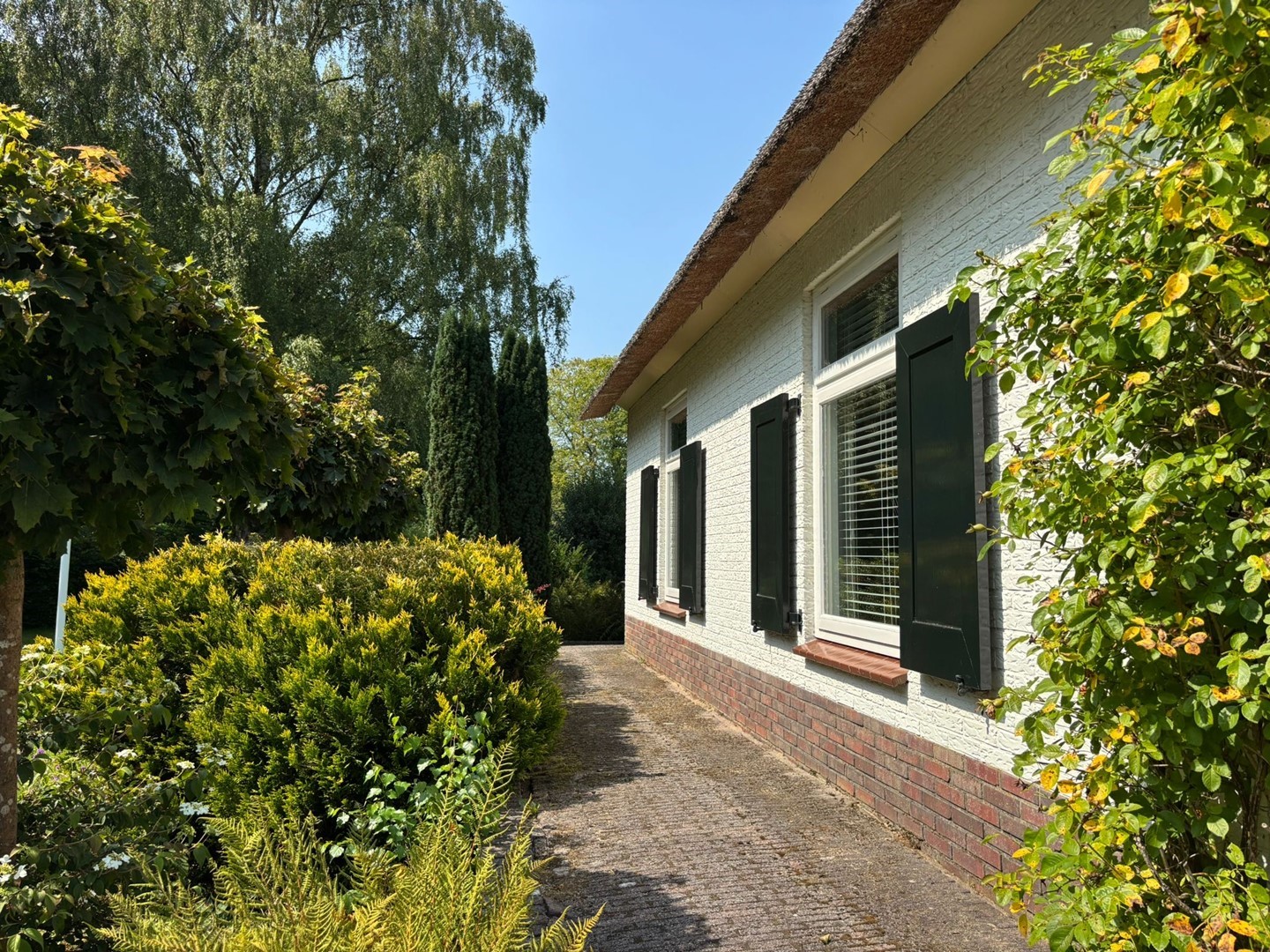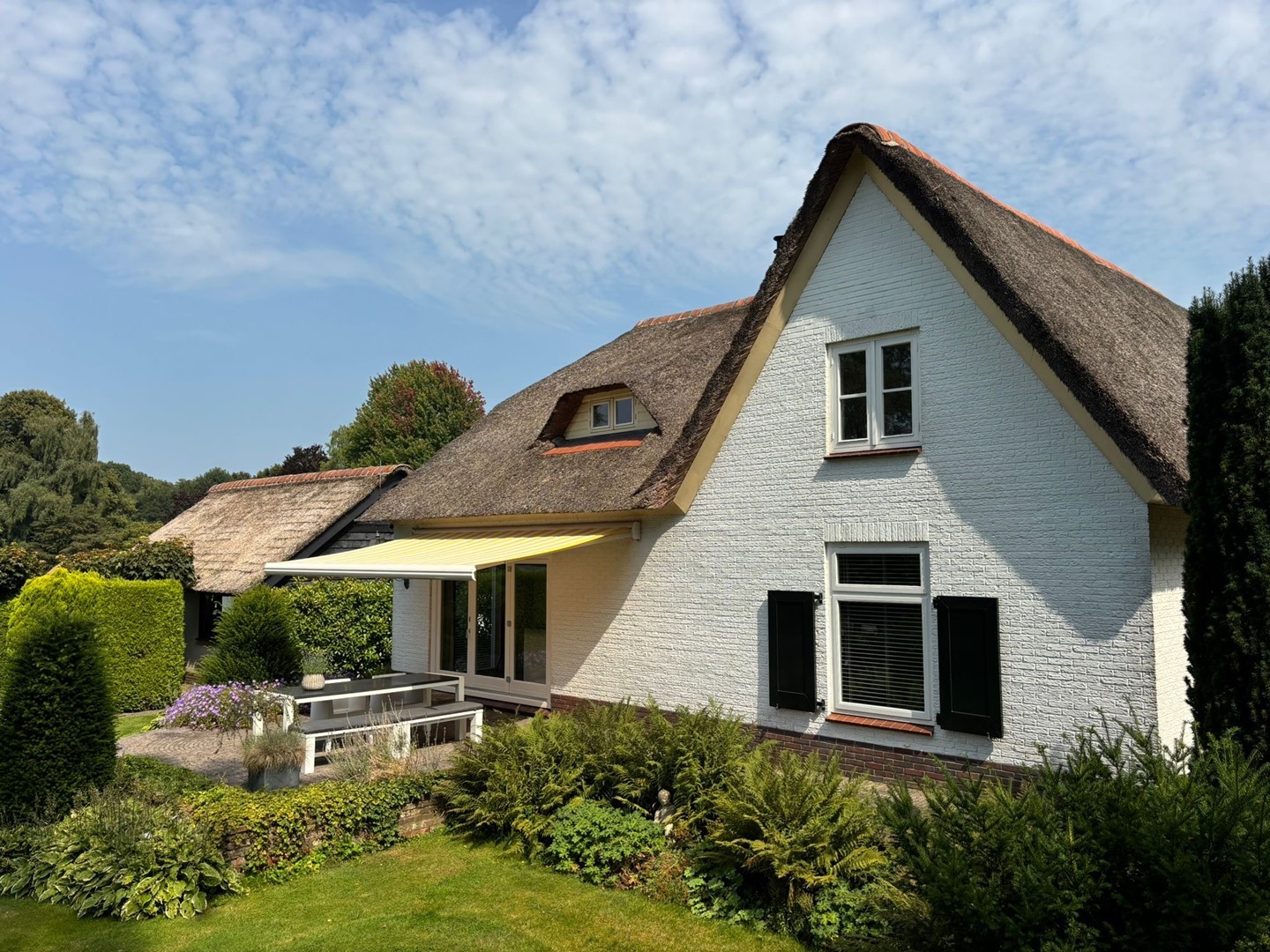 Het landhuis (1976, volledig gerenoveerd in 2020) combineert karakteristieke details als luiken, balkenplafonds en een rieten kap met eigentijds wooncomfort en een stijlvol interieur. De living met doorkijk houthaard en harmonicadeuren naar het terras vormt het hart van de woning. Met drie slaapkamers en een hoogwaardige badkamer op de eerste verdieping, een prachtige woon-leefruimte en een werk-/studeer- of slaapkamer op de parterre is dit een fijn familiehuis.