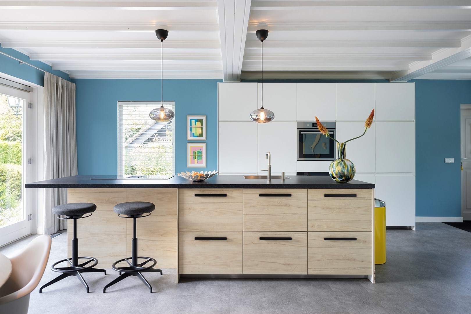 De taatsdeur geeft toegang tot het ruime woon- en leefgedeelte met houten balkenplafond en originele gebinten waarbij de open keuken in contact staat met de living. De keuken heeft een kookeiland voorzien van een inductieplaat met vier zones en geïntegreerde afzuiging. Verder is de volgende inbouwapparatuur aanwezig: quooker, oven, vaatwasser, koel-vriescombinatie en een wijnklimaatkast. Naast de CV kast is de achterdeur zodat u via enkele traptreden op uw erf staat. Harmonicadeuren geven toegang tot het royale terras en de vele raampartijen bieden u rondom een prachtig zicht over het groen. De schouw met houthaard is een sfeervolle eyecatcher en onderstreept het landelijke karakter van de woning met een touch van industriële accenten.