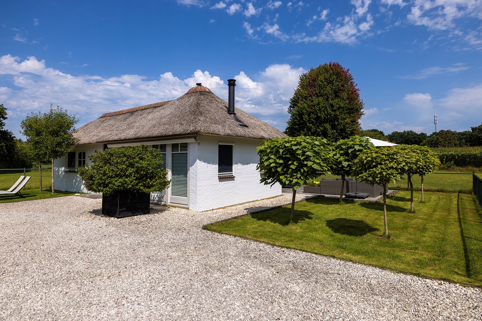 De rietgedekte cottage is in gebruik als gastenverblijf met een sfeervolle woonkamer - compleet met een moderne houtkachel – en separate slaapkamer. De keuken is voorzien van een inductieplaat met twee zones, vaatwasser en koelkast. De moderne badkamer heeft vloerverwarming, een toilet met afzuiging, badmeubel en douche met regendouche.