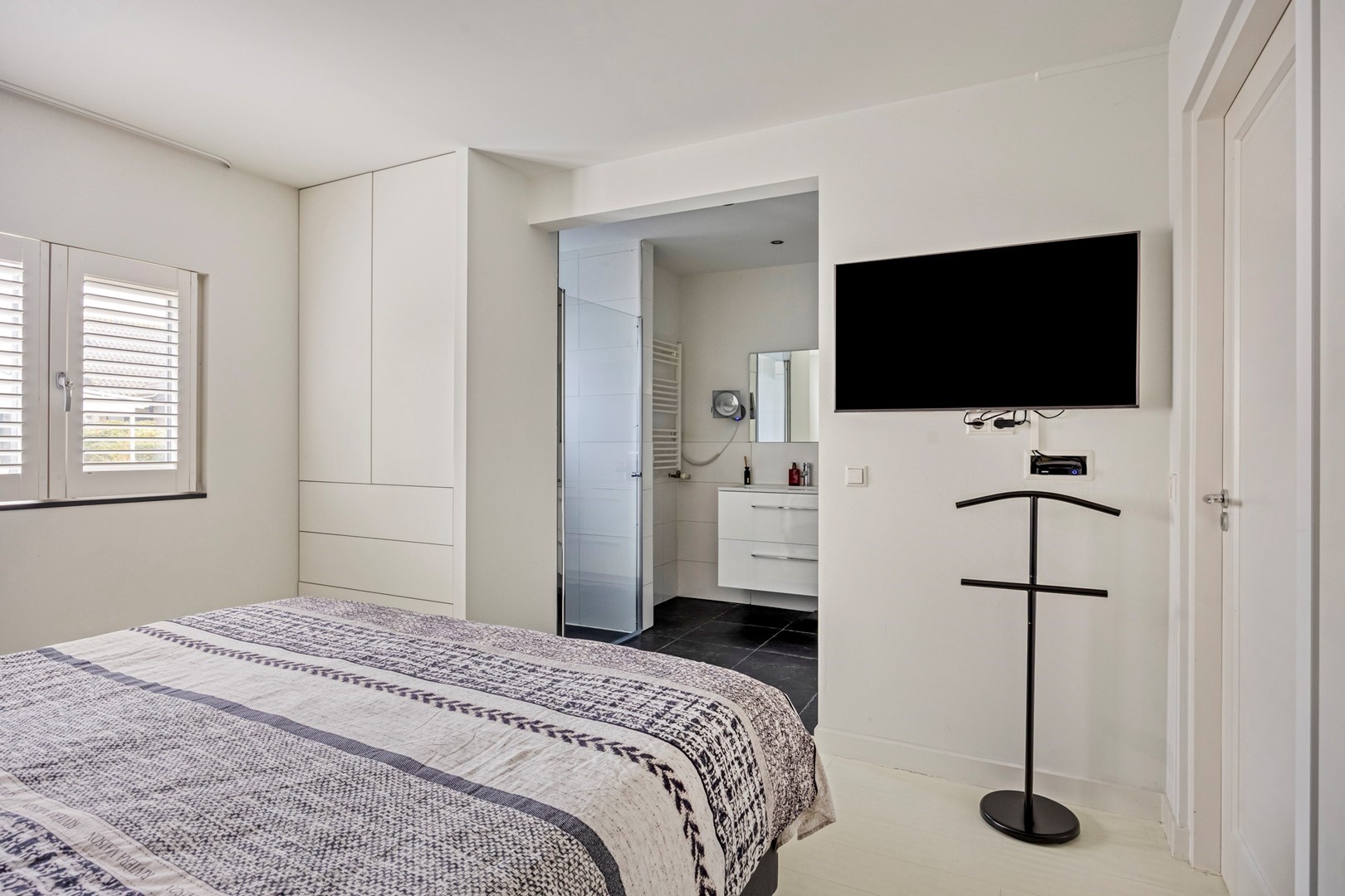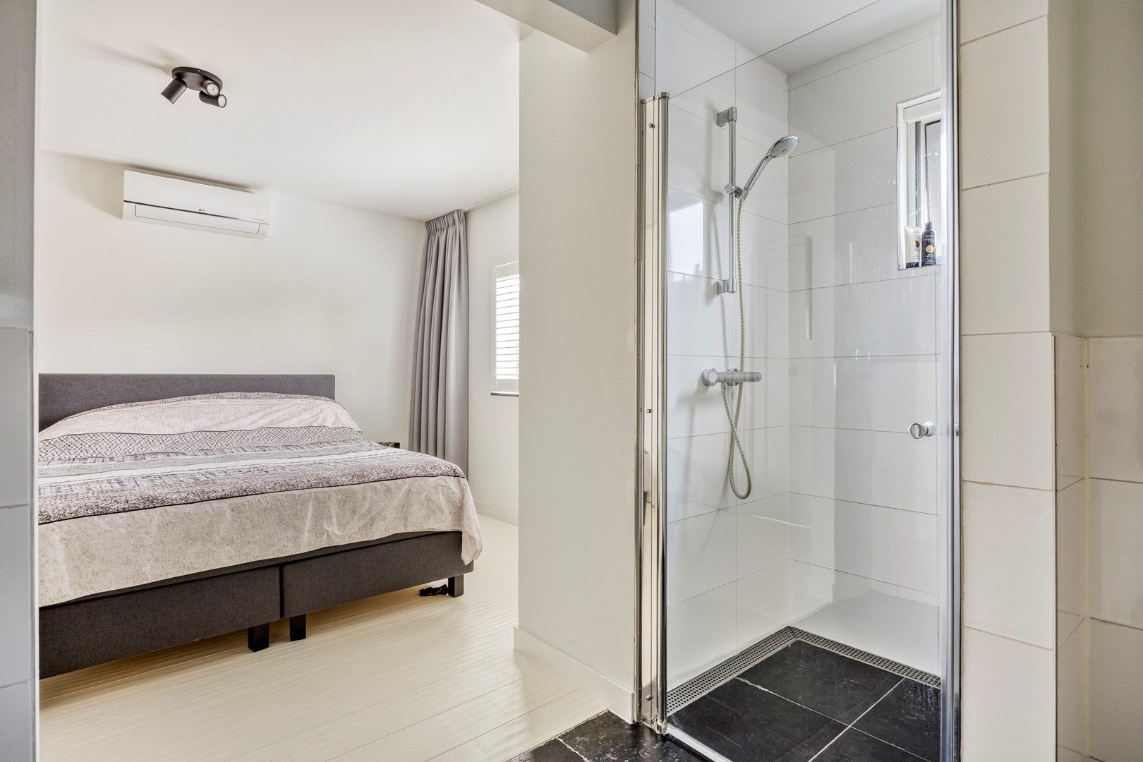 Entree, ruime hal, meterkast, trappenhuis, bergkast en bijkeuken met was- en droogcombinatie. Deur naar ruime slaapkamer met luxe uitgevoerde en-suite badkamer.