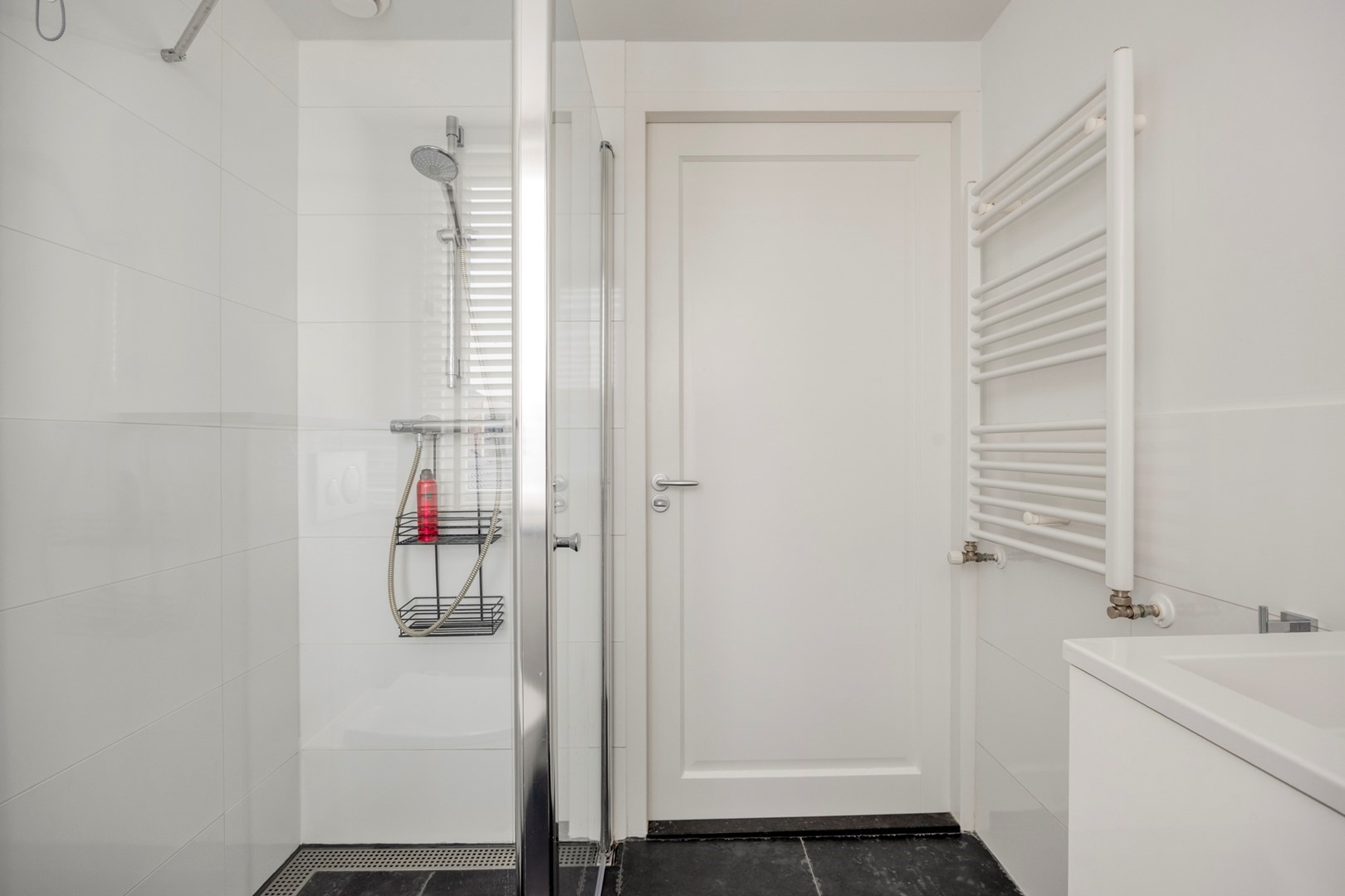 Ruime overloop met entree naar badkamer met wastafel, toilet en douche.