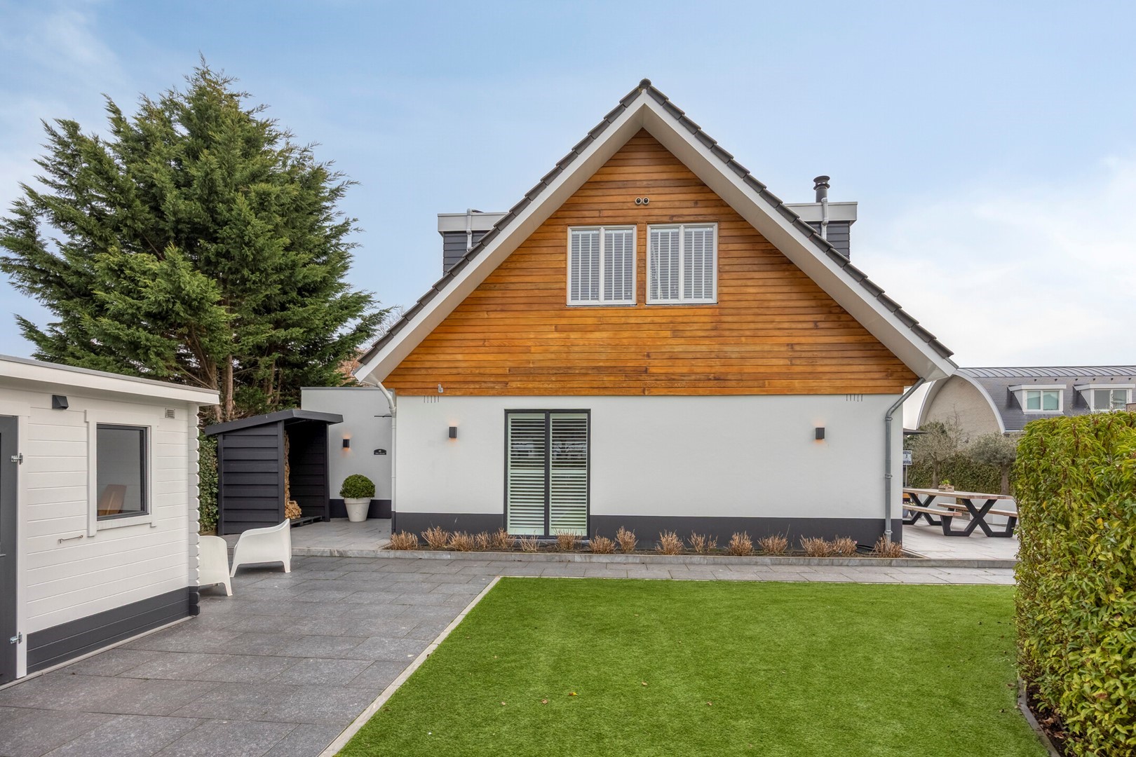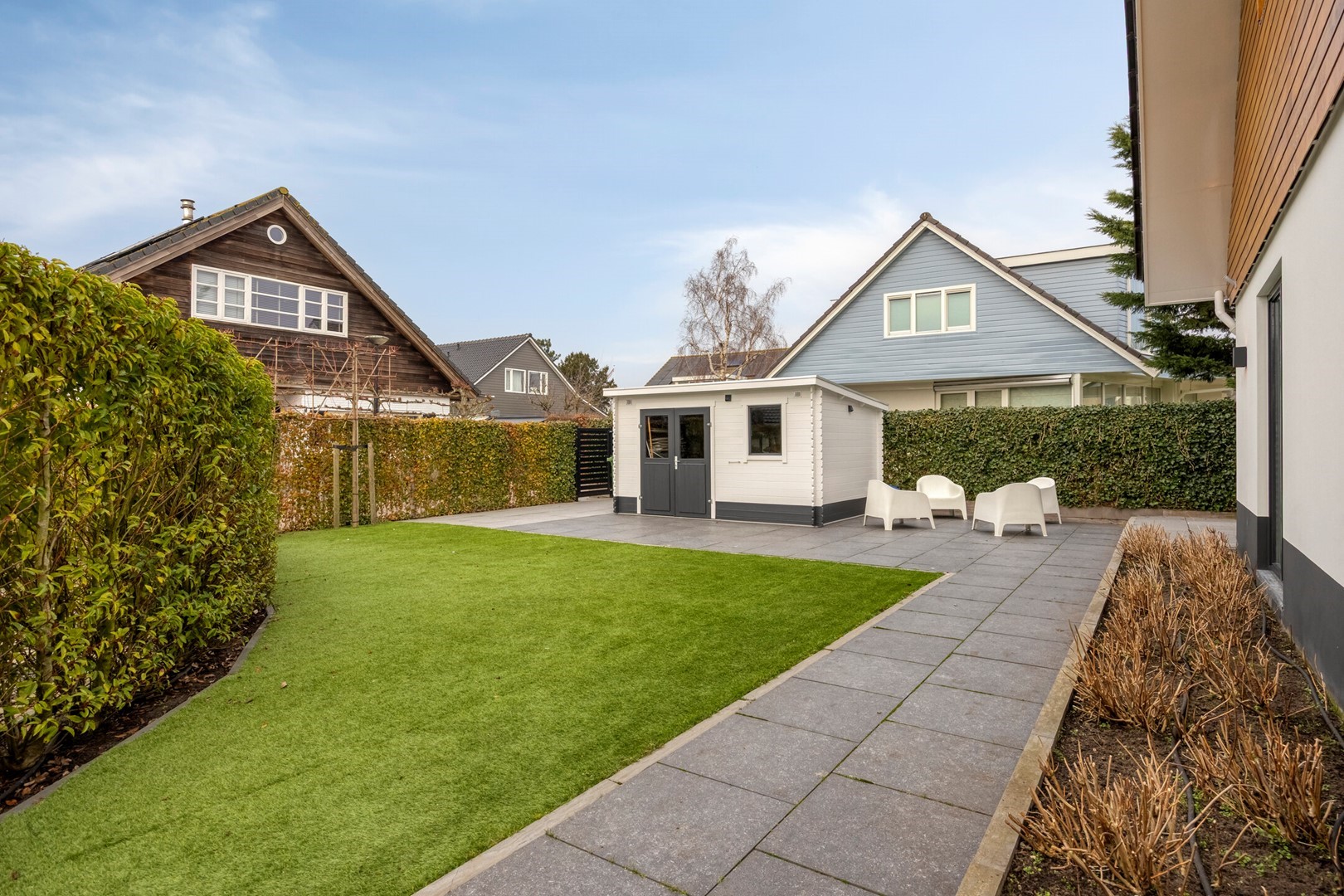 In de tuin bevinden zich een houten berging met dubbele deuren en een overkapping voor houtopslag. Diverse wateraansluitingen alsmede stopcontacten geintegreerd in de tuin.