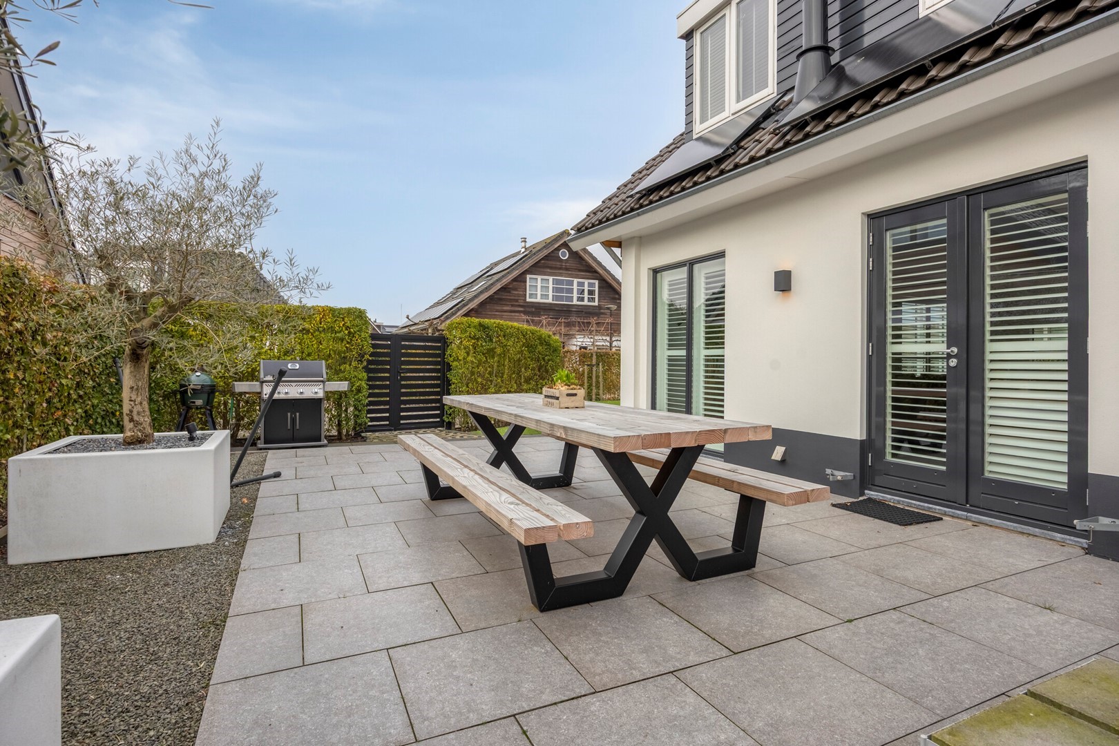 Tuin volledig omheind. Parkeerplaatsen op verhard terrein voor meerdere auto's. Tevens parkeren op de openbare weg voor de woning. Laadpaal voor elektrische auto.