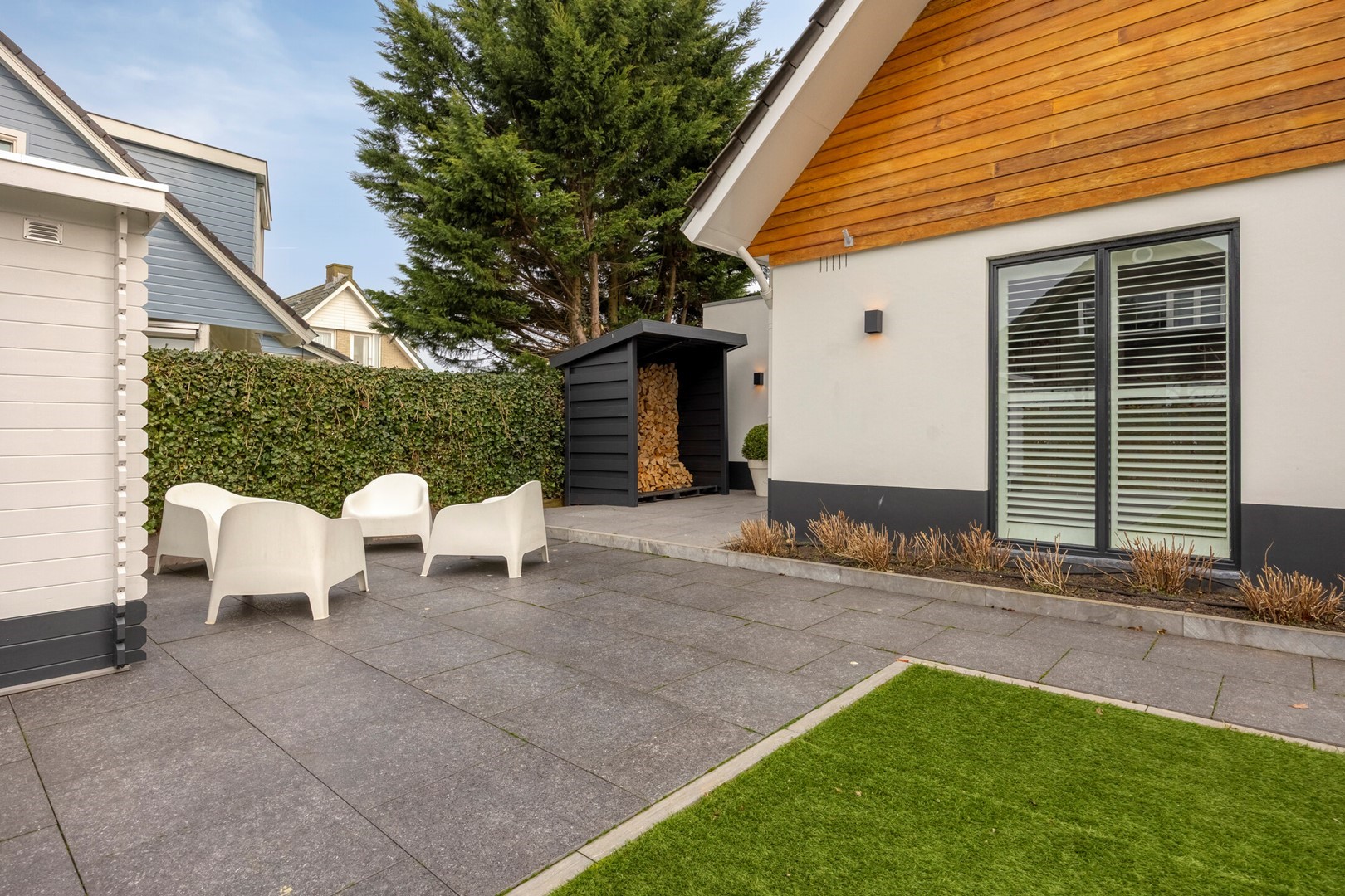 Een heerlijk huis met ruime tuin, eigen oprit met parkeerplek voor meerdere auto,s, hekwerk met looppoort. Buitenberging voor opslag fietsen en tuinmaterialen. Opslagoverkapping voor haardhout bij de entree.