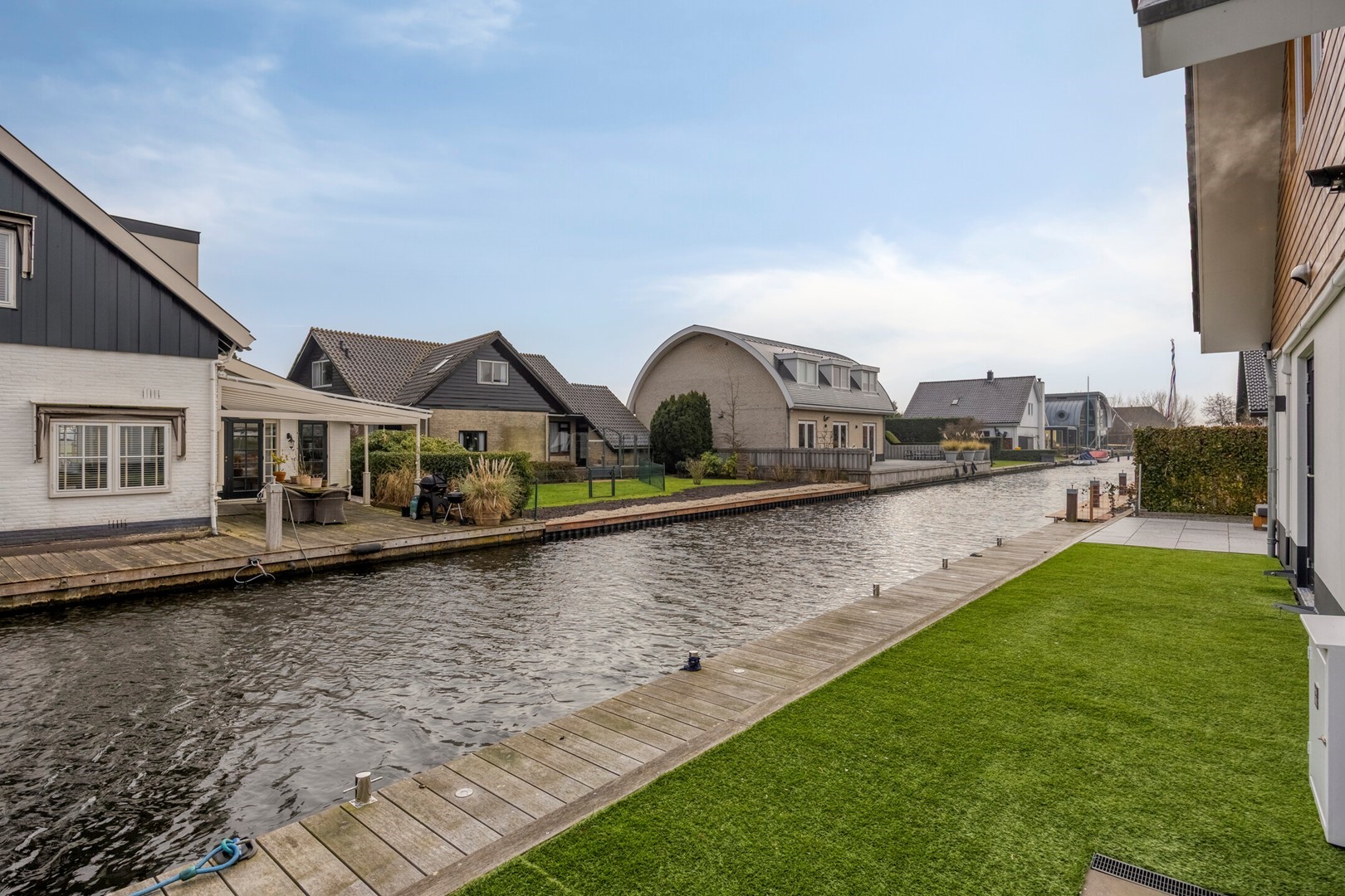 Aanlegsteiger over de gehele lengte van het perceel met ruimte voor meerdere boten. De aanlegsteiger is onlangs door professioneel bedrijf (De Rijk uit Leimuiden) in zijn geheel vervangen.