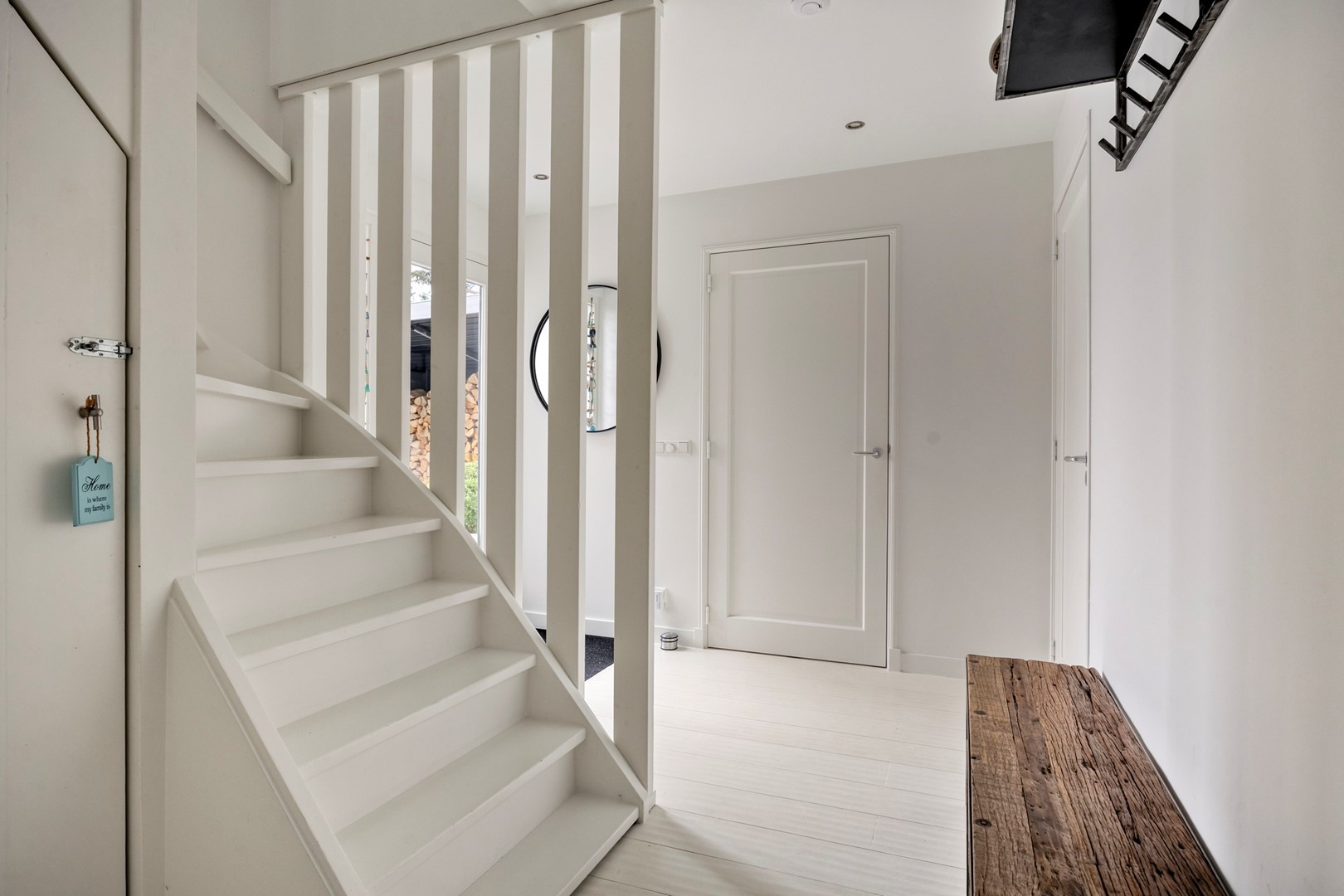 Toegansdeur naar woongedeelte opgesplitst in ruime keuken met kookeiland en inbouwapparatuur, eethoek met zicht op water en woon/zitgedeelte met fraaie houthaard. Ruime slaapkamer met inbouwkasten en badkamer en-suite (ligbad, douche, wastafelmeubel). Gastentoilet, trappenhuis naar verdieping, ruime woonkamer met houthaard. Openslaande deuren naar terras aan de langsgevel. Op de begane grond shutters voor de ramen.