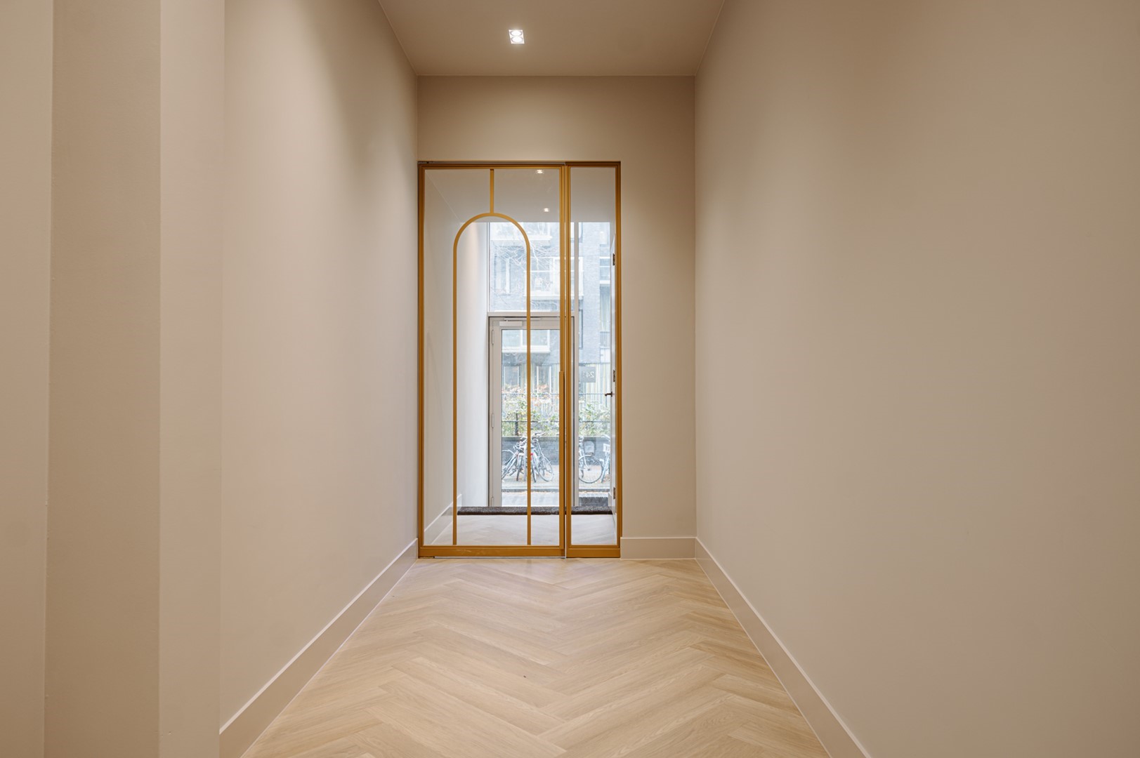 Bij binnenkomst opent zich een imposante hal met royale proporties en hoge plafonds van 3,30 meter. Maatwerk stalen deuren verbinden de hal met de leefruimtes en brengen harmonie en luxe in de woning. De leefkeuken vormt het hart van de woning, zorgvuldig geproportioneerd, hoogwaardig afgewerkt en in directe relatie met de buitenruimte. Aangrenzend bevindt zich het loungegedeelte met een royale zithoek en leesplek. Daarnaast is er een ruime berging aanwezig. De woonkamer ademt rust en verfijning, met bronzen stalen deuren die de ruimte subtiel verdelen zonder licht te ontnemen. Grenzend bevindt zich een multifunctionele kamer die zich uitstekend leent als thuiskantoor, gastenverblijf of extra slaapkamer, voorzien van een eigen badkamer. Op de slaapverdieping bevindt zich het stille nachtgedeelte, met nog een slaapkamer en de master bedroom, uitgerust met ingebouwde kasten. Onder de trap is een extra berging gecreëerd. De ruime badkamer beschikt over een ligbad, inloopdouche en toilet, met daarnaast een aparte inloopkast. Alles is recent en integraal vernieuwd, en direct te betrekken. In totaal beschikt de City Residence over drie slaapkamers en twee luxe badkamers.