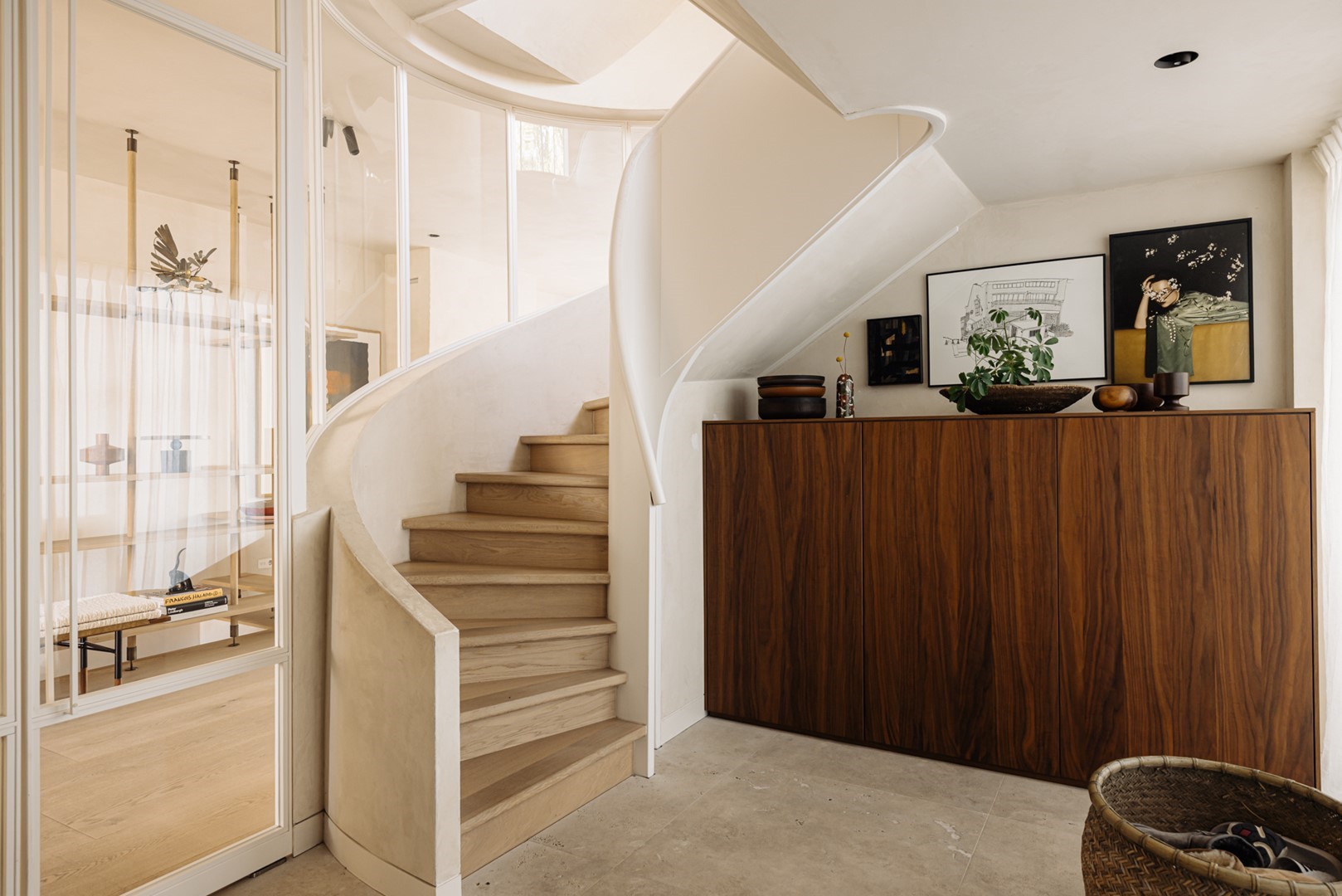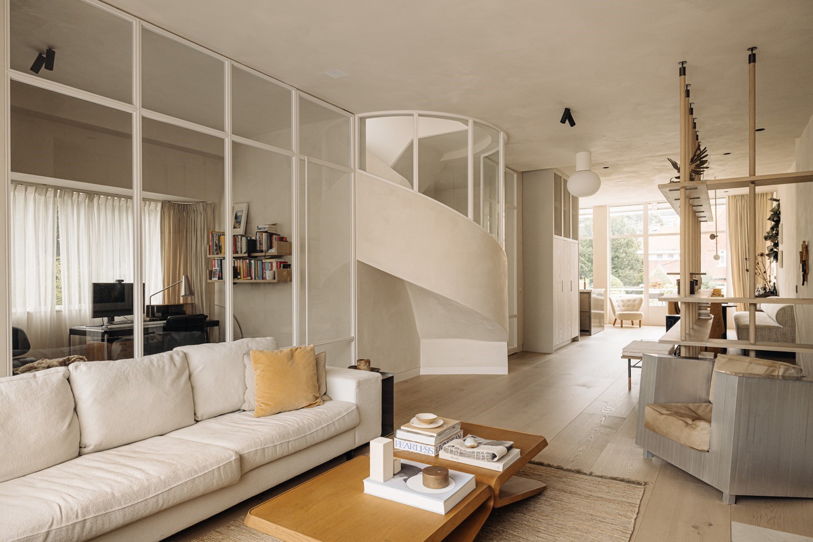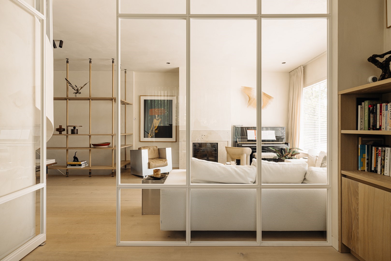 Huize Bonheur presenteert zich met een uitnodigende entree die leidt naar een ruime hal, waar de elegante trap direct de toon zet. Vanuit de hal opent zich een doorkijk naar de woonverdieping van circa 105 m². De woonkamer loopt over in een zijruimte, momenteel ingericht als studeerkamer, afsluitbaar met stalen deuren met glas. Het centrale deel van de verdieping verbindt de woonkamer met de woonkeuken aan de achterzijde. Hier vormen een houten maatwerkkast, gecombineerd met de trap naar de ondergelegen tuinverdieping, een architectonisch element.