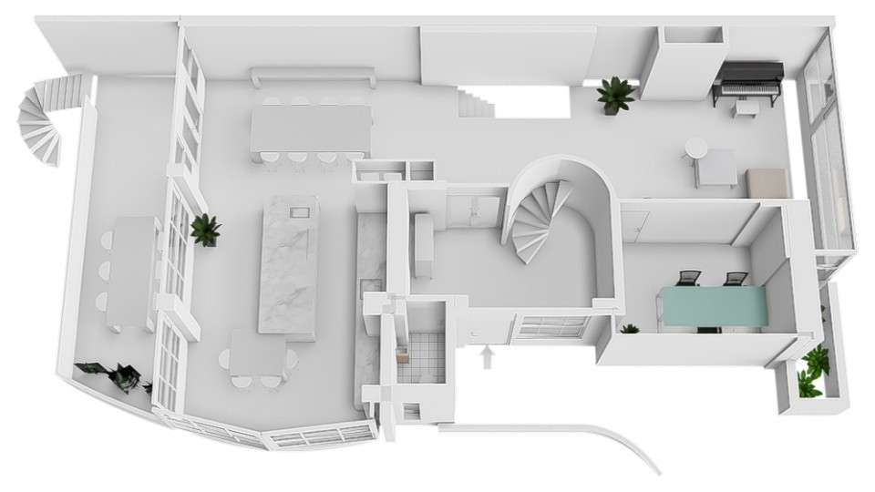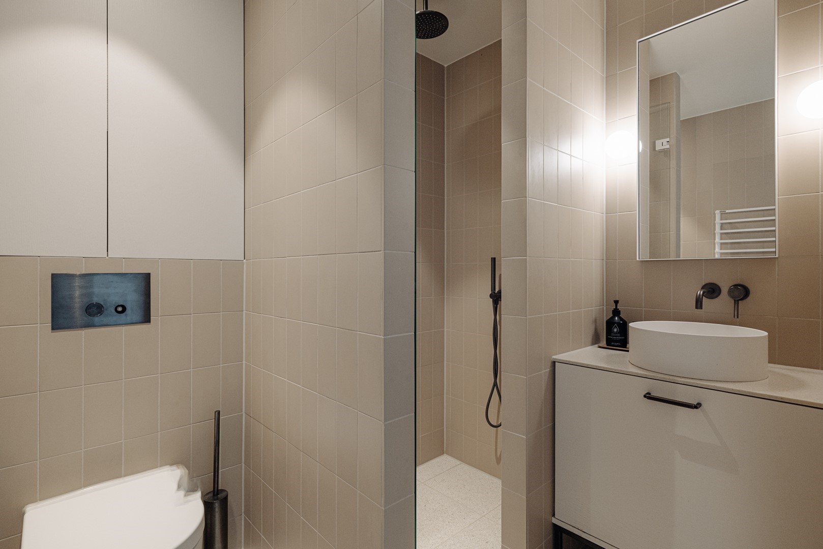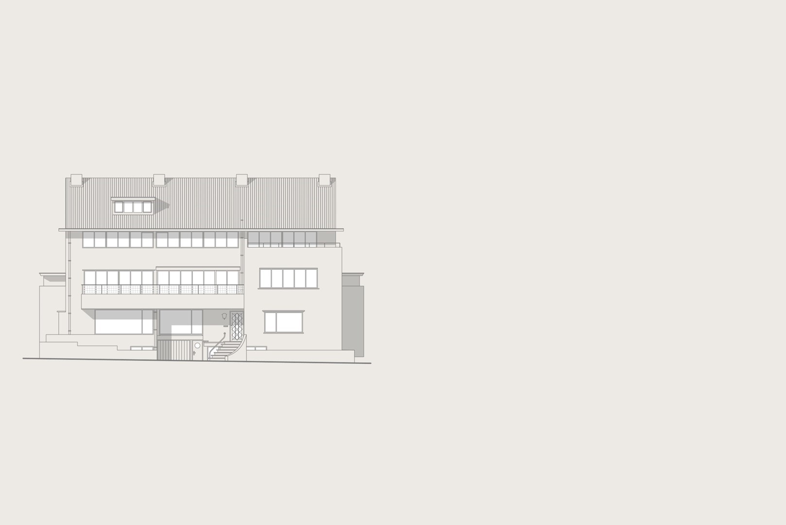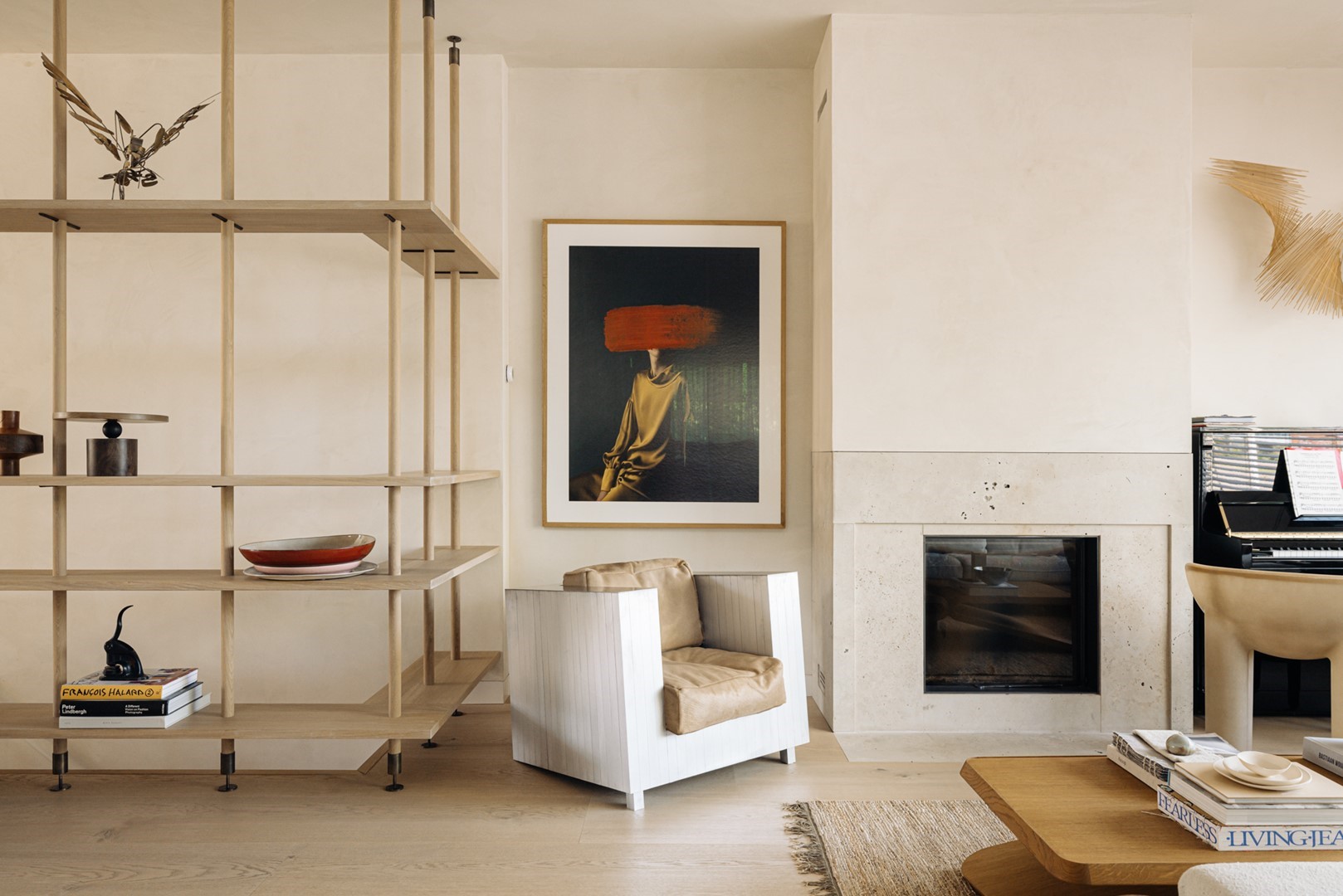 Huize Bonheur presenteert zich met een uitnodigende entree die leidt naar een ruime hal, waar de elegante trap direct de toon zet. Vanuit de hal opent zich een doorkijk naar de woonverdieping van circa 105 m². De woonkamer loopt over in een zijruimte, momenteel ingericht als studeerkamer, afsluitbaar met stalen deuren met glas. Het centrale deel van de verdieping verbindt de woonkamer met de woonkeuken aan de achterzijde. Hier vormen een houten maatwerkkast, gecombineerd met de trap naar de ondergelegen tuinverdieping, een architectonisch element.