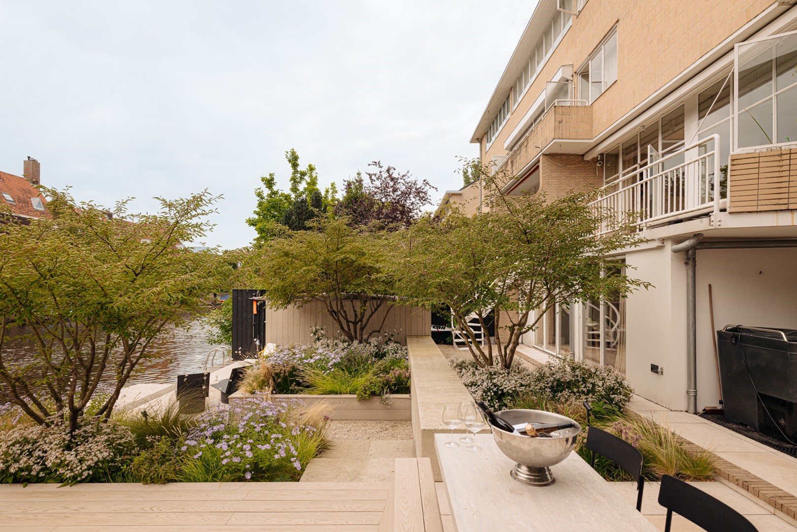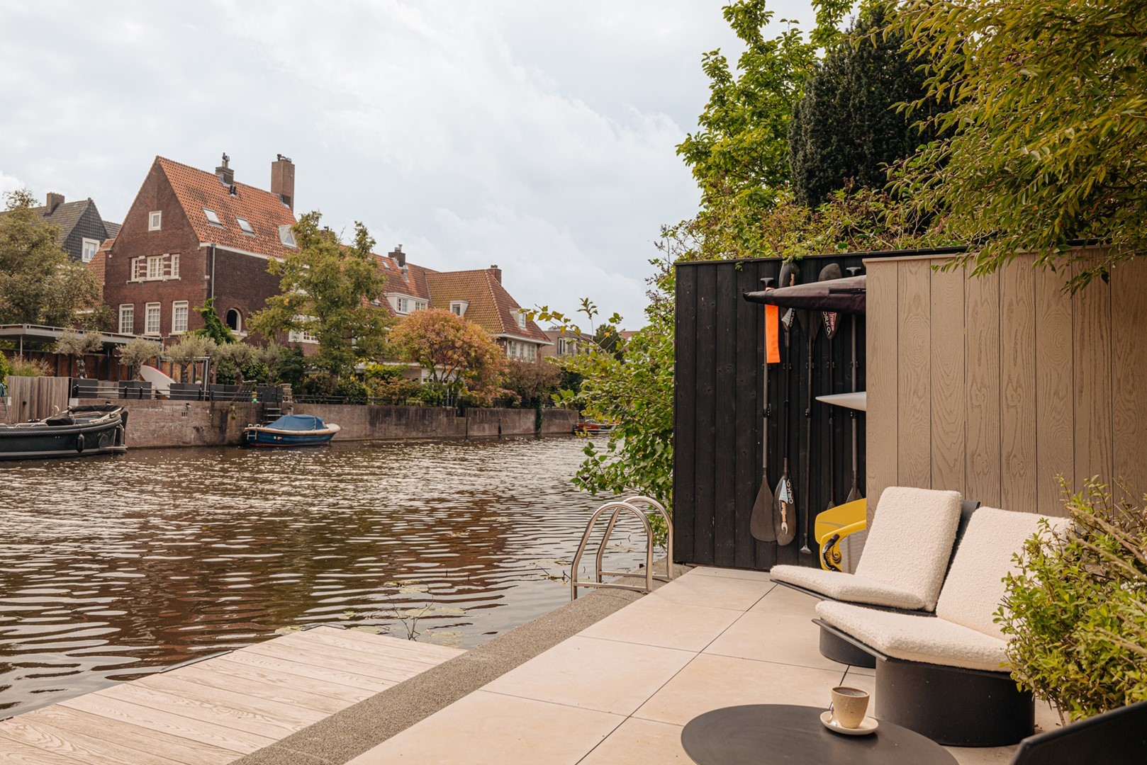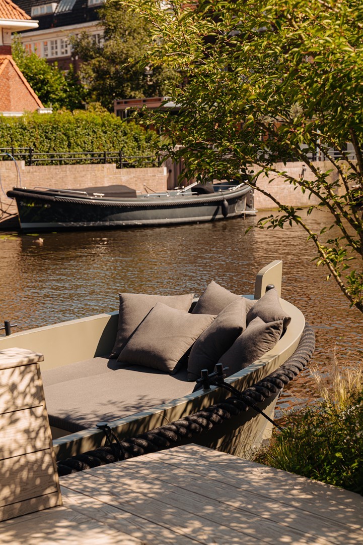 Huize Bonheur welcomes you with an inviting entrance leading into a spacious hallway, where an elegant staircase immediately sets the tone. From here, a sightline opens towards the living level of approximately 105 m². The living room flows into a side room, currently used as a study, which can be closed off with steel-framed glass doors. The central part of the floor connects the living room with the kitchen-diner at the rear. Here, a bespoke wooden cabinet combined with the staircase leading to the lower garden level forms an architectural feature. The kitchen-diner, designed by Studio Eginstill, forms the heart of the home. A long marble worktop, a cooking island in patented bronze, and tall cabinetry in off-white create a timeless aesthetic. The generous proportions, high ceilings, and glass façade with original steel frames ensure a bright and spacious feel. From the kitchen, there is direct access to the sheltered terrace and the waterside garden. High-end Gaggenau appliances, a dedicated barista corner, and extensive workspace and storage complete the kitchen. The dining area comfortably accommodates twelve or more guests, with views over the garden and an abundance of natural light. The covered terrace serves as an extension of the dining area and is used throughout most of the year. The garden level offers multiple functions that enhance comfort and versatility. Thanks to the direct connection to the garden, this level feels like a natural extension of the home. A second entrance makes it particularly practical after sports or outdoor activities. There is also a home cinema and a conservatory, both designed with relaxation in mind. The outdoor space has been carefully landscaped, seamlessly connecting the house, terrace, and water. The sheltered and covered terrace adjoins the kitchen-diner and strengthens the relationship between indoor and outdoor living. The garden offers multiple seating areas, space for play, and facilities for water-based activities, including SUP boards, a rowing boat, and a swimming ladder. The waterside setting brings a sense of calm and a holiday-like atmosphere to everyday life. The front garden has also been designed with both aesthetics and functionality in mind. Lush planting ensures privacy, while the driveway accommodates two to three cars. A separate storage unit provides space for bicycles and outdoor sports equipment.