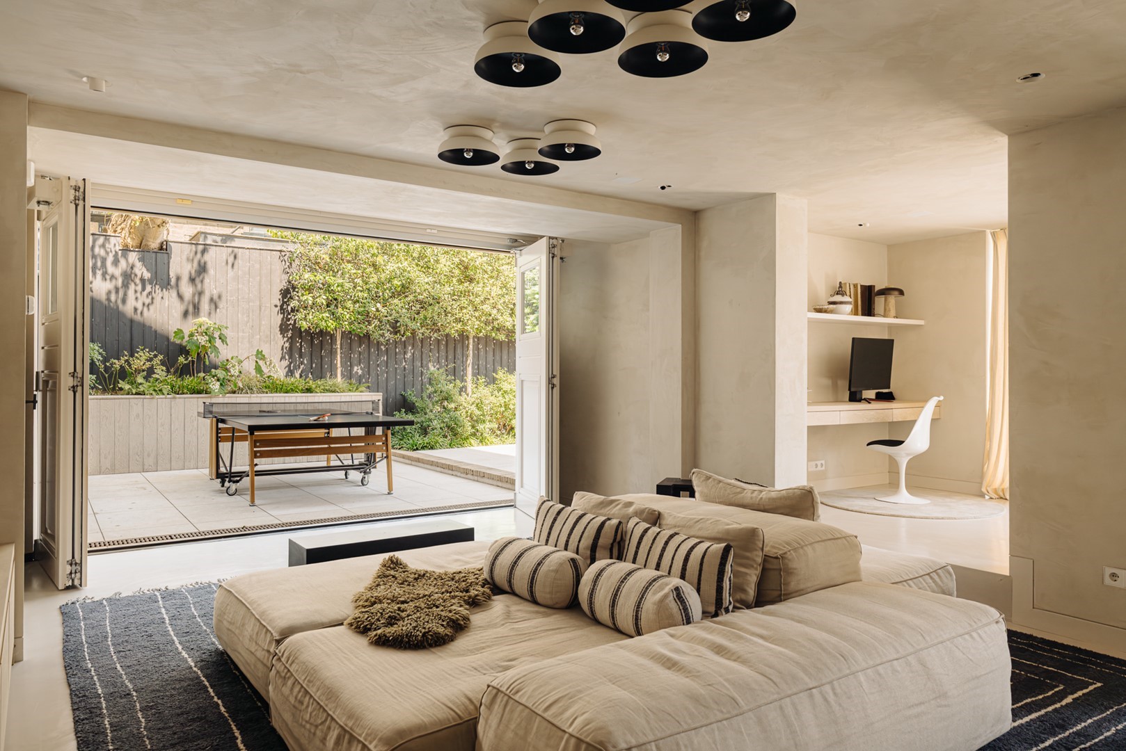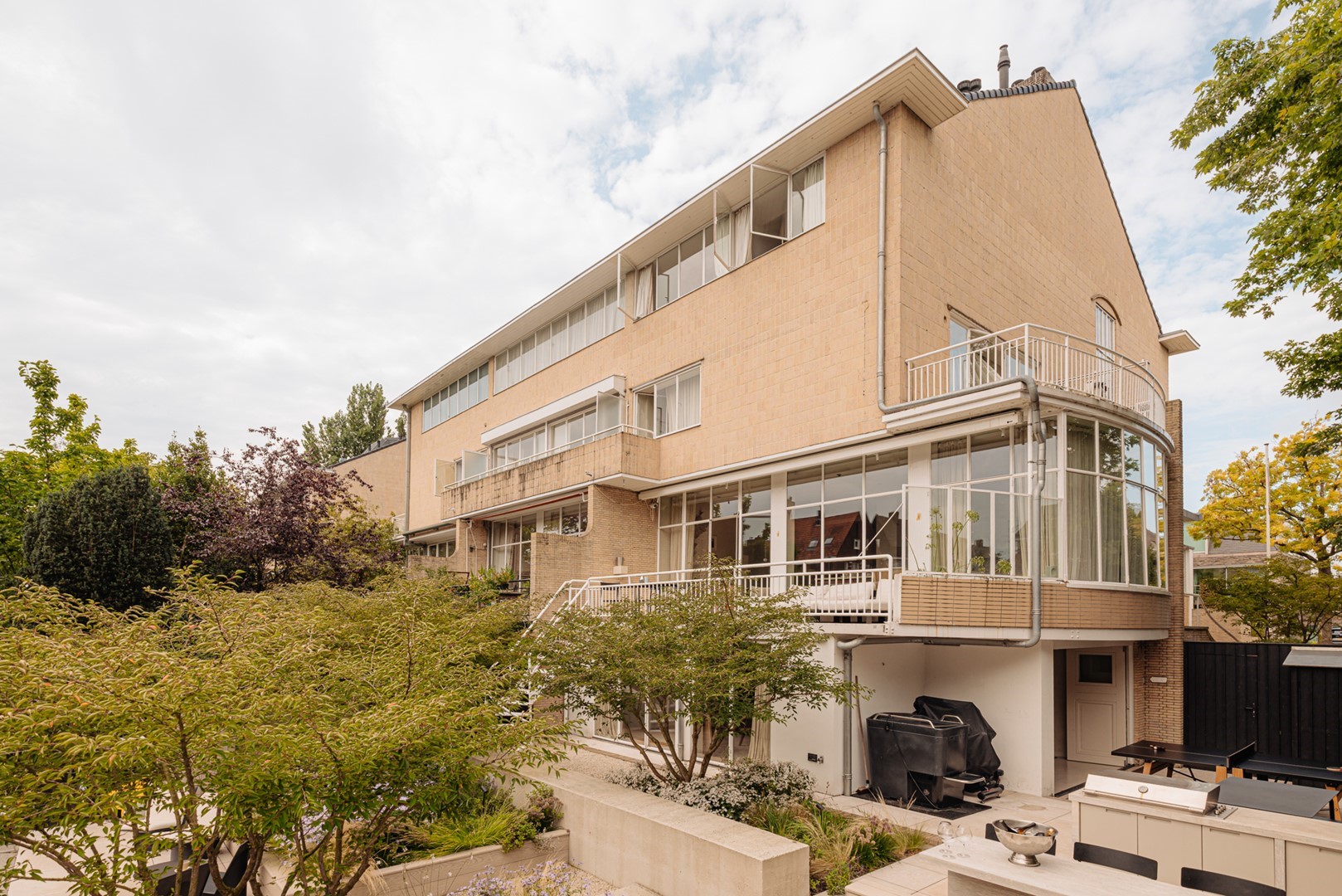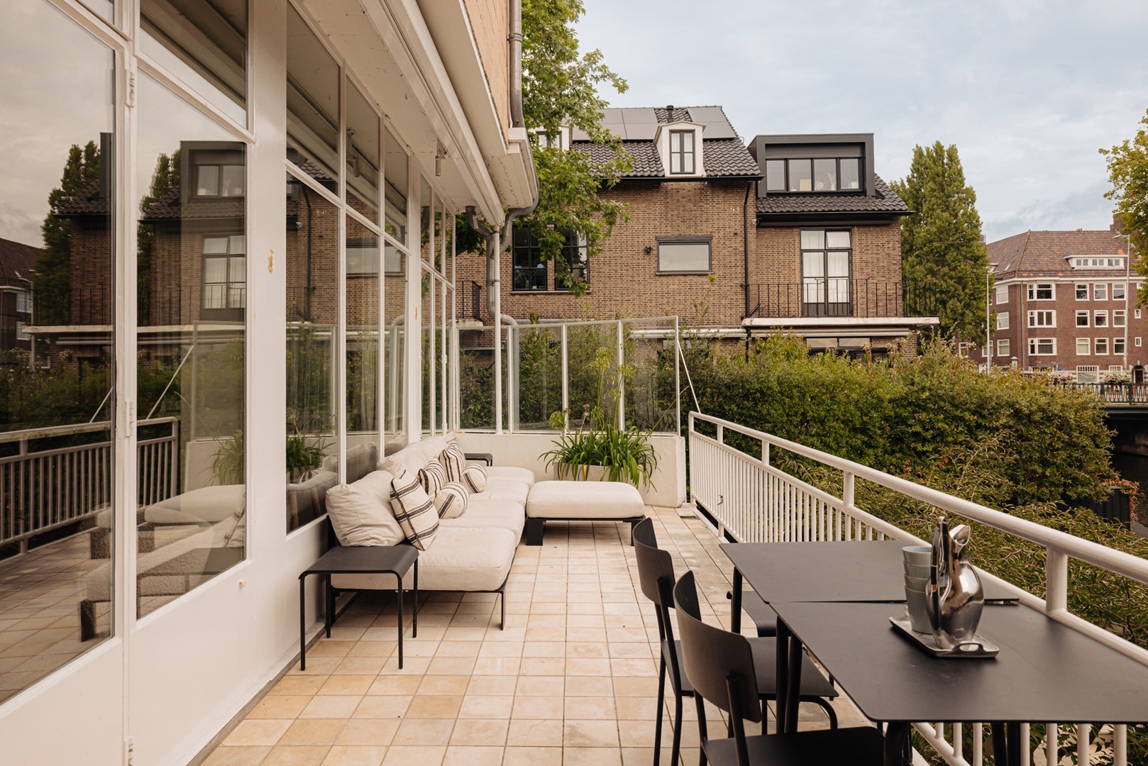 Huize Bonheur welcomes you with an inviting entrance leading into a spacious hallway, where an elegant staircase immediately sets the tone. From here, a sightline opens towards the living level of approximately 105 m². The living room flows into a side room, currently used as a study, which can be closed off with steel-framed glass doors. The central part of the floor connects the living room with the kitchen-diner at the rear. Here, a bespoke wooden cabinet combined with the staircase leading to the lower garden level forms an architectural feature. The kitchen-diner, designed by Studio Eginstill, forms the heart of the home. A long marble worktop, a cooking island in patented bronze, and tall cabinetry in off-white create a timeless aesthetic. The generous proportions, high ceilings, and glass façade with original steel frames ensure a bright and spacious feel. From the kitchen, there is direct access to the sheltered terrace and the waterside garden. High-end Gaggenau appliances, a dedicated barista corner, and extensive workspace and storage complete the kitchen. The dining area comfortably accommodates twelve or more guests, with views over the garden and an abundance of natural light. The covered terrace serves as an extension of the dining area and is used throughout most of the year. The garden level offers multiple functions that enhance comfort and versatility. Thanks to the direct connection to the garden, this level feels like a natural extension of the home. A second entrance makes it particularly practical after sports or outdoor activities. There is also a home cinema and a conservatory, both designed with relaxation in mind. The outdoor space has been carefully landscaped, seamlessly connecting the house, terrace, and water. The sheltered and covered terrace adjoins the kitchen-diner and strengthens the relationship between indoor and outdoor living. The garden offers multiple seating areas, space for play, and facilities for water-based activities, including SUP boards, a rowing boat, and a swimming ladder. The waterside setting brings a sense of calm and a holiday-like atmosphere to everyday life. The front garden has also been designed with both aesthetics and functionality in mind. Lush planting ensures privacy, while the driveway accommodates two to three cars. A separate storage unit provides space for bicycles and outdoor sports equipment.