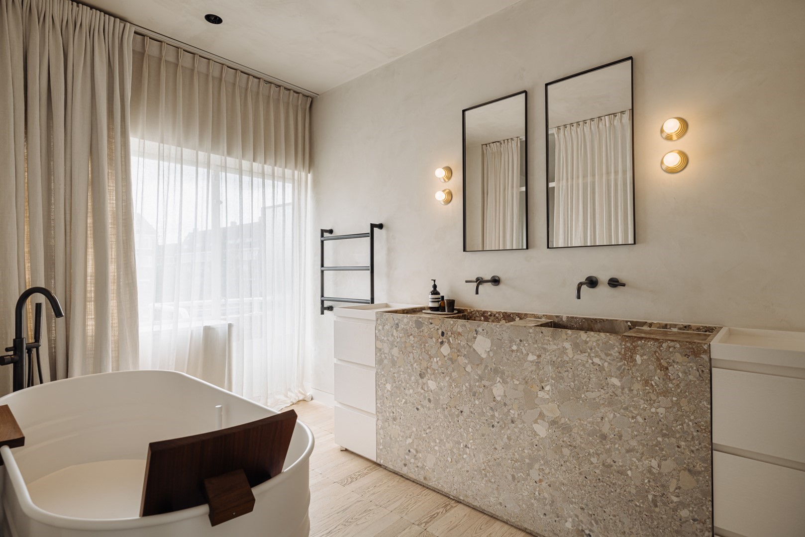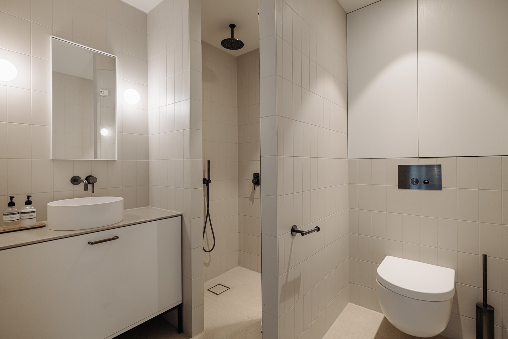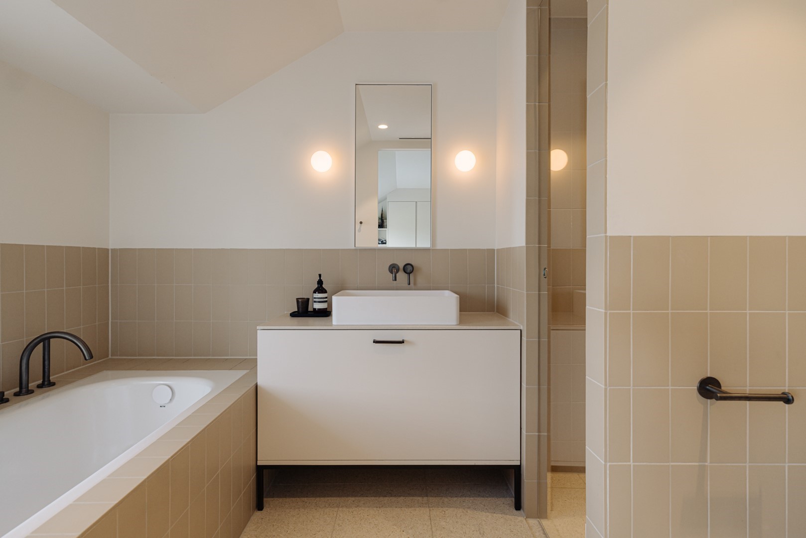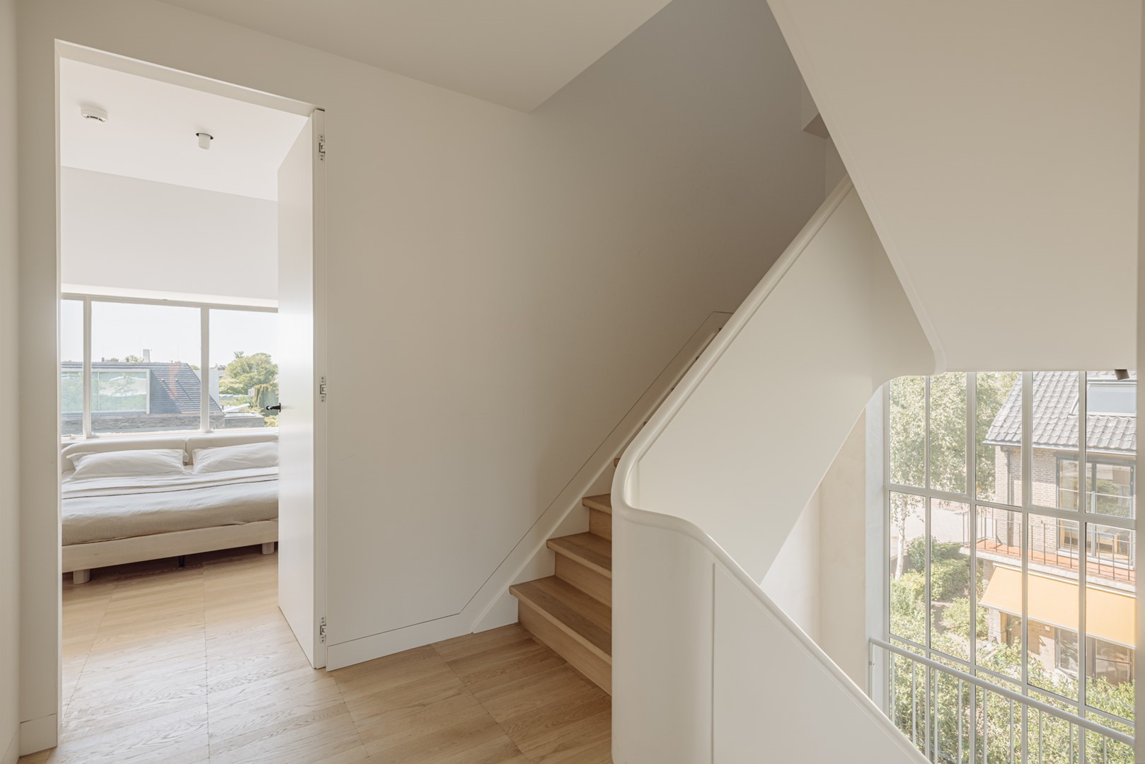 The sleeping quarters are spread across two floors and the attic level. A curved staircase, visible from the living level, together with the open void, forms an architectural centrepiece connecting the floors. The first floor is arranged as the main bedroom suite, with a bedroom of over 30 m² at the garden and waterside, directly connected to a bathroom and walk-in wardrobe. From the bedroom, a balcony offers views over greenery and water. The bathroom is designed as a private wellness space, featuring a bathtub, a spacious walk-in shower, double vanity, and a separate toilet. Adjacent is a walk-in wardrobe of approximately 10 m². At the front of this floor is a second room, currently used as a study or guest room, with access to a west-facing roof terrace. The monumental staircase, illuminated by a tall vertical window, leads to the children’s floor. Here you will find three comfortable bedrooms, each with built-in wardrobes and ample space for both play and study. A dedicated bathroom makes this level particularly suitable for growing children. The attic level forms a self-contained domain. A charming loft room with wide views over Amsterdam South can serve as a teenager’s room, guest room, or studio, and forms the crowning feature of the home.