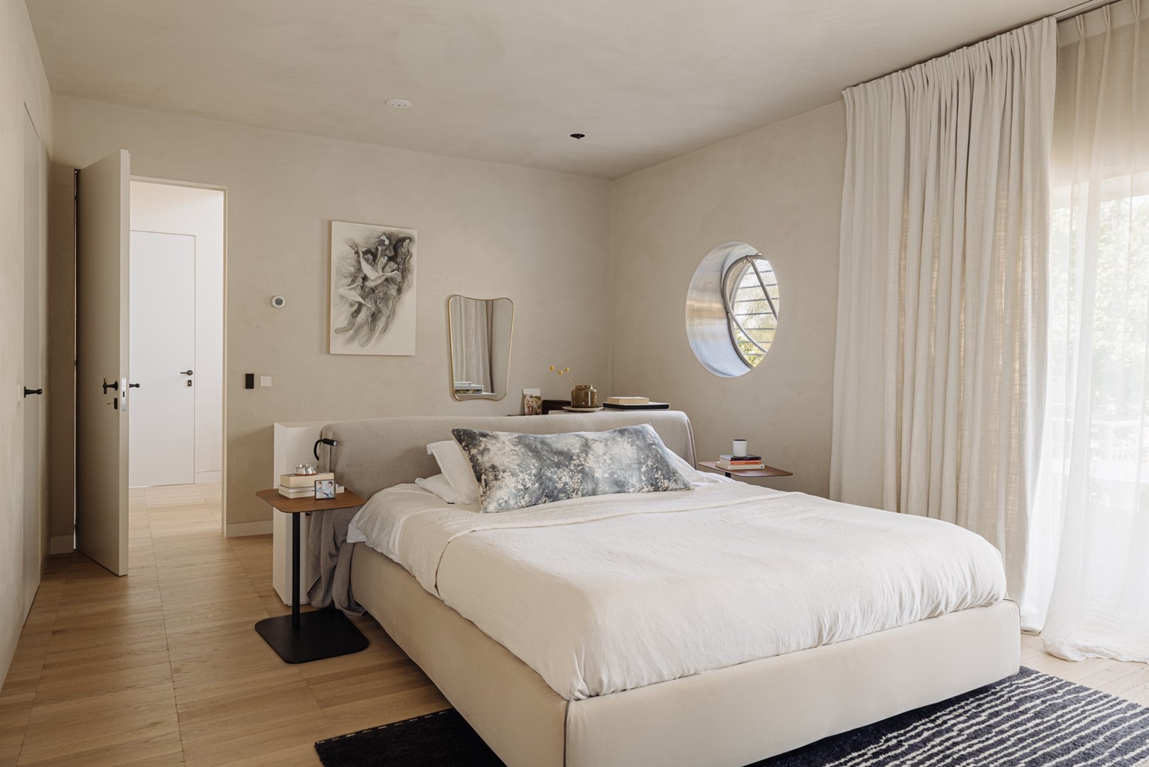 Het slaapgedeelte strekt zich uit over twee verdiepingen en de kapverdieping. Een ronde trap, zichtbaar vanuit de woonverdieping, vormt samen met de vide een architectonisch middelpunt en verbindt de leeflaag met de eerste verdieping. Deze verdieping is ingericht als ouderverdieping, met een slaapkamer van ruim 30 m² aan de tuin- en waterzijde, direct verbonden met een badkamer en inloopkast. Vanuit de slaapkamer leidt een balkon naar uitzicht over groen en water. De badkamer is ontworpen als privé-wellness, met ligbad, royale inloopdouche, dubbele wastafel en separaat toilet. Aangrenzend bevindt zich een inloopkast van circa 10 m². Aan de straatzijde ligt een tweede kamer, thans ingericht als werkkamer of logeerkamer, met toegang tot een dakterras op het westen.