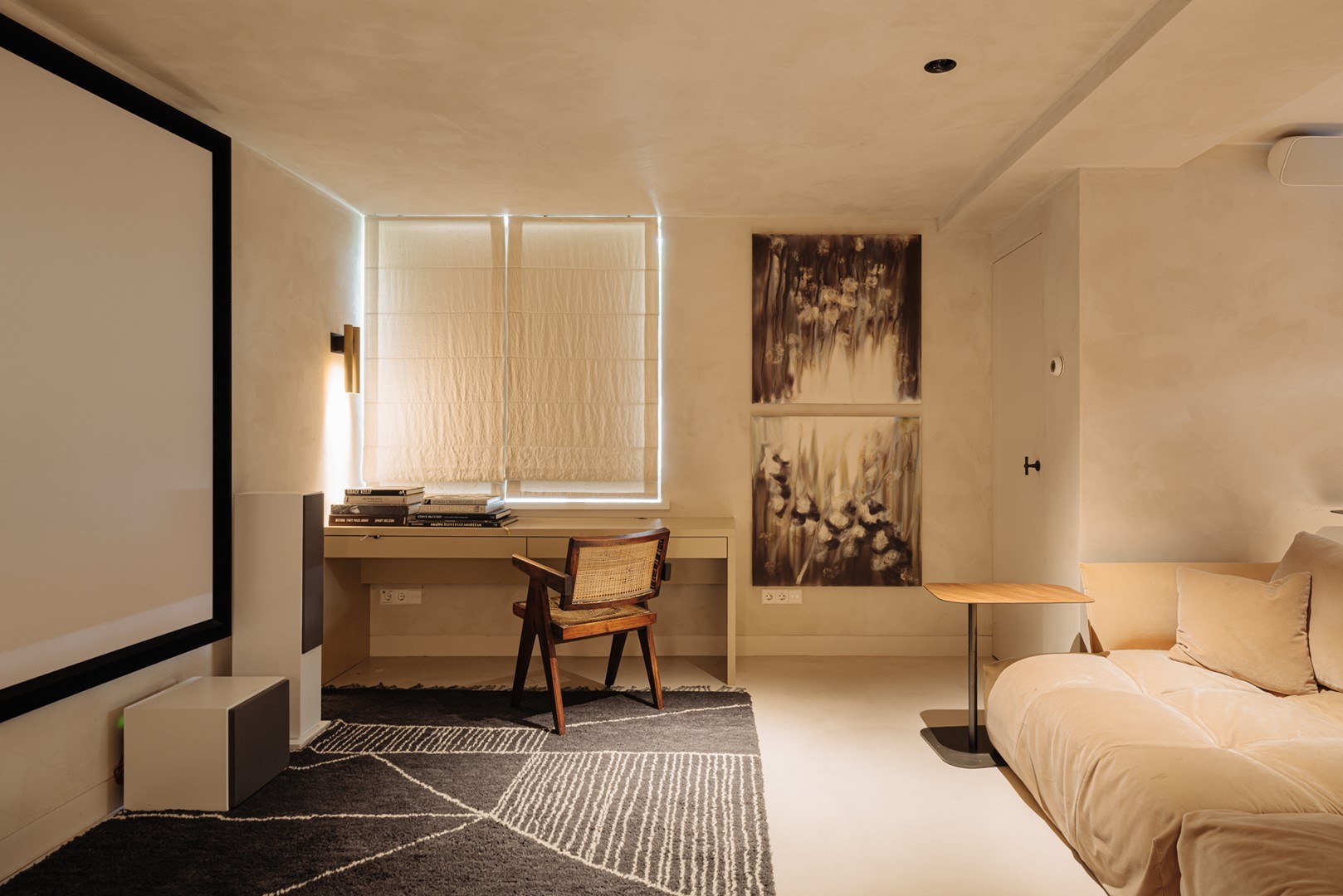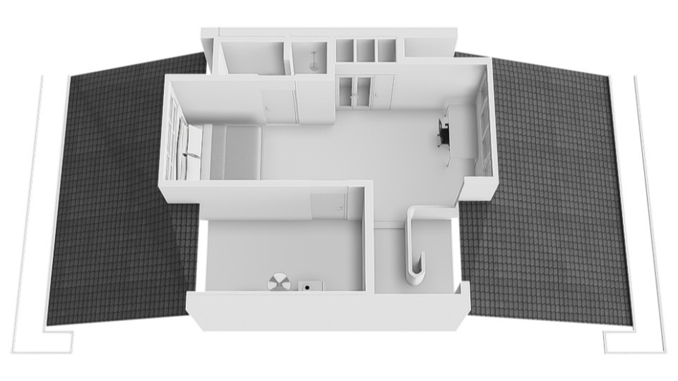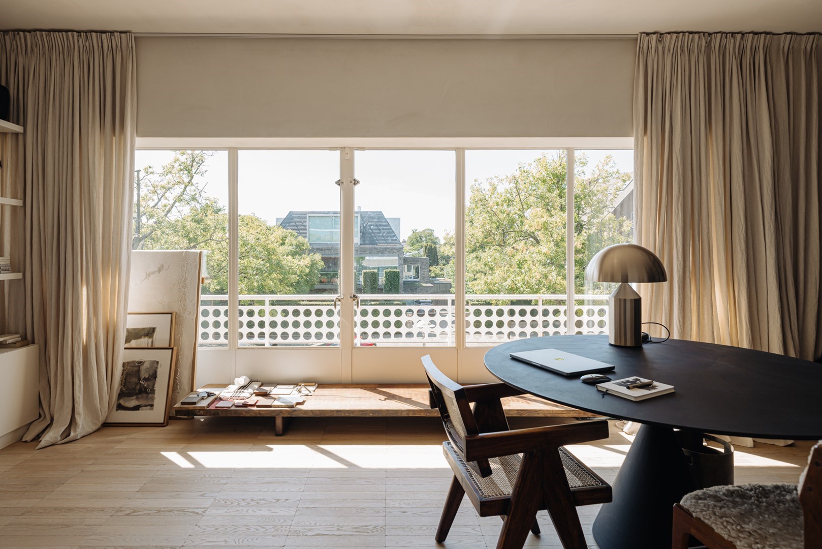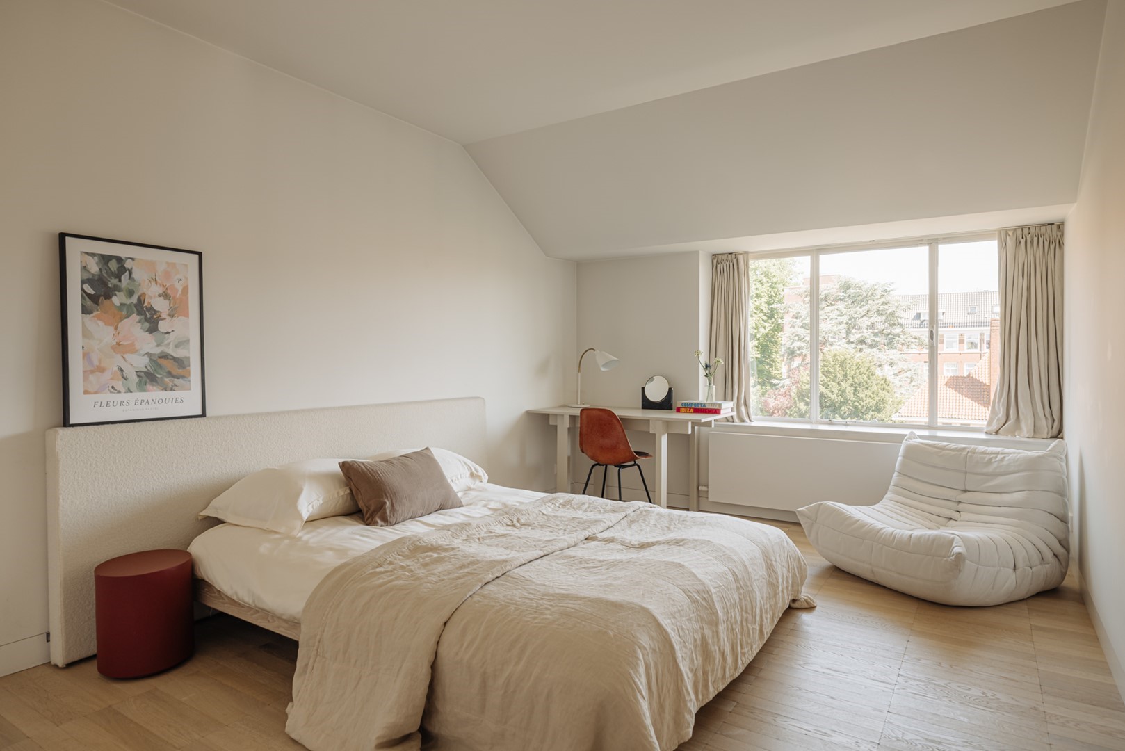 De kapverdieping vormt een zelfstandig domein. Een sfeervolle zolderkamer met weids uitzicht over Amsterdam-Zuid biedt ruimte als tienerkamer, logeerkamer of atelier en vormt de kroon op de woning.