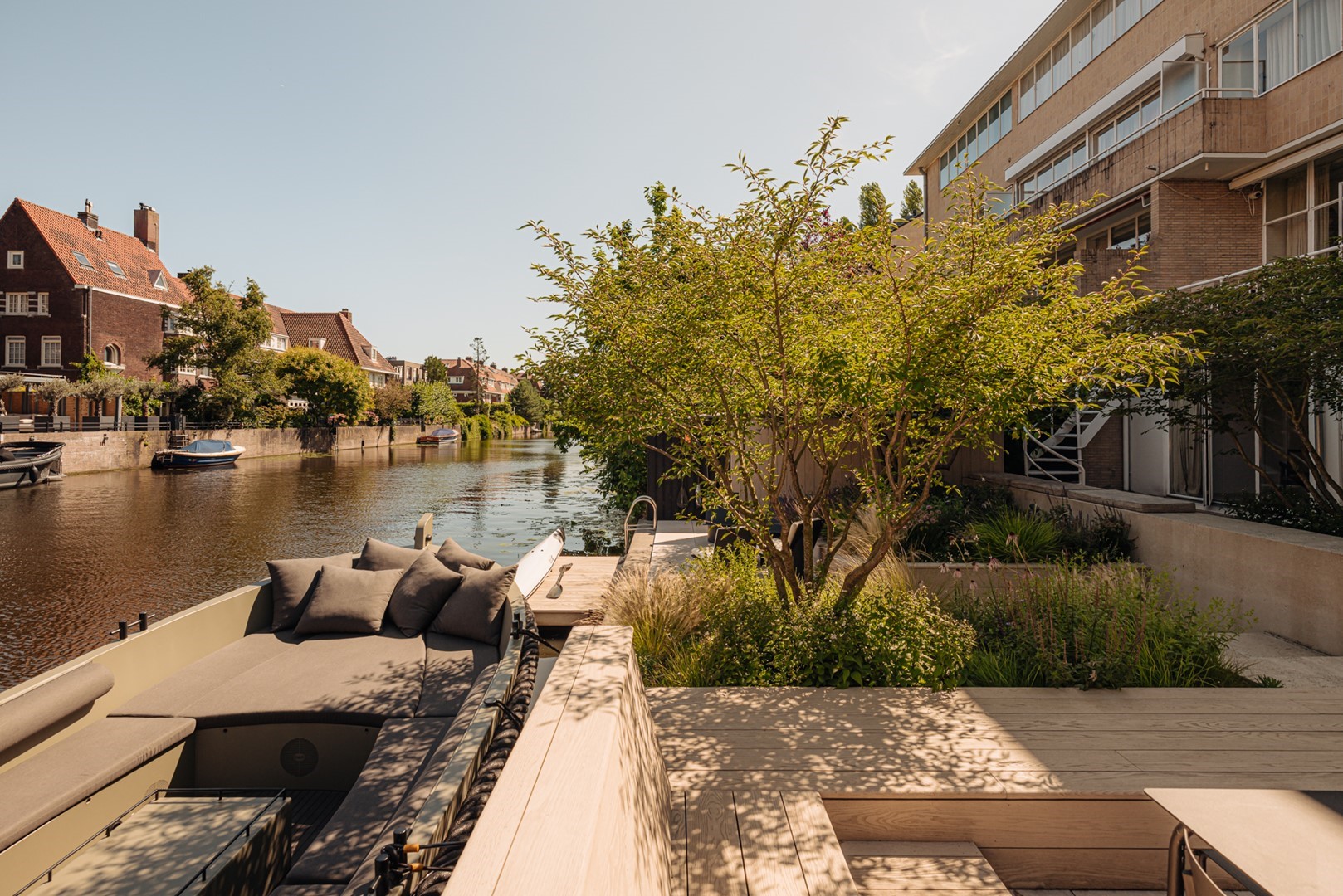 • Tuin rond om en aan het water; terras van circa 21 m² grenzend aan de woonkeuken