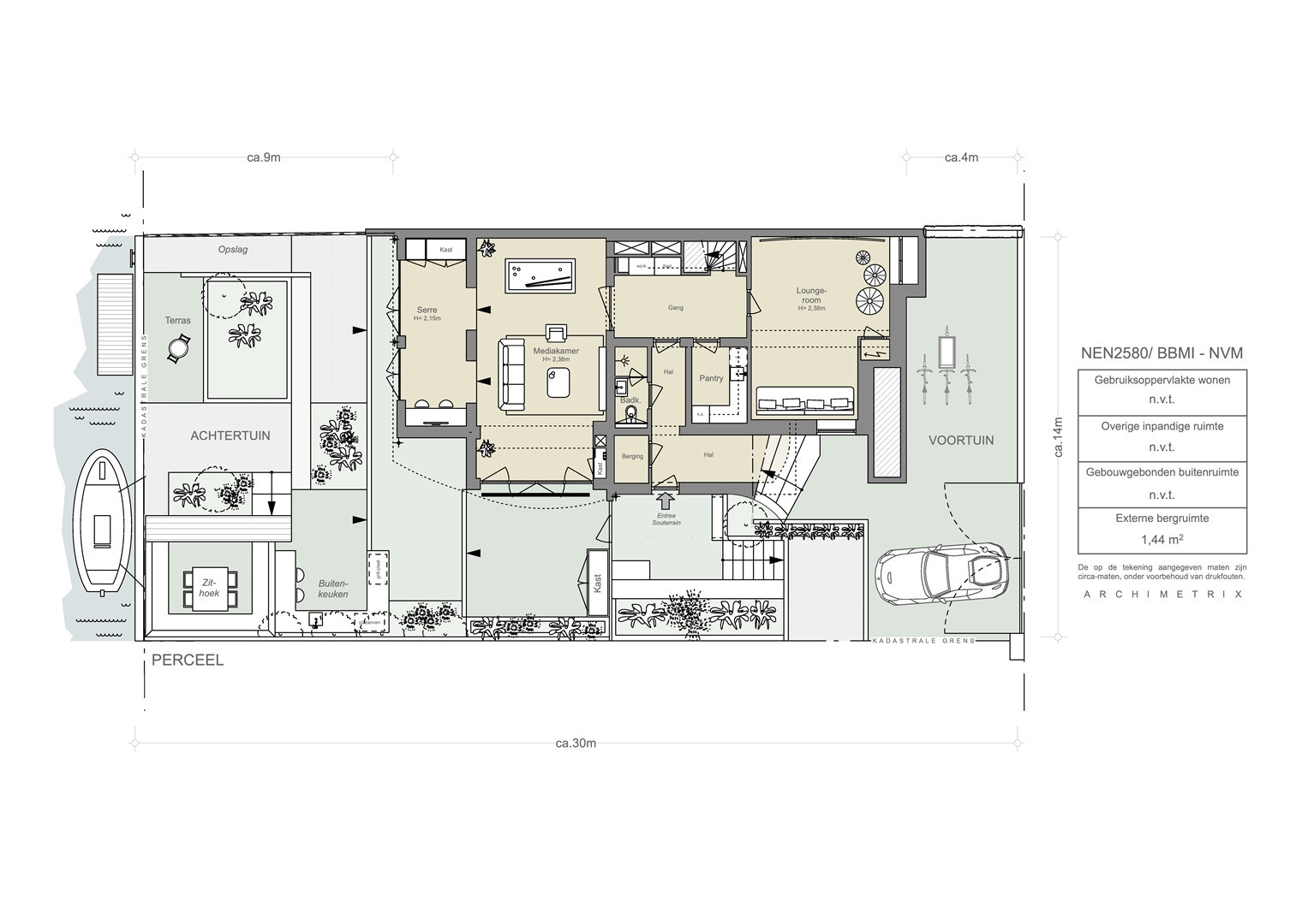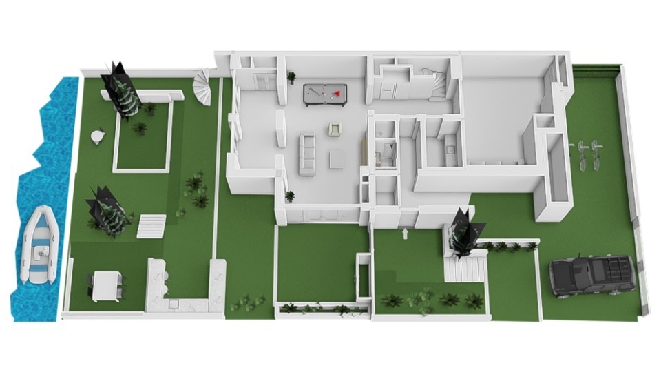 De tuinverdieping beschikt over meerdere functies die comfort en veelzijdigheid toevoegen. Dankzij de directe overgang naar de tuin voelt deze verdieping als een vanzelfsprekend onderdeel van het totaalconcept. Een tweede entree maakt de ruimte praktisch na het sporten of wandelen. Verder zijn er een home cinema en een serre, beide ontworpen met aandacht voor ontspanning. De tuin vormt hierbij een groen decor dat vanuit elke hoek zichtbaar is. De buitenruimte is zorgvuldig aangelegd en verbindt huis, terras en water tot een harmonieus geheel. Het beschutte en overdekte terras grenst direct aan de woonkeuken en versterkt de relatie tussen binnen en buiten. De tuin biedt meerdere zitplekken, ruimte voor spel en voorzieningen voor waterrecreatie, waaronder SUP-boards, een roeiboot en een zwemtrap. De waterkant brengt rust en een vakantiegevoel in het dagelijks leven. Ook de voortuin is ontworpen met oog voor esthetiek en functionaliteit. Groene beplanting waarborgt privacy en de oprit biedt plaats aan twee à drie auto’s. Een aparte berging biedt ruimte voor fietsen en buitensportattributen.