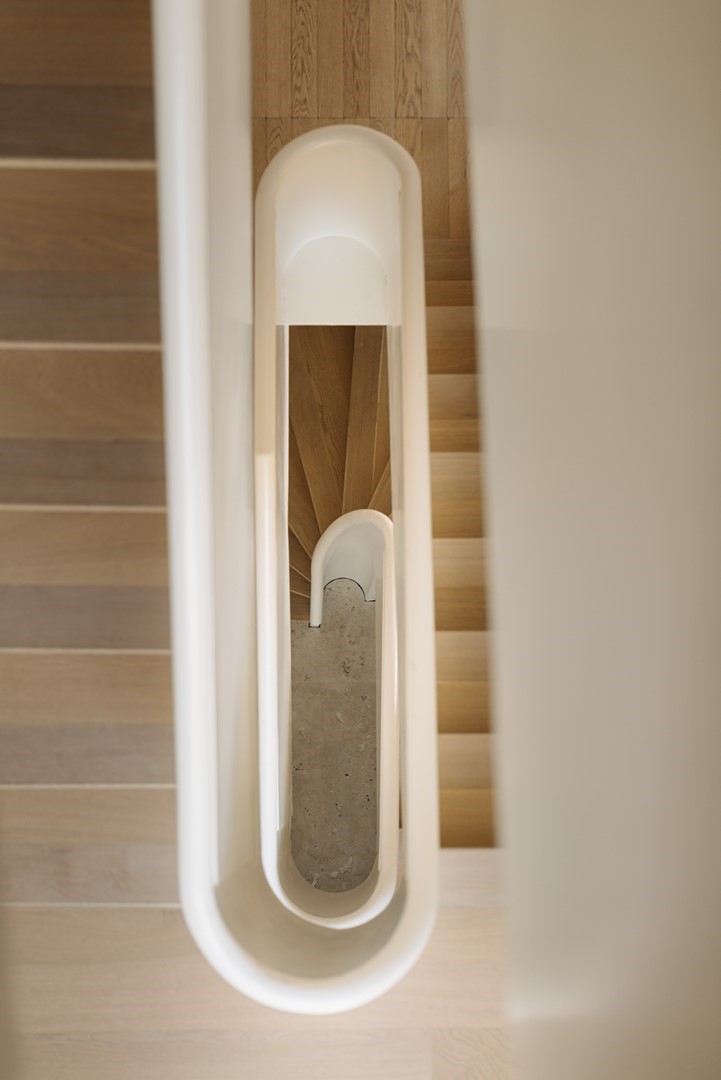 Het monumentale trappenhuis, verlicht door een hoog verticaal raam, leidt naar de kinderslaapverdieping. Hier bevinden zich drie comfortabele slaapkamers, elk met ingebouwde kasten en voldoende ruimte voor spel en studie. Een eigen badkamer maakt deze verdieping bijzonder geschikt voor opgroeiende kinderen.