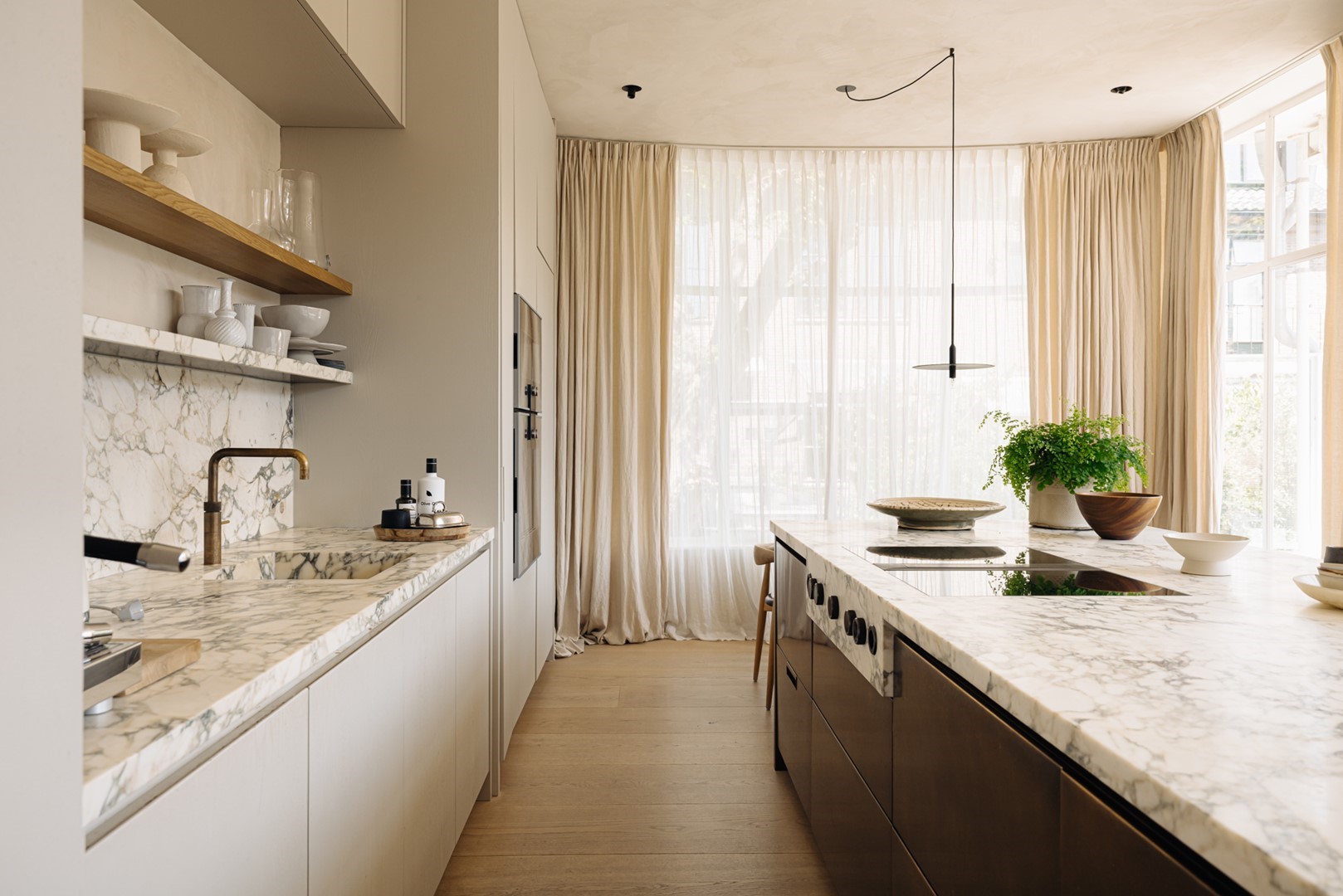 De woonkeuken is ontworpen door Studio Eginstill en vormt het kloppend hart van de woning. Een lang marmeren werkblad, een kookeiland in gepatenteerd brons en hoge kasten in gebroken wit creëren een tijdloze uitstraling. De royale maatvoering, de hoge plafonds en de glazen pui met originele stalen profielen zorgen voor een lichte en ruimtelijke beleving. Vanuit de keuken is er directe toegang tot het beschutte terras en de tuin aan het water. Hoogwaardige apparatuur van Gaggenau, een baristahoek en uitgebreide werk- en bergruimte maken de keuken compleet. Het eetgedeelte biedt plaats aan een gezelschap van twaalf of meer personen, met uitzicht op de tuin en overvloedig daglicht. Het overdekte terras fungeert als verlengstuk van de eetkamer en wordt vrijwel het gehele jaar benut.