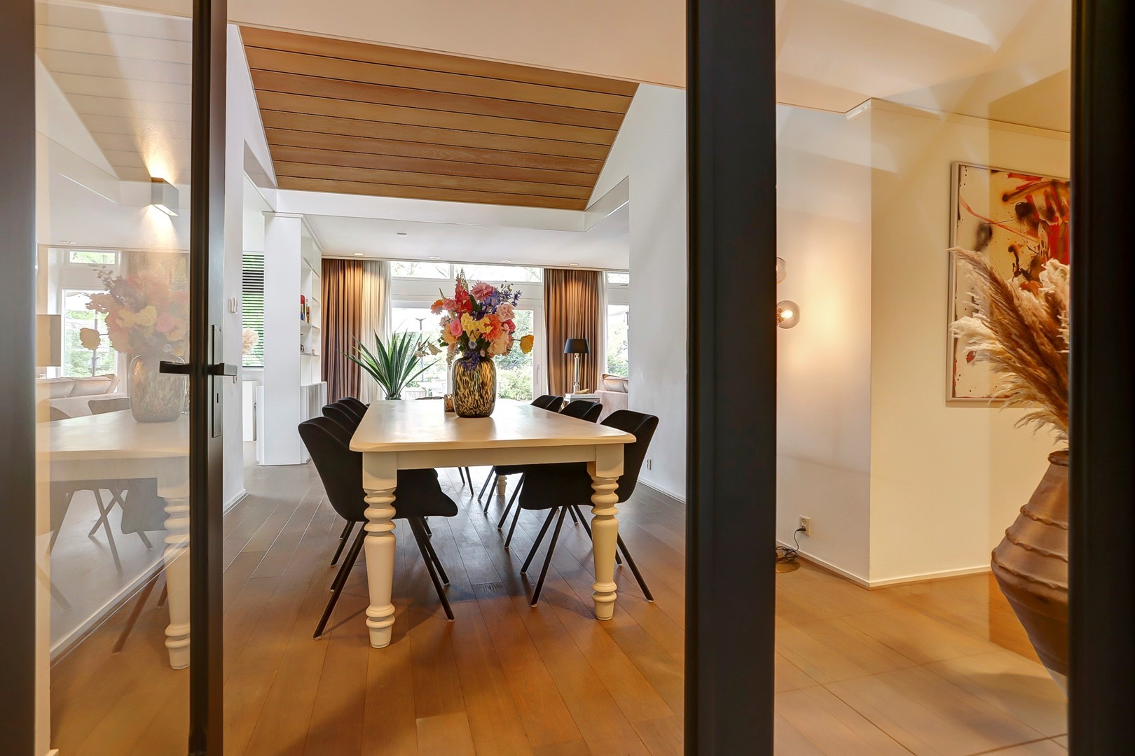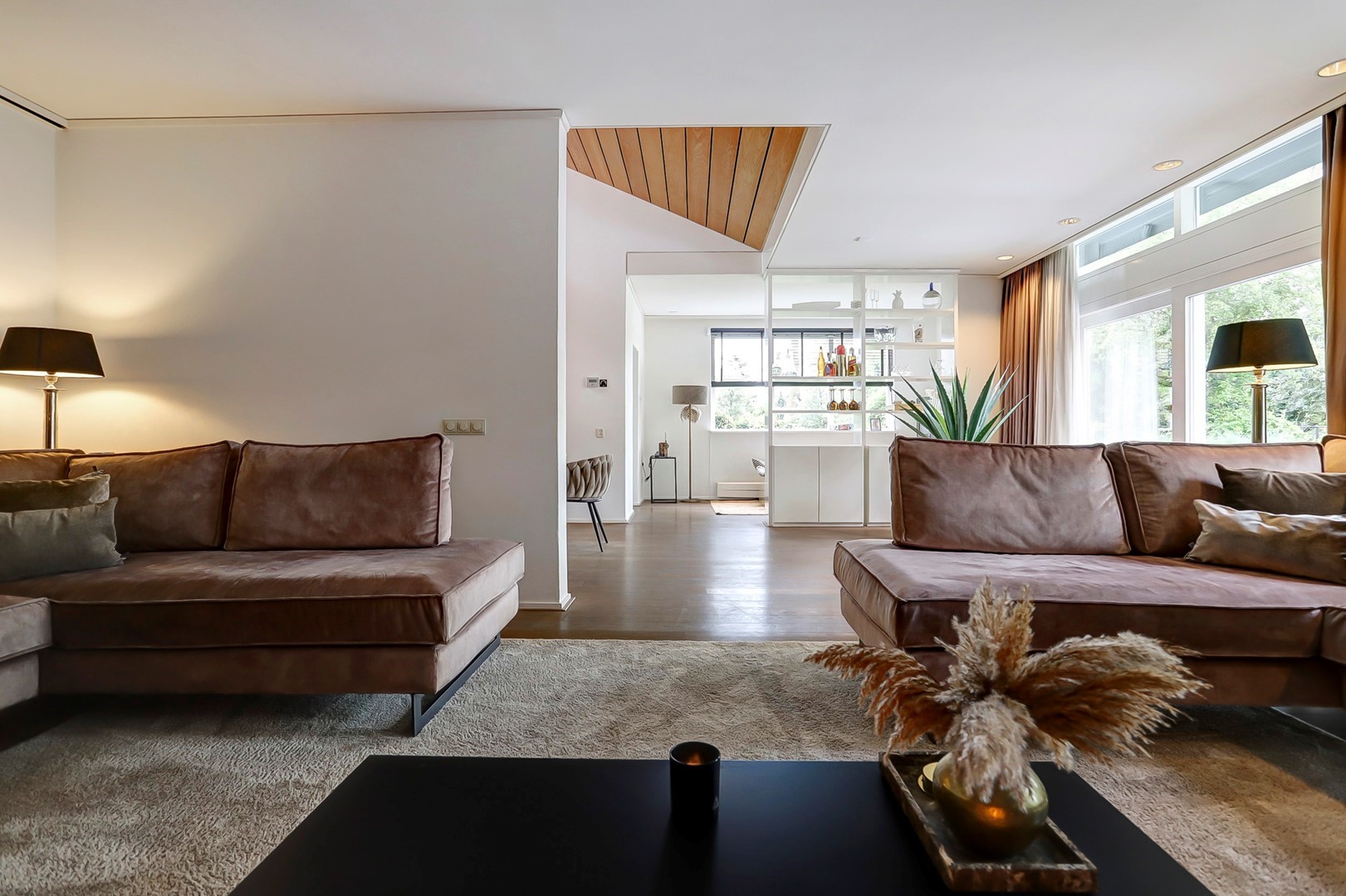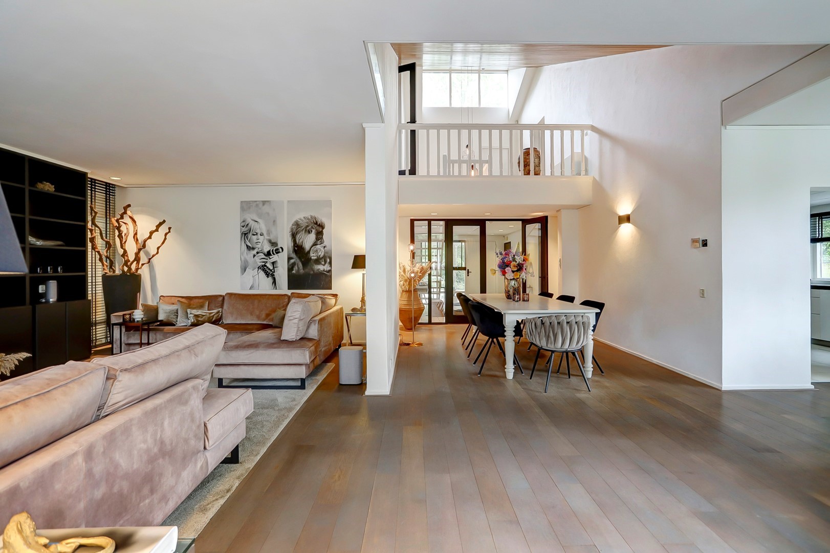 Dubbele glazen deuren geven toegang tot het woongedeelte, waar de eethoek centraal is gesitueerd onder het hoge plafond en de vide. Grote raampartijen en een schuifpui zorgen voor een directe verbinding met het terras en de tuin. Aan de rechterzijde bevindt zich de living met haardpartij en ingebouwde kastenwand. Aan de linkerzijde ligt een besloten gameruimte. Aansluitend bevindt zich de woonkeuken, voorzien van een kookplaat met afzuigkap, combi-oven, koelkast, vriezer en vaatwasser. De aangrenzende bijkeuken beschikt over een achterentree, wasruimte en een tweede keukenblok met spoelbak en koel-/vriescombinatie.