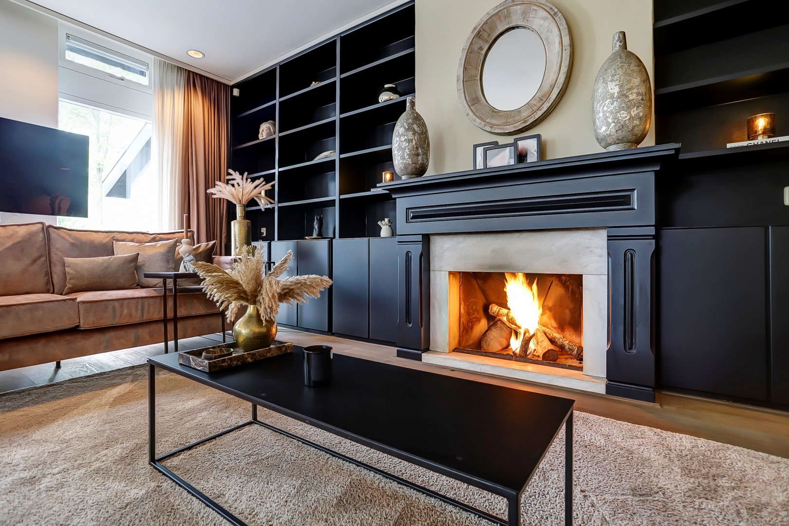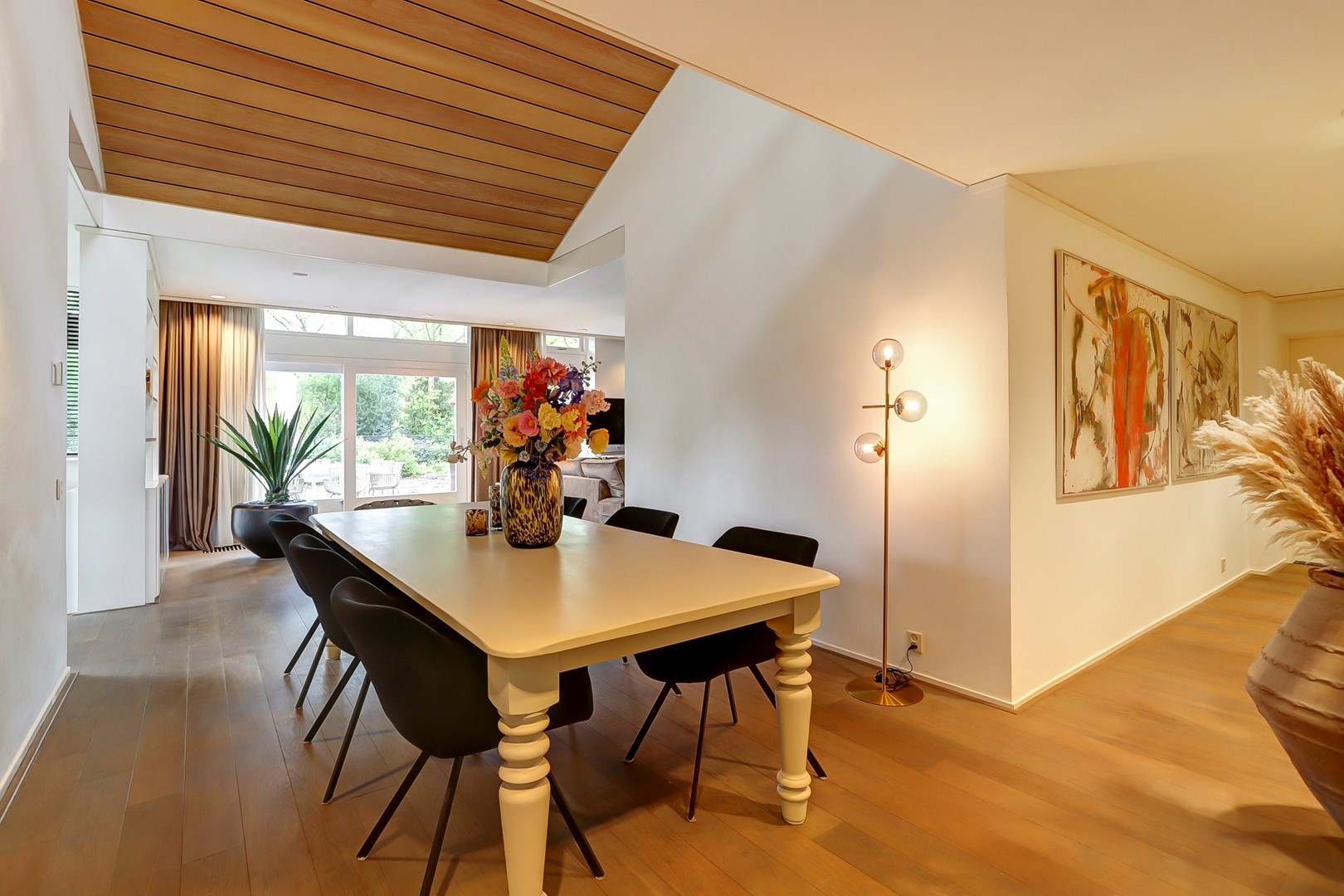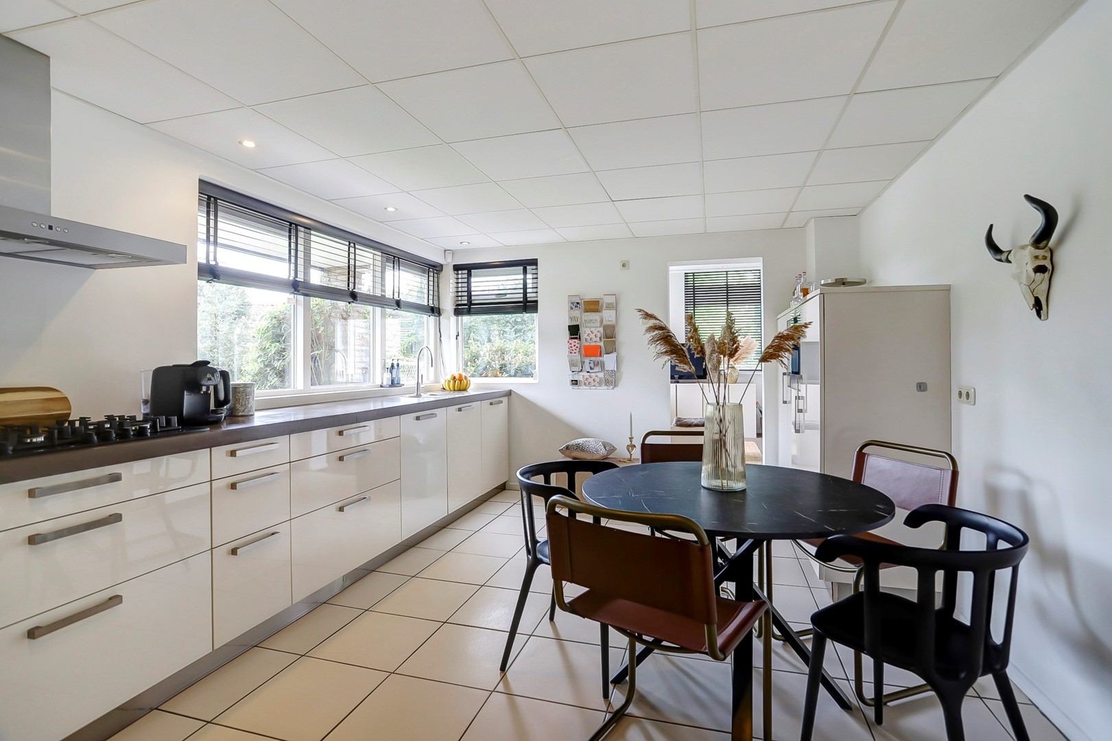 Dubbele glazen deuren geven toegang tot het woongedeelte, waar de eethoek centraal is gesitueerd onder het hoge plafond en de vide. Grote raampartijen en een schuifpui zorgen voor een directe verbinding met het terras en de tuin. Aan de rechterzijde bevindt zich de living met haardpartij en ingebouwde kastenwand. Aan de linkerzijde ligt een besloten gameruimte. Aansluitend bevindt zich de woonkeuken, voorzien van een kookplaat met afzuigkap, combi-oven, koelkast, vriezer en vaatwasser. De aangrenzende bijkeuken beschikt over een achterentree, wasruimte en een tweede keukenblok met spoelbak en koel-/vriescombinatie.
