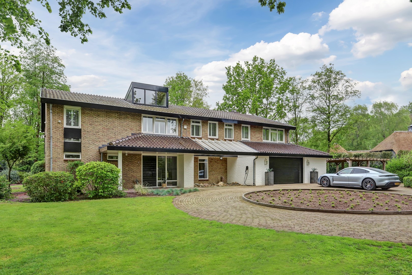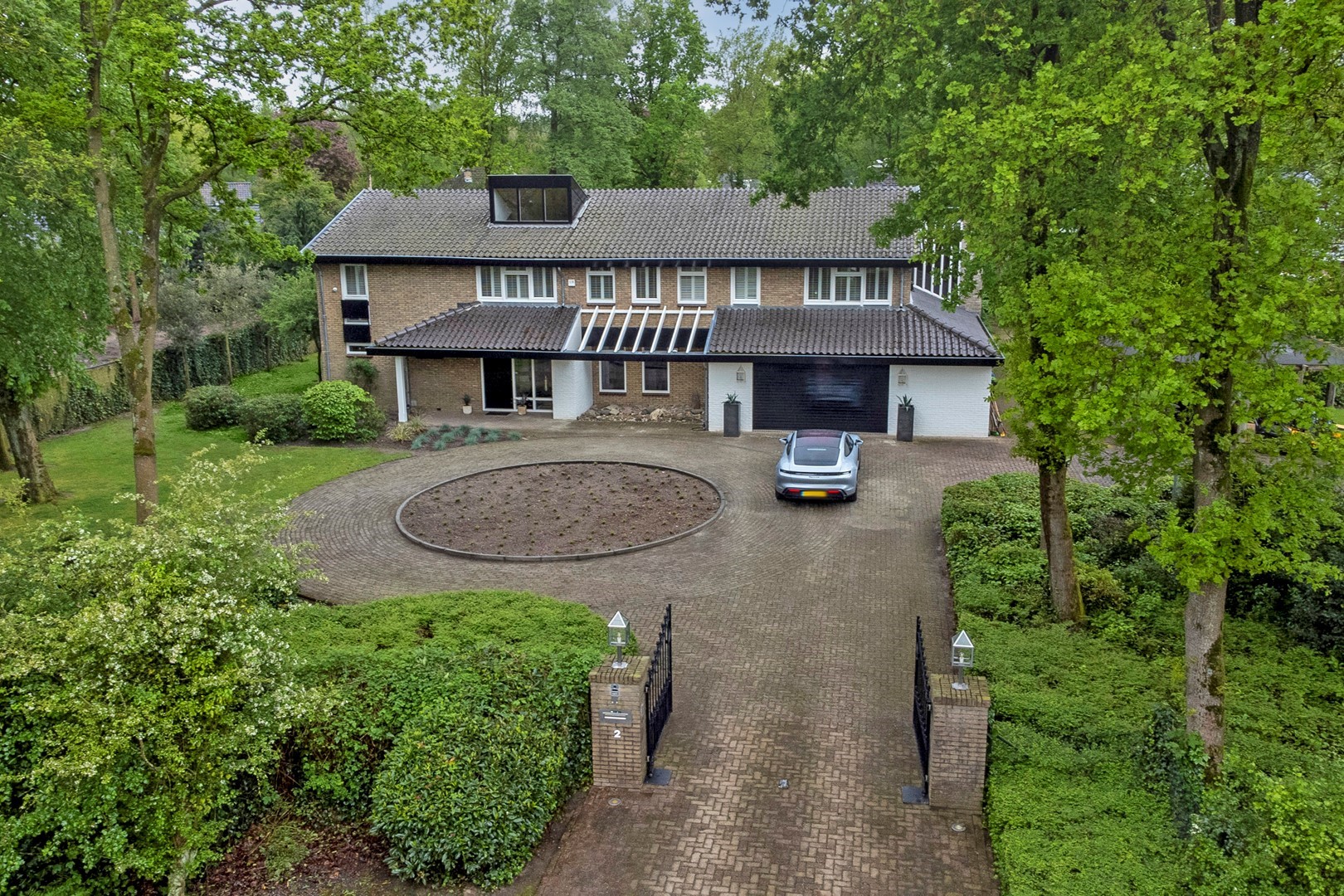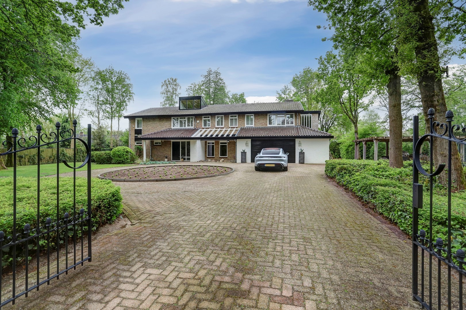 Via het elektrische toegangshek bereikt u de royale oprit met carport voor twee auto’s, vormgegeven met een rotonde omgeven door gras, bomen en struiken. Een verzorgd pad leidt naar de overdekte entree. In de ruime hal bevinden zich een garderobe, een royale toiletruimte, intercom, uitgebreide alarminstallatie en een indrukwekkende trapopgang met vide.