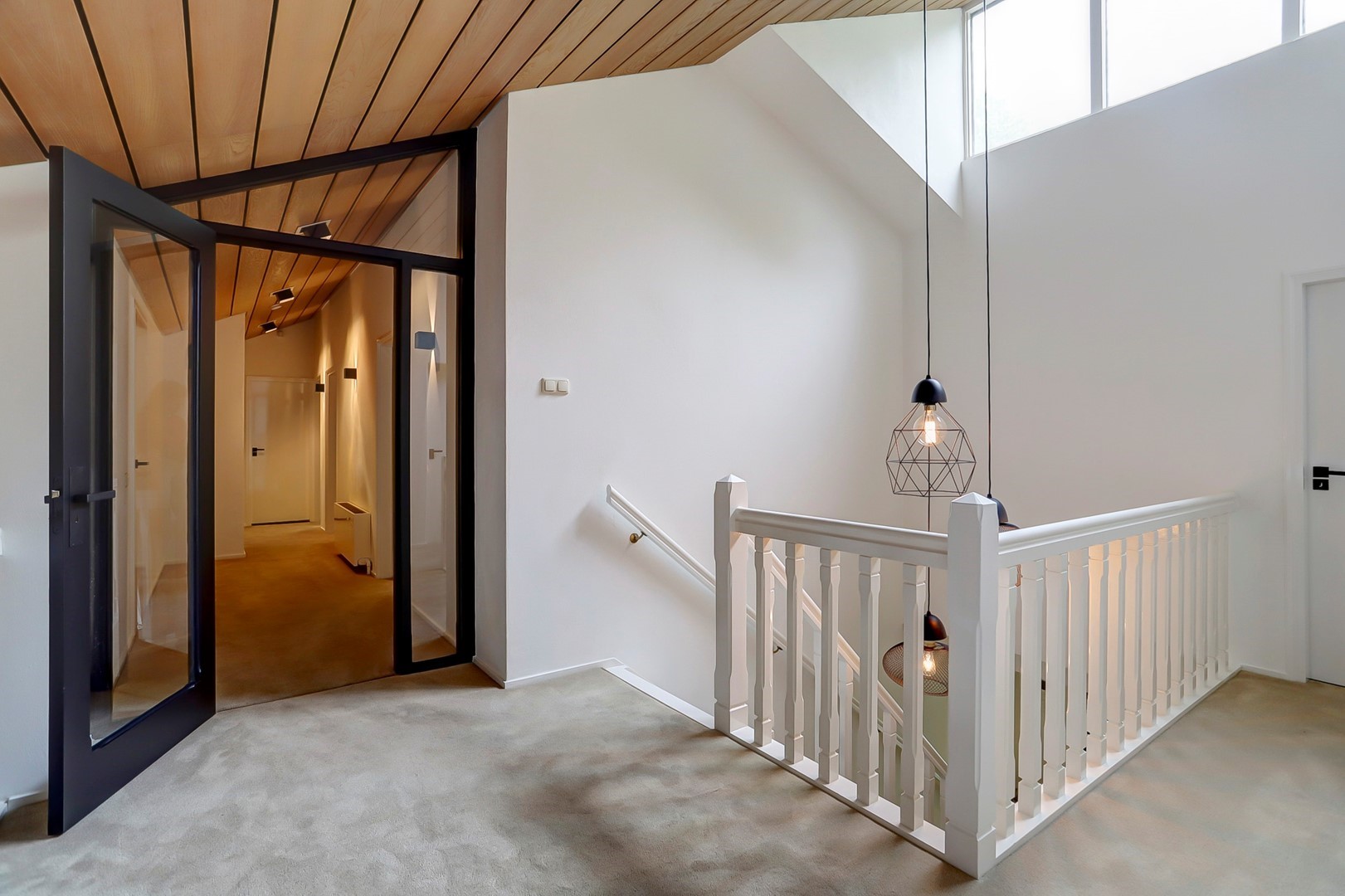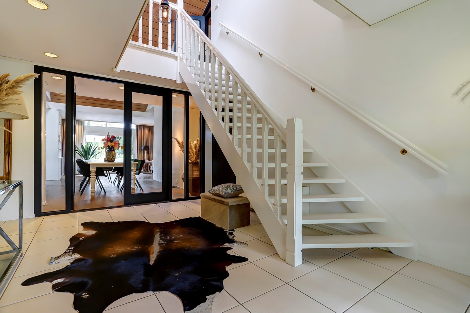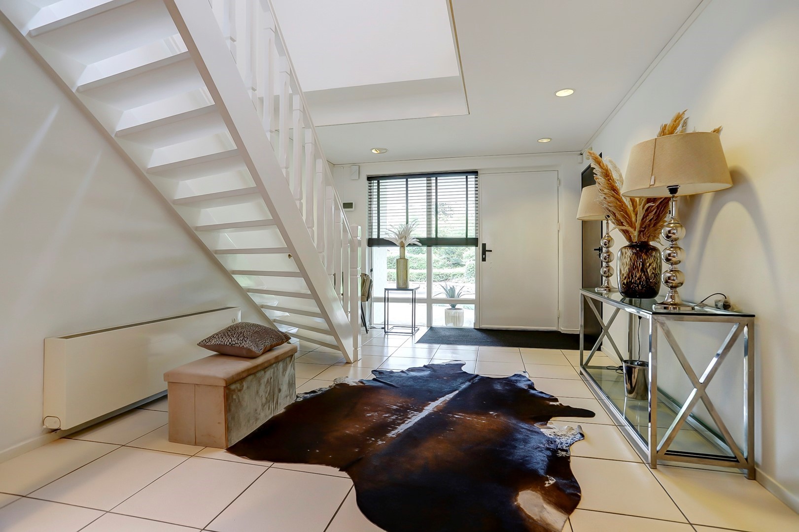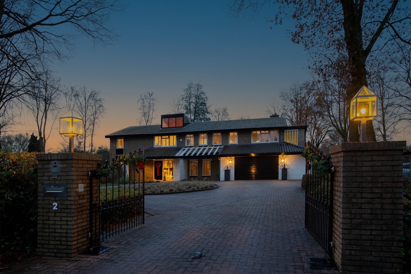 Via het elektrische toegangshek bereikt u de royale oprit met carport voor twee auto’s, vormgegeven met een rotonde omgeven door gras, bomen en struiken. Een verzorgd pad leidt naar de overdekte entree. In de ruime hal bevinden zich een garderobe, een royale toiletruimte, intercom, uitgebreide alarminstallatie en een indrukwekkende trapopgang met vide.