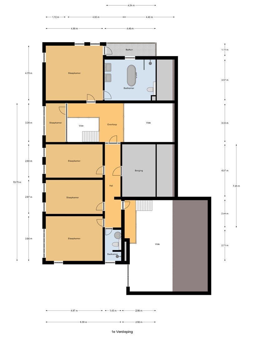 Via de trap bereikt u de vide, die een mooi overzicht biedt over de centrale leefruimte. Aan de linkerzijde bevindt zich een royale slaapkamer met balkon en een badkamer en suite. Deze badkamer is voorzien van vloerverwarming, een vrijstaand ligbad, een royale inloop regendouche, dubbele wastafels en een toilet. Vanaf de overloop zijn vier overige ruime slaapkamers bereikbaar. Aan het einde van de gang bevindt zich een tweede badkamer met inloopdouche, badmeubel en toilet. Tevens zijn er een bergruimte en een interne toegang tot het inpandige zwembad.