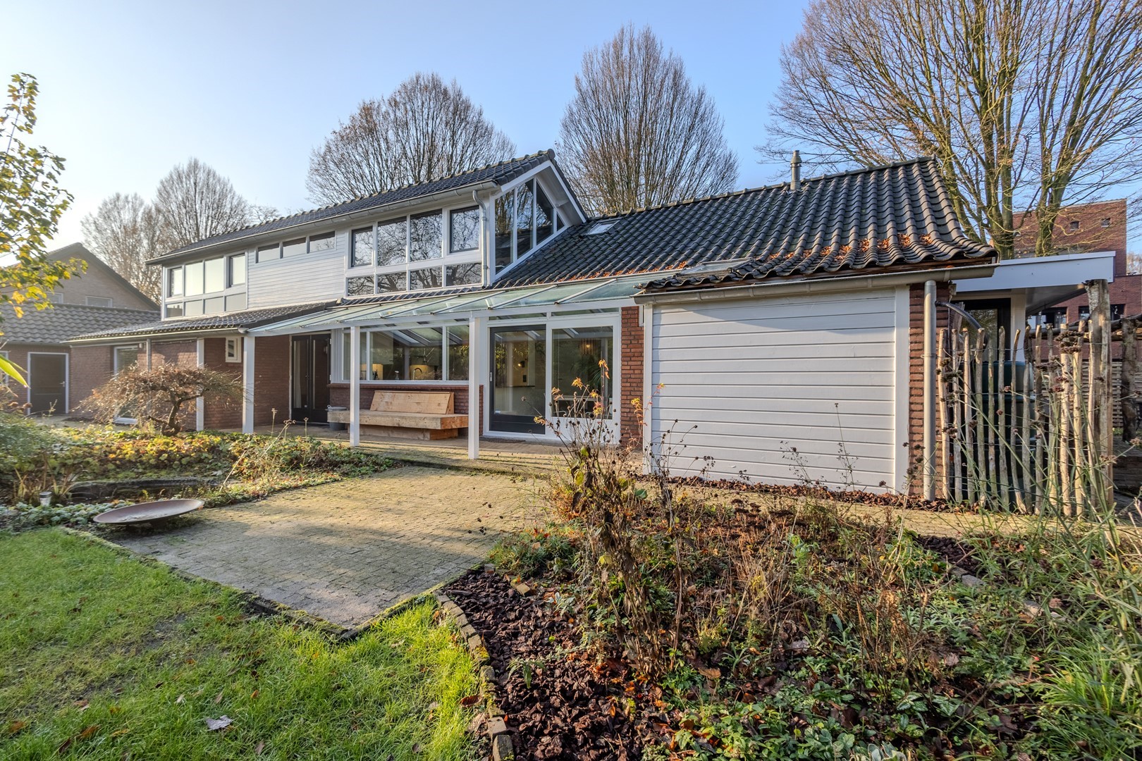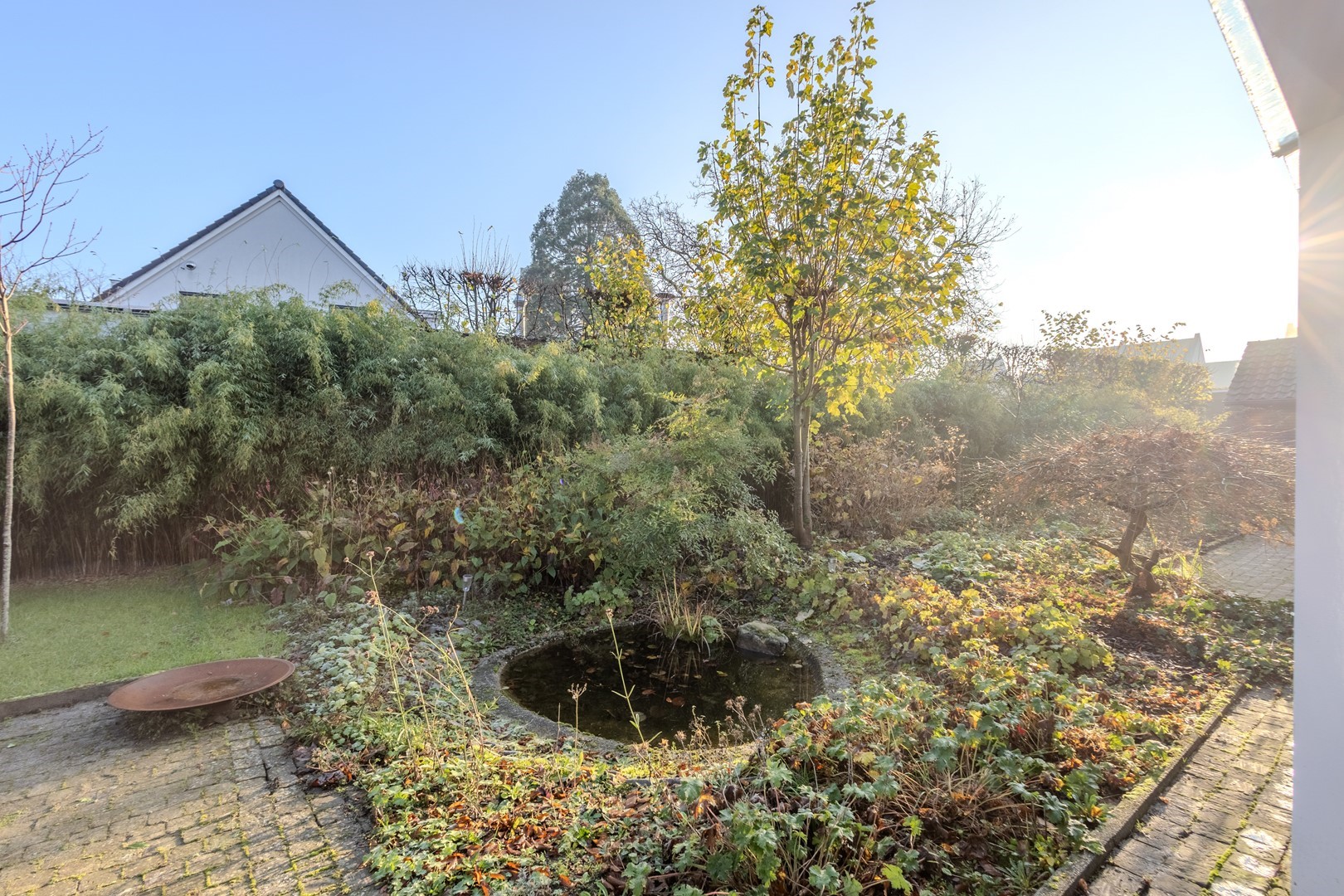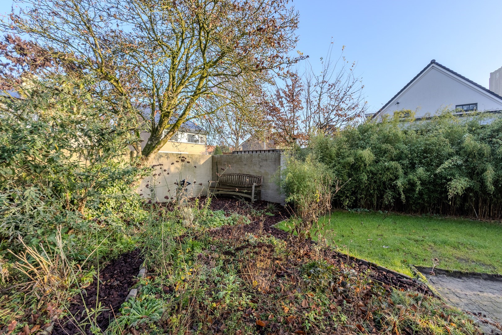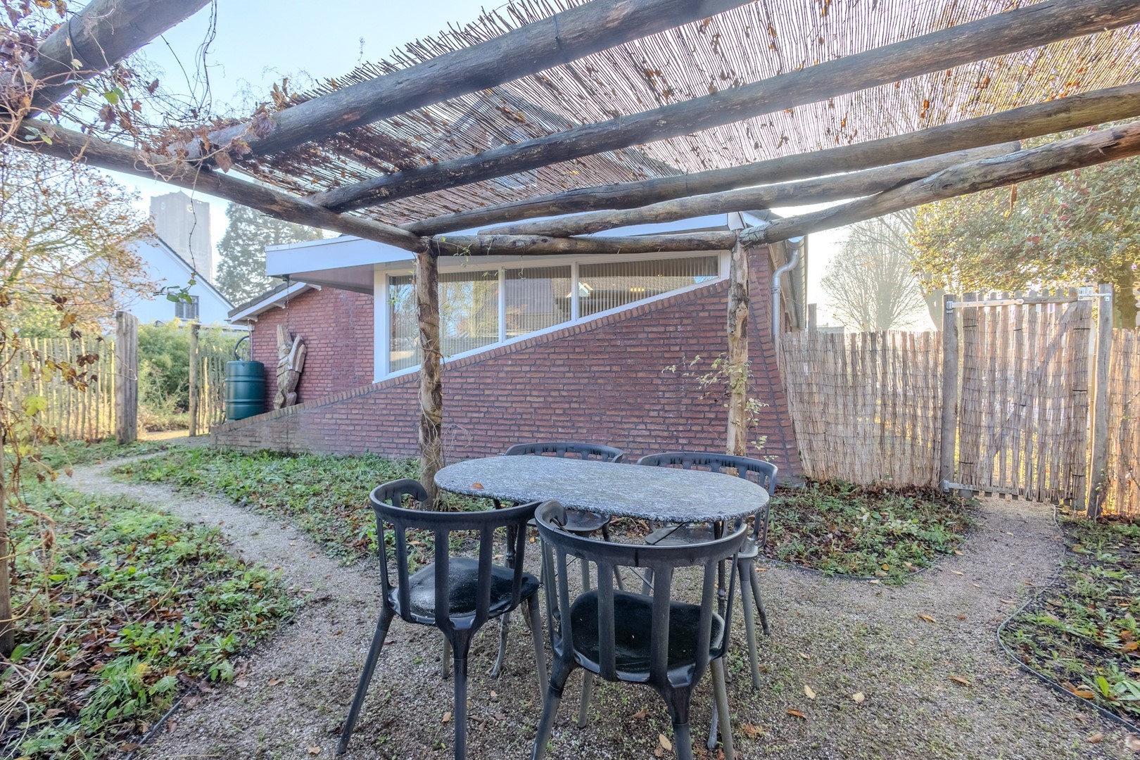 De achtertuin ligt op het oosten en is ingedeeld met een betegeld terras onder een glazen overkapping en een lager gelegen terras met grasstrook, groene borders en een vijverpartij. In de zijgevel van de zitkamer zijn openslaande deuren aangebracht die toegang geven tot het zijterras. Dit terras ligt op het zuid oosten en is daarmee een heerlijke plaats om te genieten van zowel de ochtend- als middagzon. De tuin is bereikbaar vanuit de woonkamer, de keuken, de grote slaapkamer op de begane grond en via een achterom. In 2024 is aan de west- en noordzijde een ecologische bloementuin aangelegd met daarin een wadi en kastanje houten pergola, poorten en hekwerk.