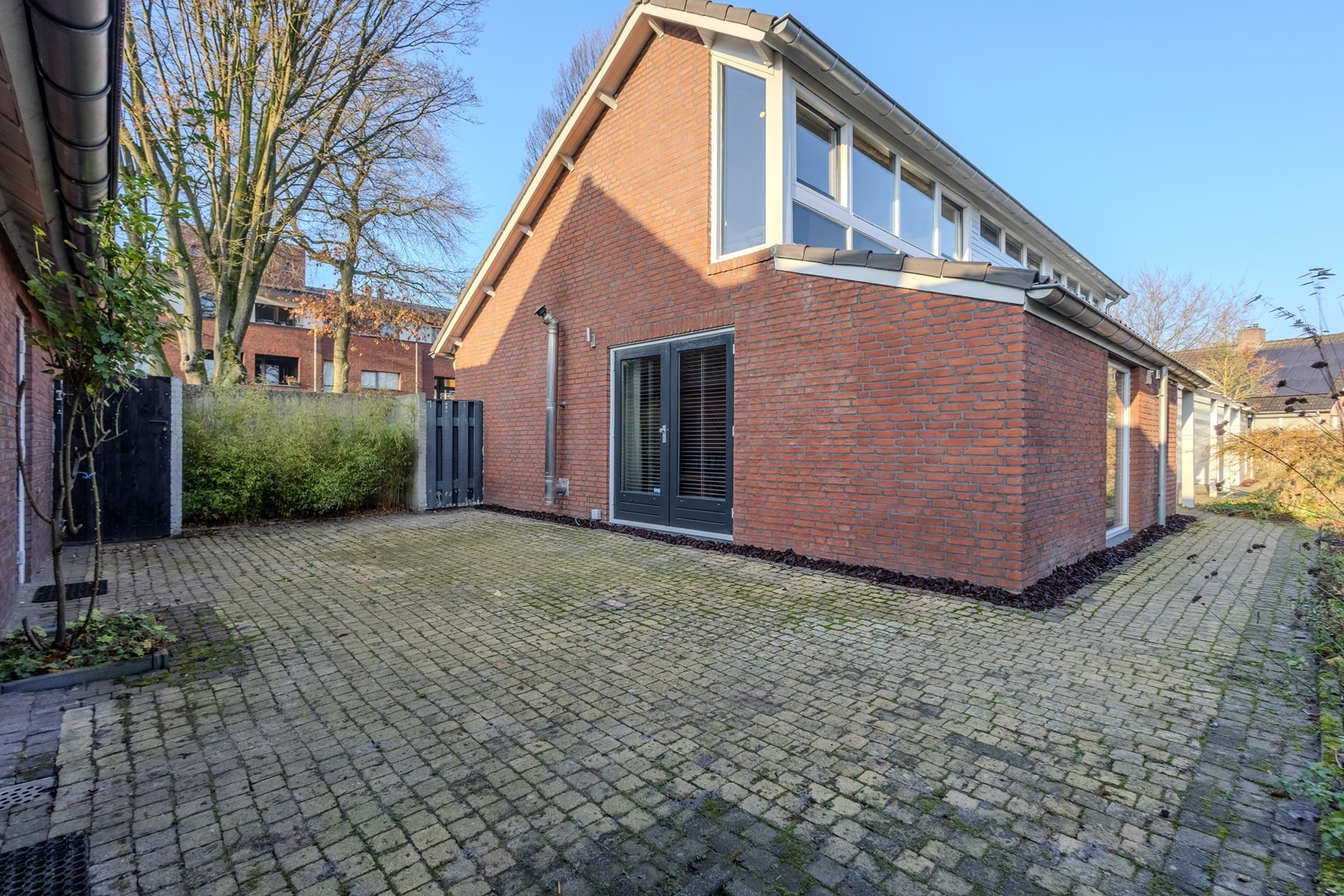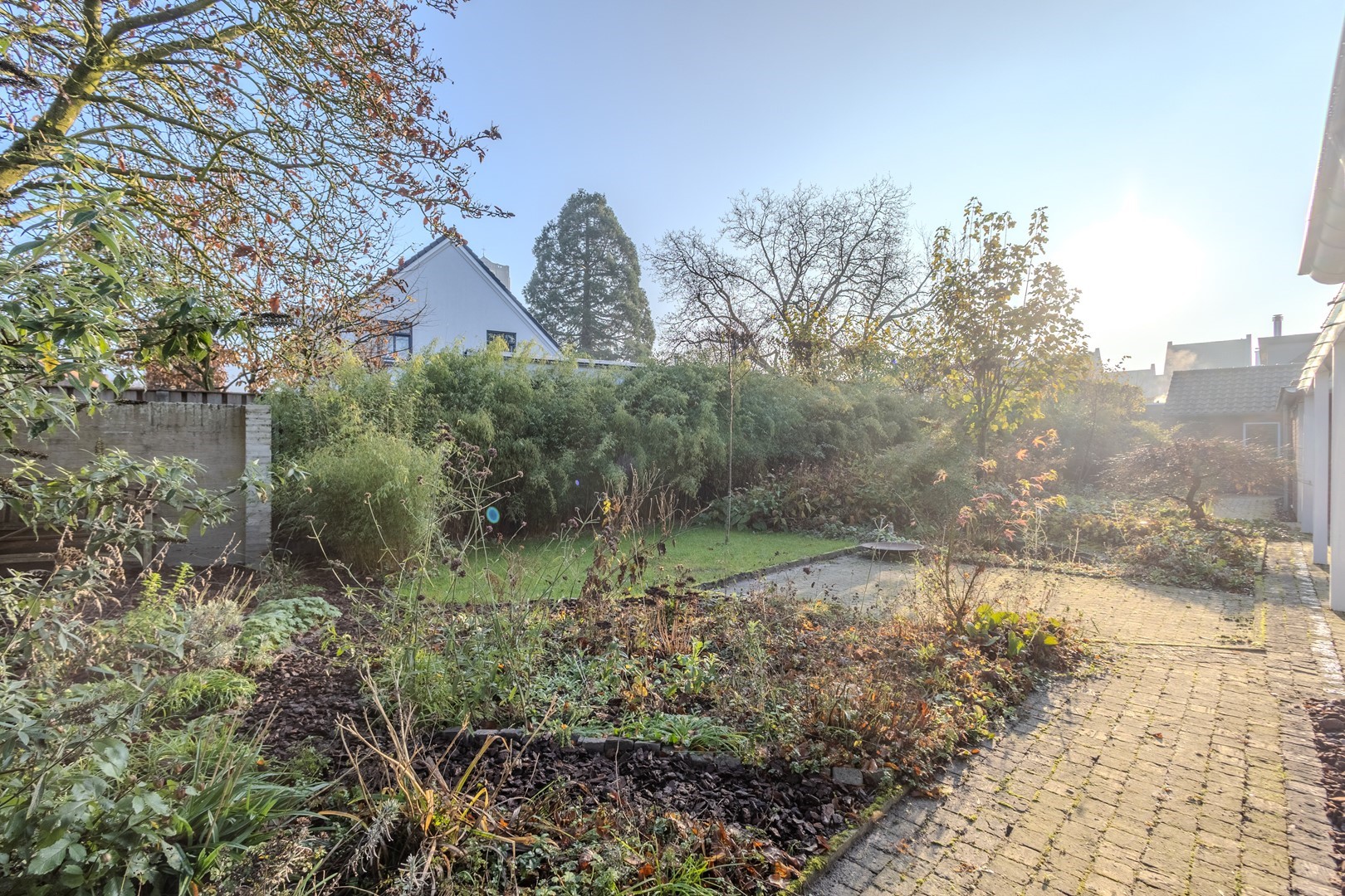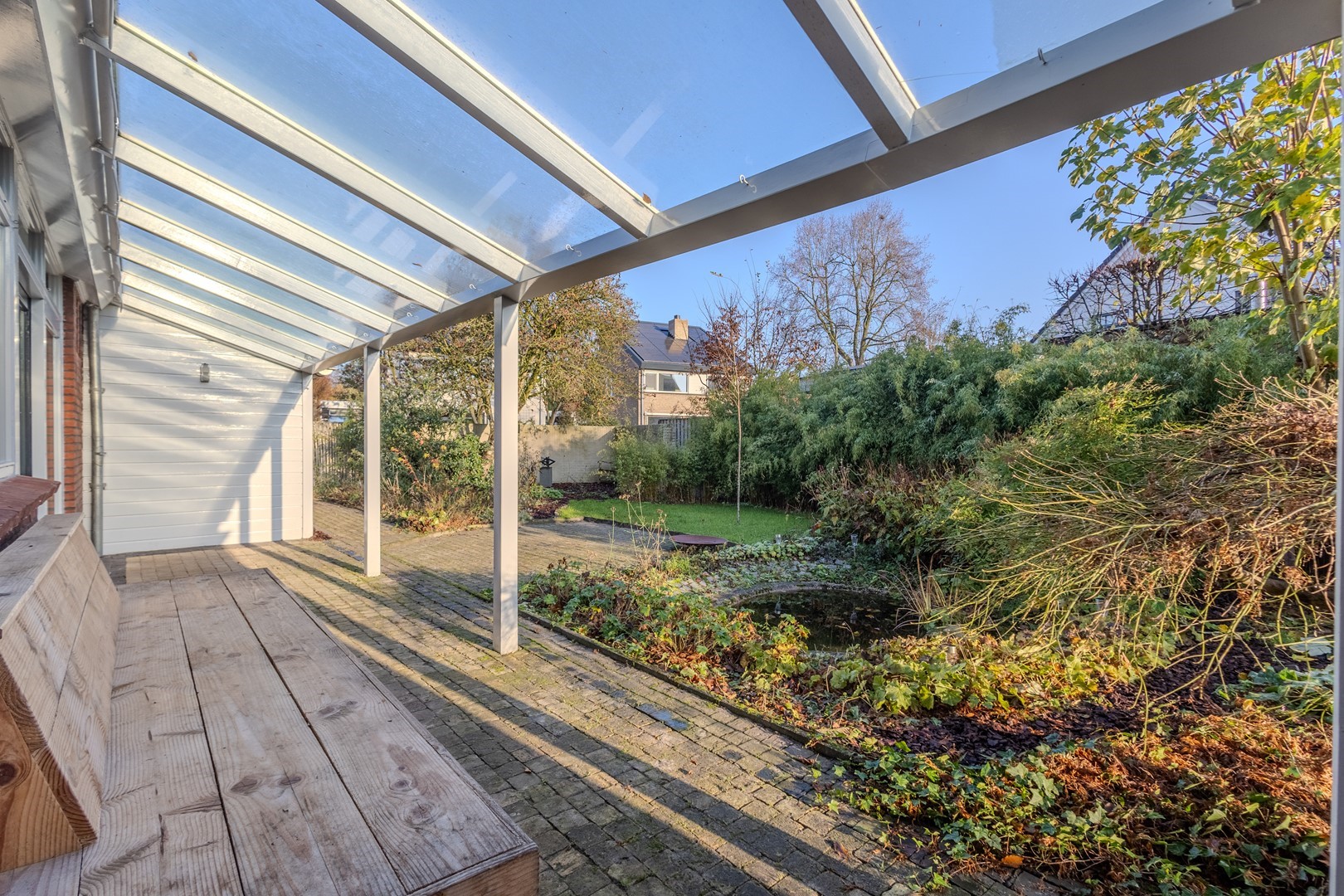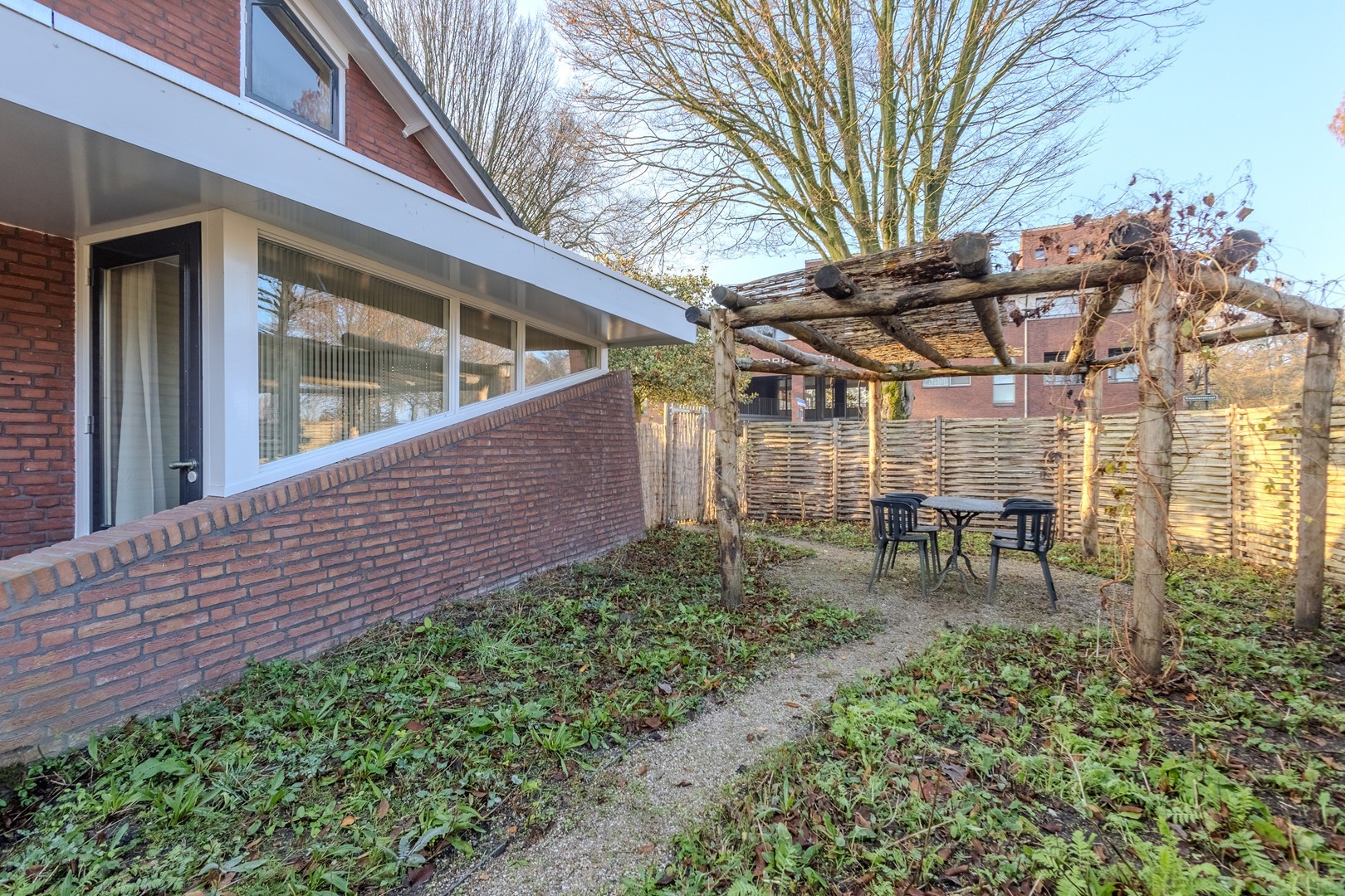 De achtertuin ligt op het oosten en is ingedeeld met een betegeld terras onder een glazen overkapping en een lager gelegen terras met grasstrook, groene borders en een vijverpartij. In de zijgevel van de zitkamer zijn openslaande deuren aangebracht die toegang geven tot het zijterras. Dit terras ligt op het zuid oosten en is daarmee een heerlijke plaats om te genieten van zowel de ochtend- als middagzon. De tuin is bereikbaar vanuit de woonkamer, de keuken, de grote slaapkamer op de begane grond en via een achterom. In 2024 is aan de west- en noordzijde een ecologische bloementuin aangelegd met daarin een wadi en kastanje houten pergola, poorten en hekwerk.