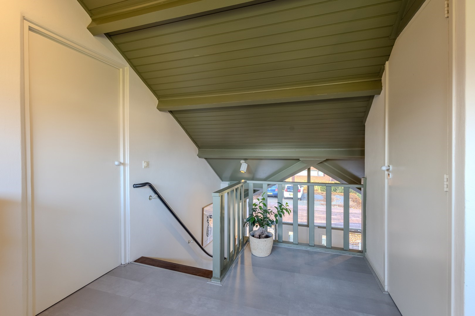 De verdieping biedt een ruime overloop. De vide maakt een prettige connectie tussen de twee verdiepingen. Aansluitend aan de overloop bevindt zich een separaat toilet, en twee slaapkamers. Deze beide kamers hebben speelse raampartijen die voor een mooie lichtinval zorgen. De slaapkamer aan de rechterzijde beschikt tevens over een praktische inbouwkast met een wastafel. De gehele verdieping is afgewerkt met dezelfde moderne laminaat vloer als op de begane grond, wat de verdiepingen tot een eenheid maakt.