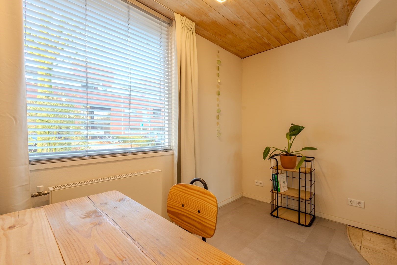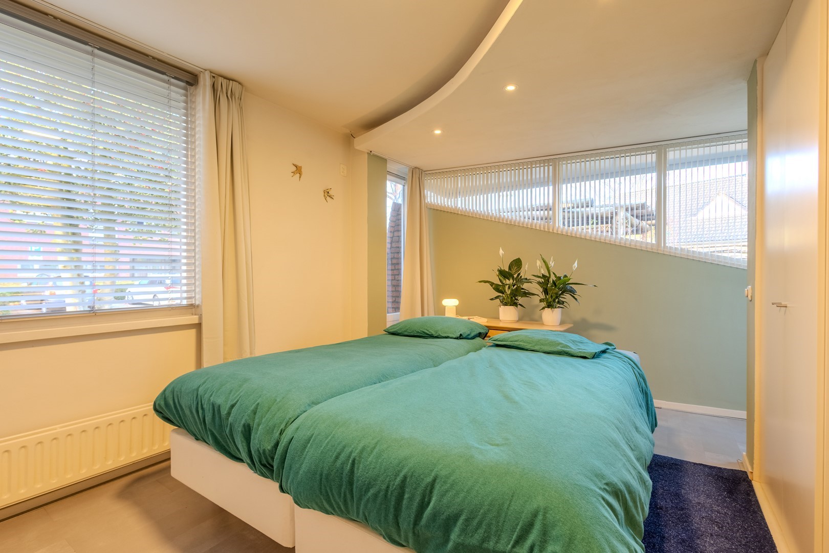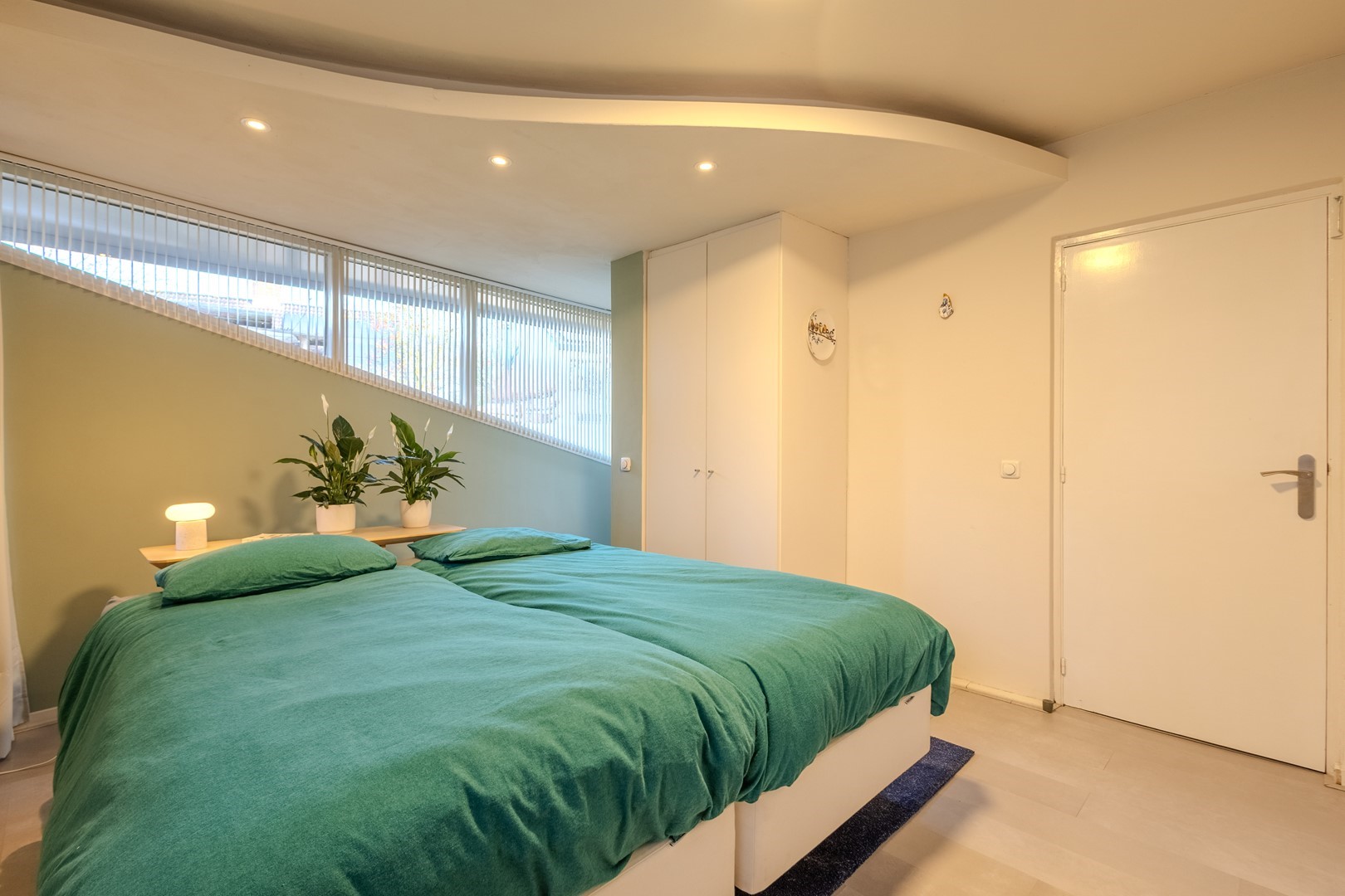 Aan de linkerzijde van de woning bevindt zich nog een derde slaapkamer met de naastgelegen badkamer op de begane grond. Vanuit de slaapkamer heeft u direct toegang tot de achtertuin via een loopdeur. Het mooie plafonddetail met ingebouwde spotjes geeft de slaapkamer een unieke sfeer. Alle slaapkamers zijn voorzien van een moderne laminaatvloer.