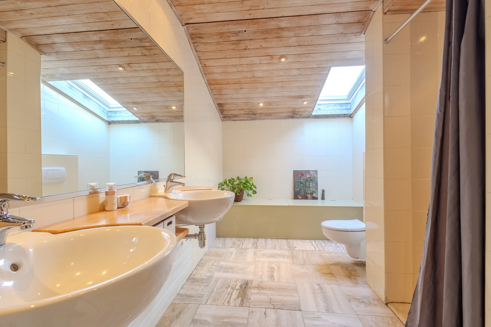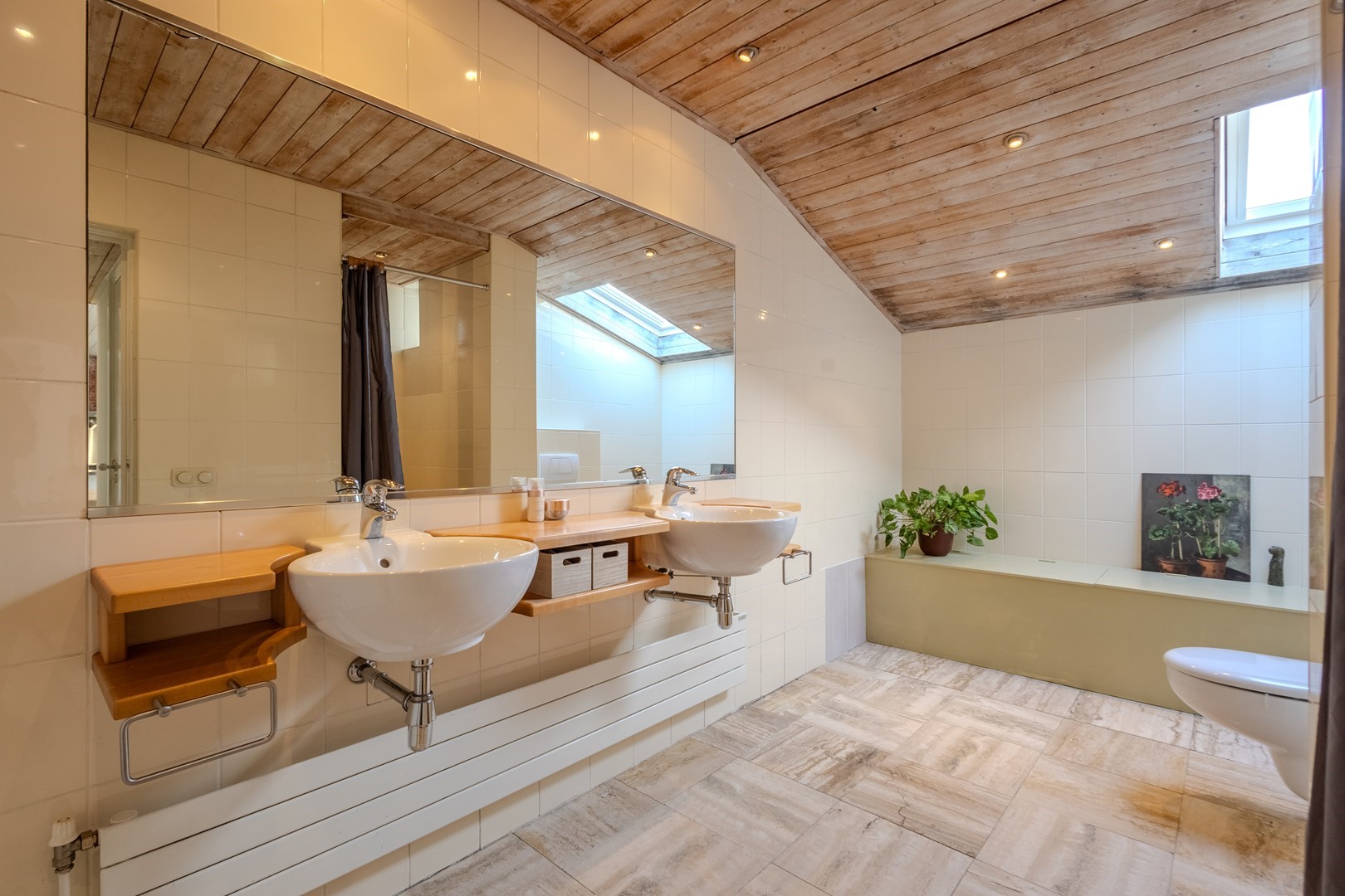 Tegenover de slaapkamer ligt de badkamer. Deze volledig betegelde badkamer is rond 2000 uitgebouwd en uitgerust met een inloopdouche, grote spiegel, dubbele wastafel, toilet en mechanische ventilatie. Het dakraam zorgt hier voor voldoende lichtinval en voor privacy.