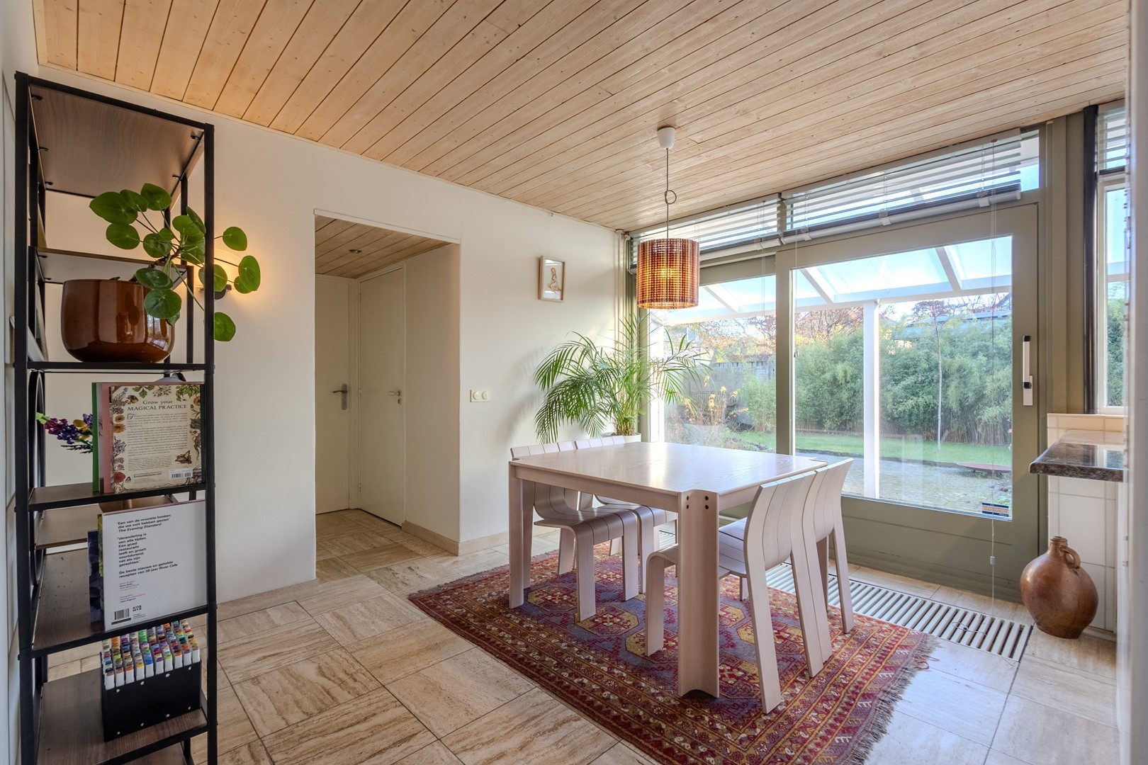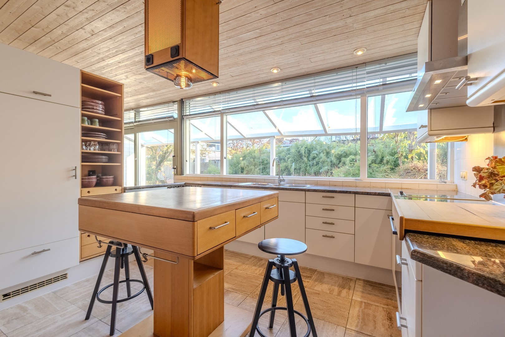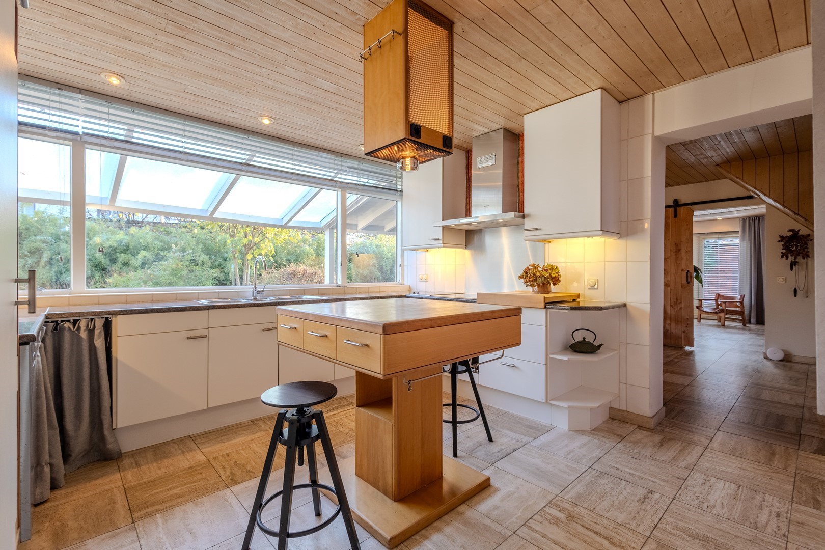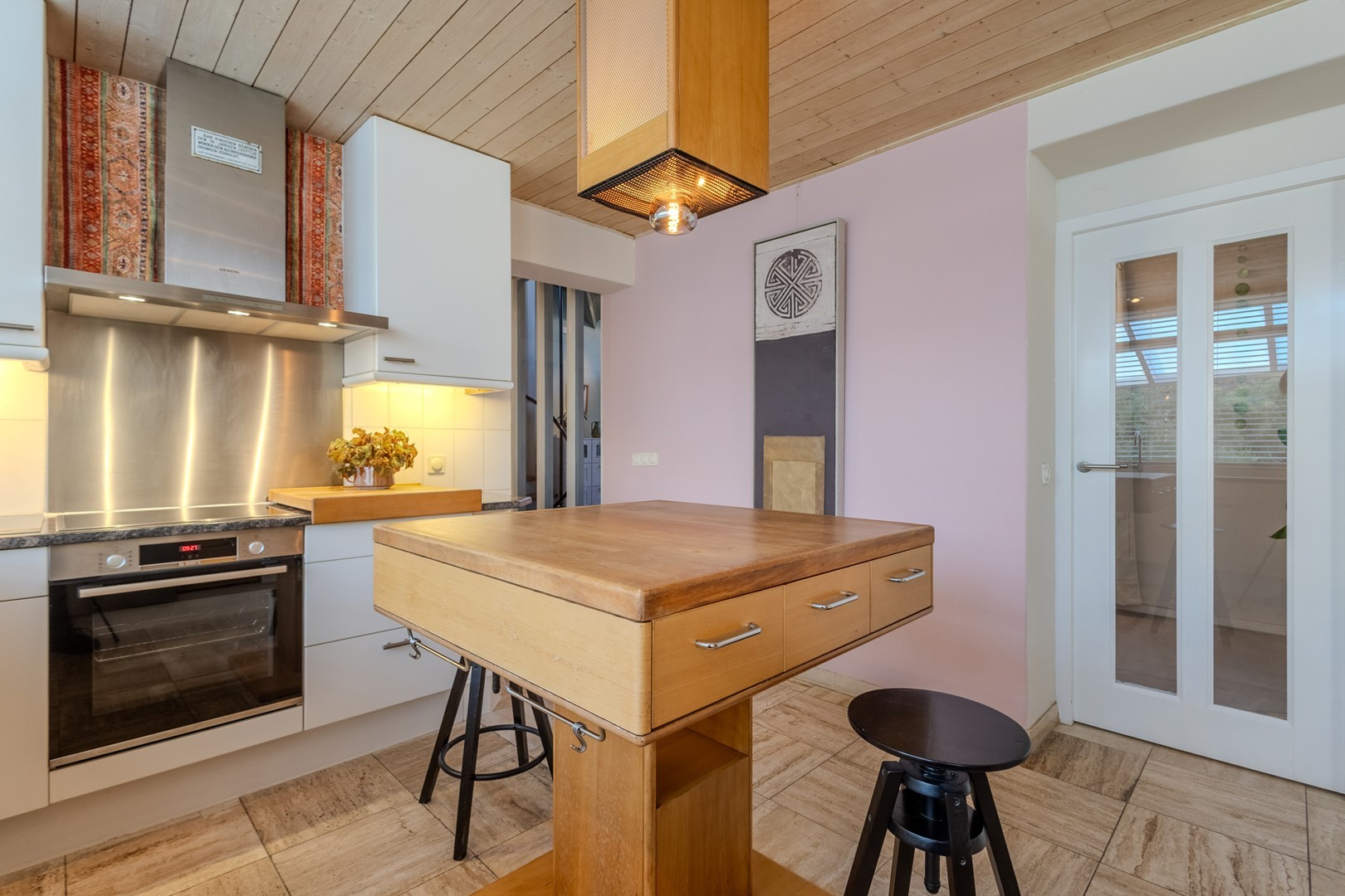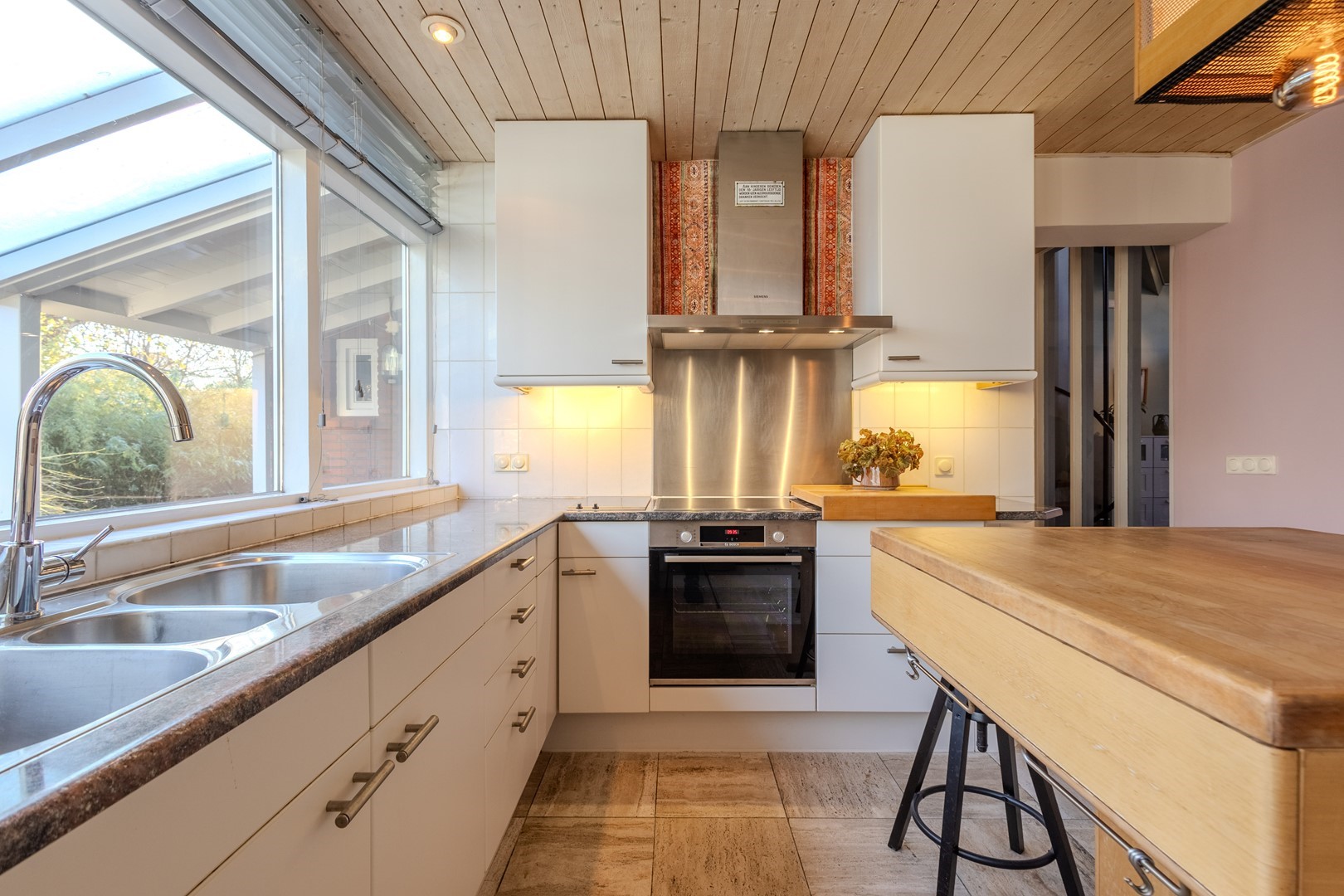 Aan de linkerzijde van de entree bevindt zich de leefkeuken, met aangebouwde glazen overkapping. De keuken is opgesteld in een praktische U-vorm met tusseneiland en heeft uitkijk op de tuinzijde. De marmeren aanrechtbladen geven de ruimte extra allure. De inbouwapparatuur bestaat uit een inductiekookplaat met afzuigkap, een koelkast, oven, vaatwasser en een dubbele spoelbak. De keuken biedt tevens genoeg ruimte voor de eettafel.
