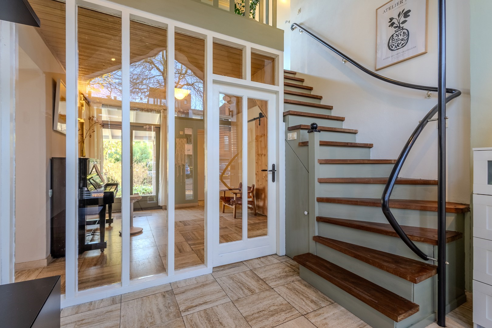 Binnenkomst in de ruime entree met garderobe en stijlvolle trapopgang naar de eerste verdieping. Via de imposante glazen wand met loopdeur bereikt u de hal. Aan de achterzijde bevindt zich het separate toilet met fonteintje. Rechts ligt de zitkamer – een bijzonder lichte en prettige ruimte waar u een sfeervolle zithoek kunt creëren om heerlijk tot rust te komen. De duurzame pelletkachel zorgt hier voor een extra behaaglijke sfeer. De begane grond is voorzien van een travertin tegelvloer in de entree, hal, zitkamer, badkamer en keuken, en afgewerkt met stijlvolle houten plafonddetails en spotjes.