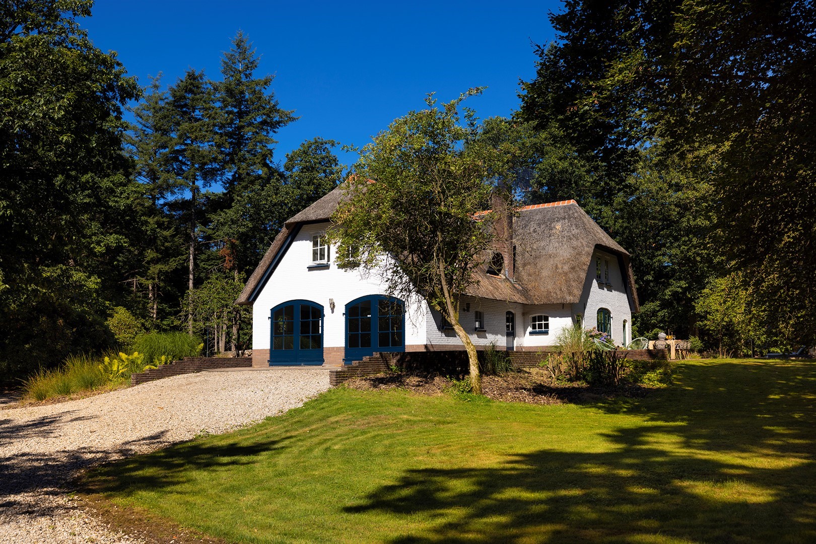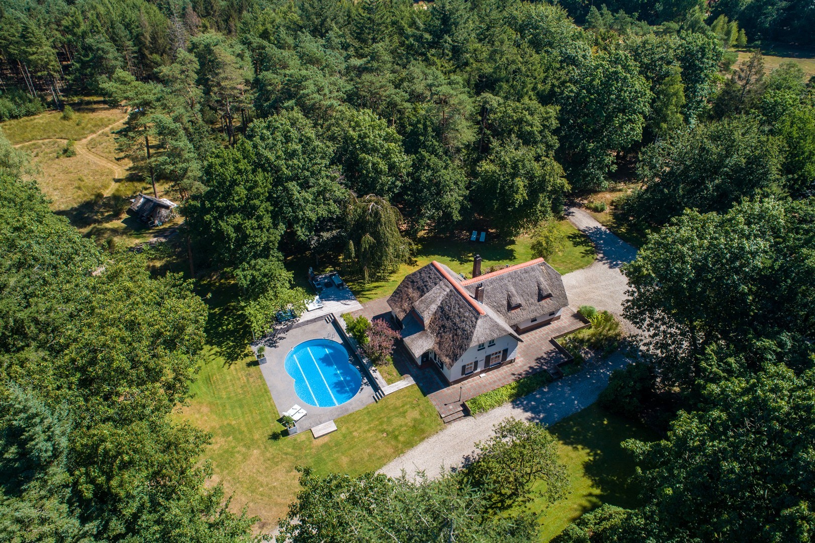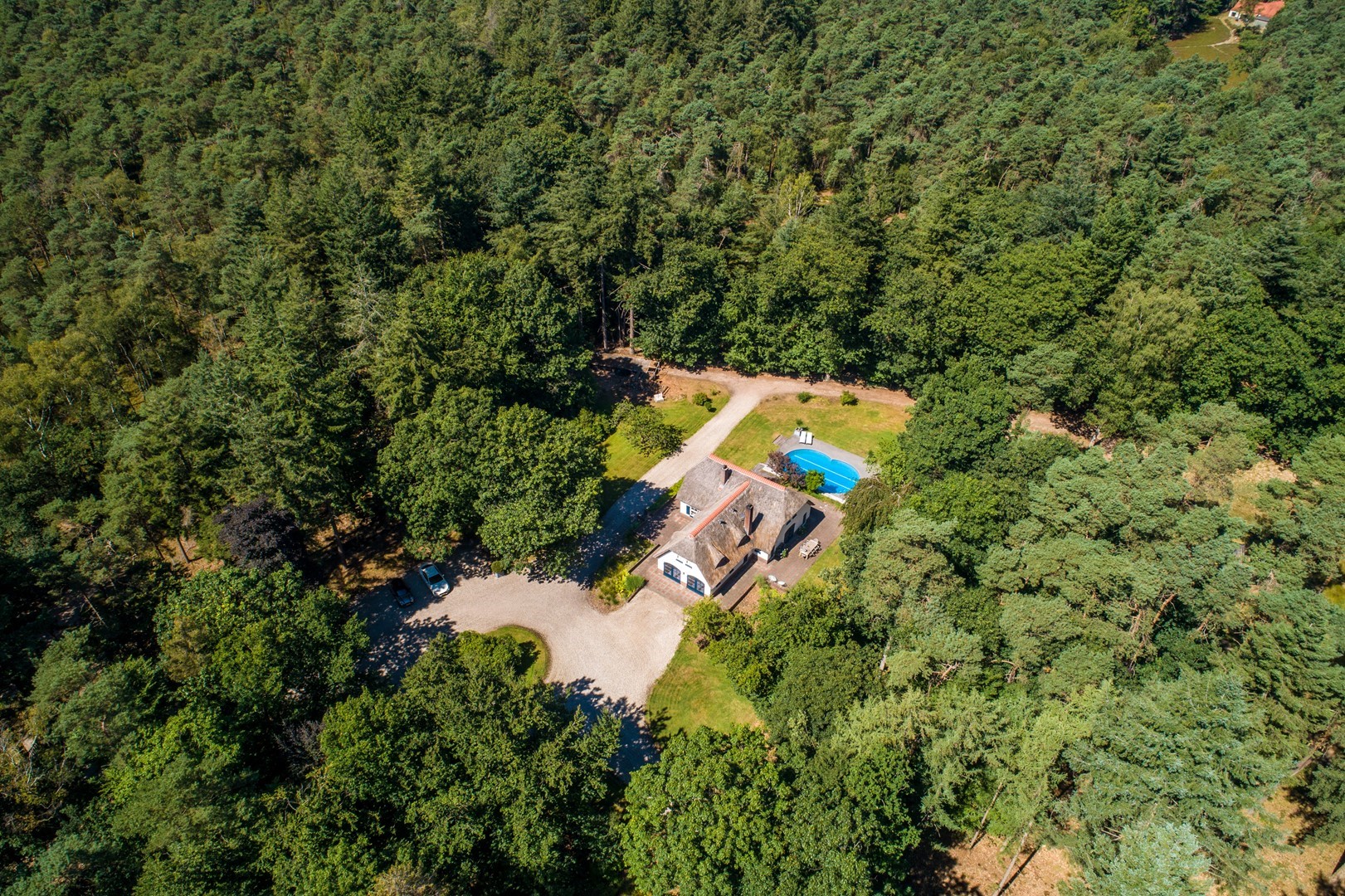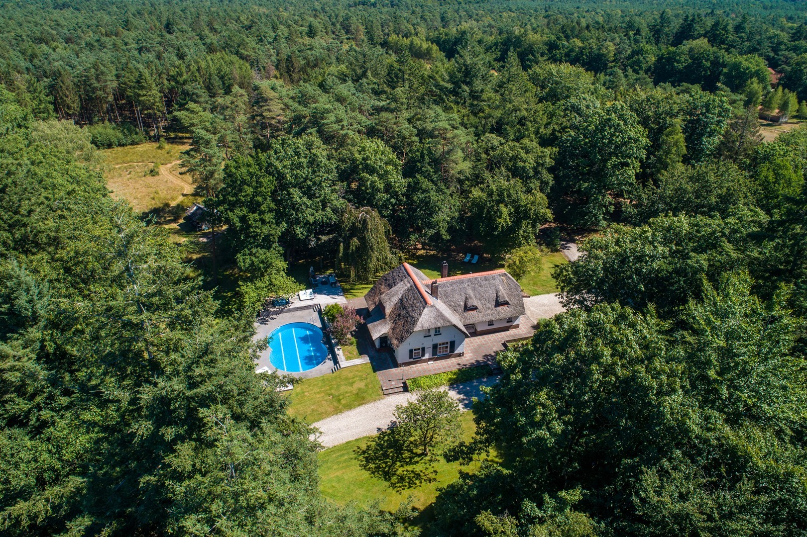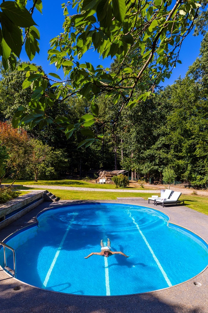 Midden in de natuur, via een verstillend pad met elektrische toegangspoort, bereikt u dit stijlvolle, rietgedekte landhuis “Boschhoeve”. Een veilige thuishaven vol rust en privacy… wakker worden in het bos, begeleid door het concert van vogels die alweer een nieuwe dag aankondigen. Het klinkt alsof u droomt, maar dit is het standaard ochtendritueel aan de Lichttorenweg 12, iedere dag opnieuw. Tijdens een wandeling over uw eigen perceel met bos en tuin van ruim 35.000 m² zult u absoluut een paradijselijke gevoel ervaren! Zelfs aan de achterzijde van uw perceel is een extra uitgang aan de Jachtlustweg. Van de morgen tot de avond, het gehele jaar door, laat deze omgeving u telkens weer het ultieme buitenleven ervaren.