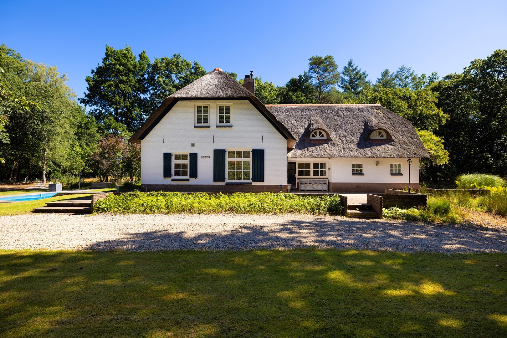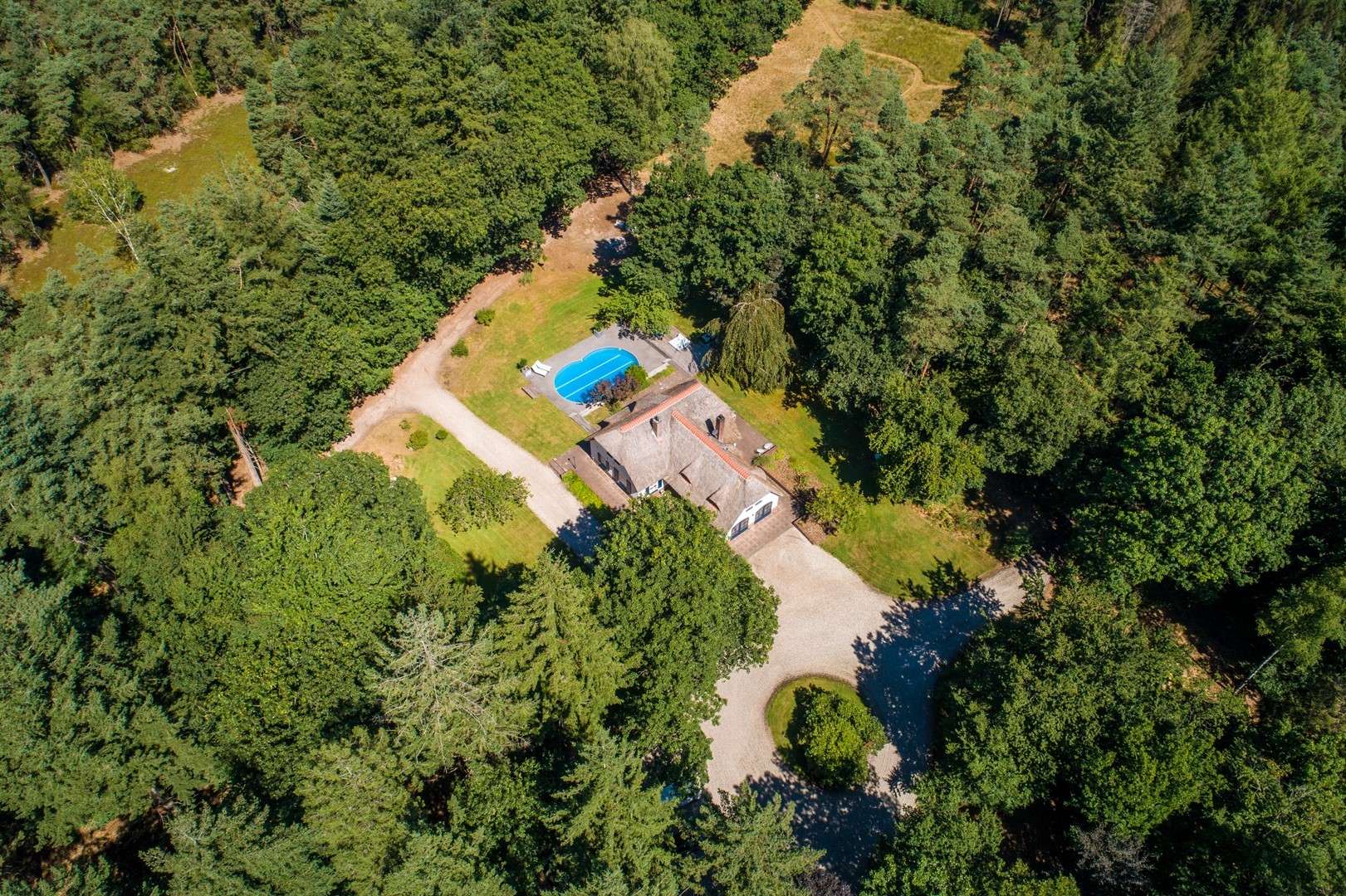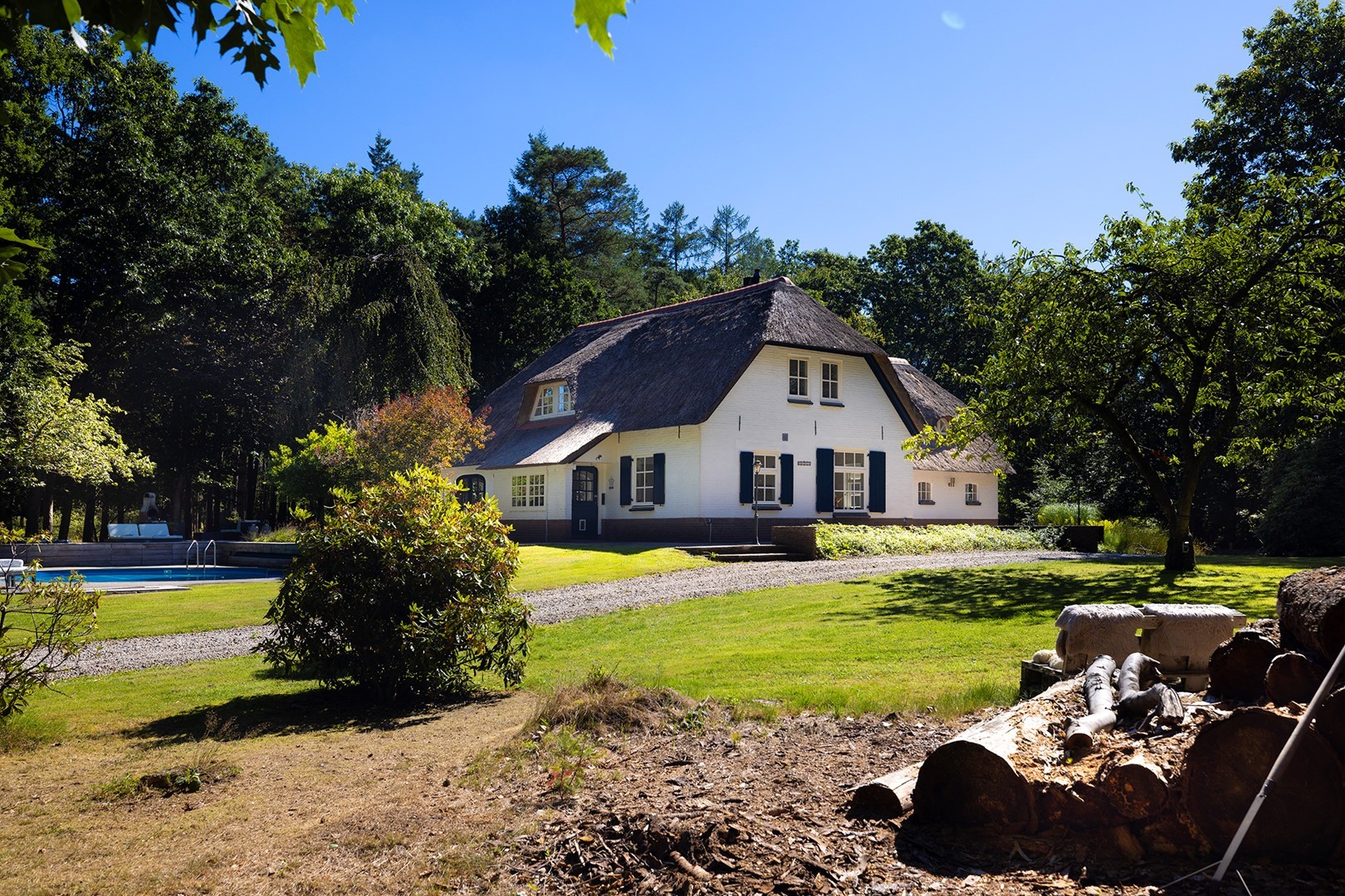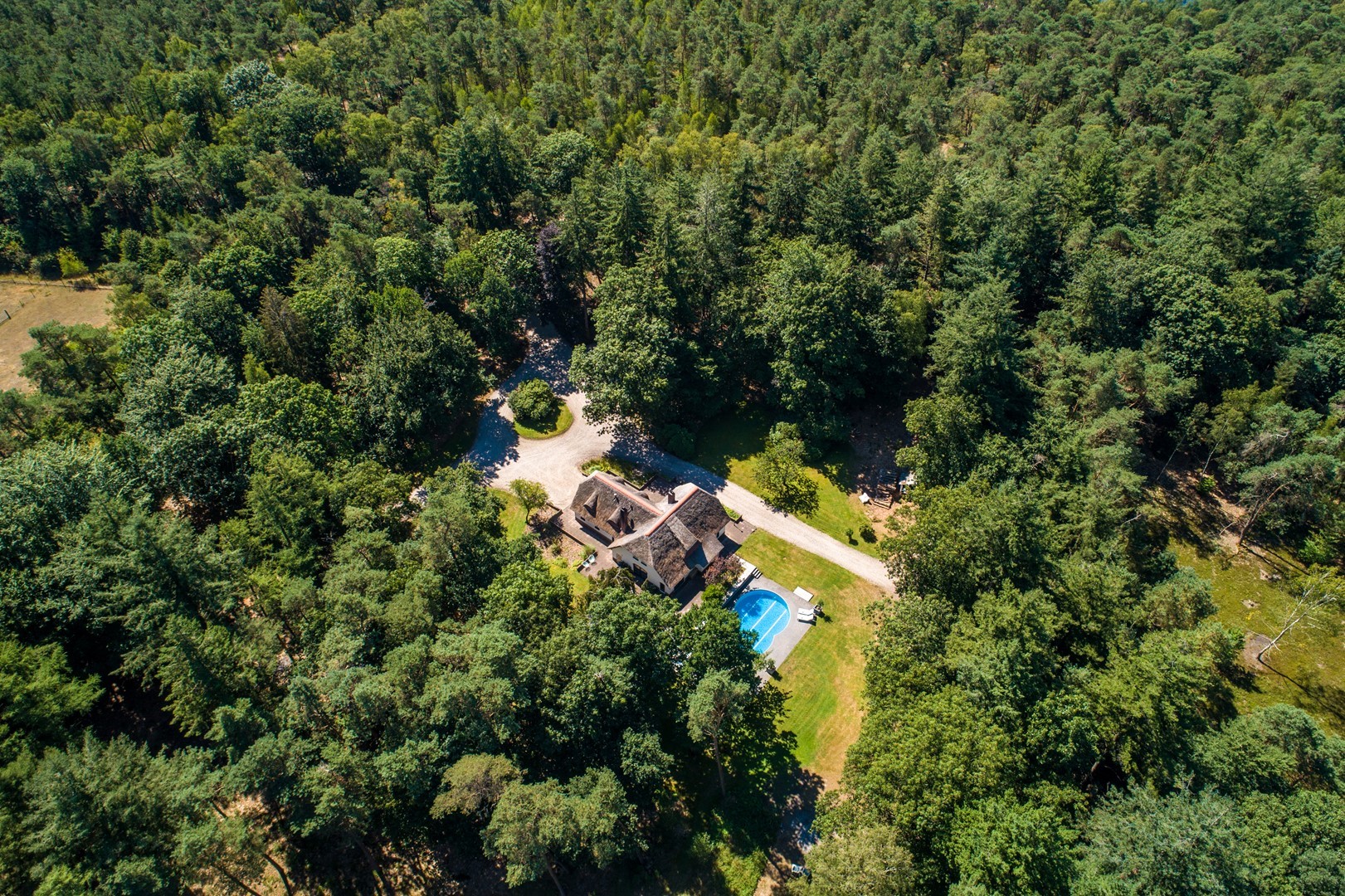 Midden in de natuur, via een verstillend pad met elektrische toegangspoort, bereikt u dit stijlvolle, rietgedekte landhuis “Boschhoeve”. Een veilige thuishaven vol rust en privacy… wakker worden in het bos, begeleid door het concert van vogels die alweer een nieuwe dag aankondigen. Het klinkt alsof u droomt, maar dit is het standaard ochtendritueel aan de Lichttorenweg 12, iedere dag opnieuw. Tijdens een wandeling over uw eigen perceel met bos en tuin van ruim 35.000 m² zult u absoluut een paradijselijke gevoel ervaren! Zelfs aan de achterzijde van uw perceel is een extra uitgang aan de Jachtlustweg. Van de morgen tot de avond, het gehele jaar door, laat deze omgeving u telkens weer het ultieme buitenleven ervaren.